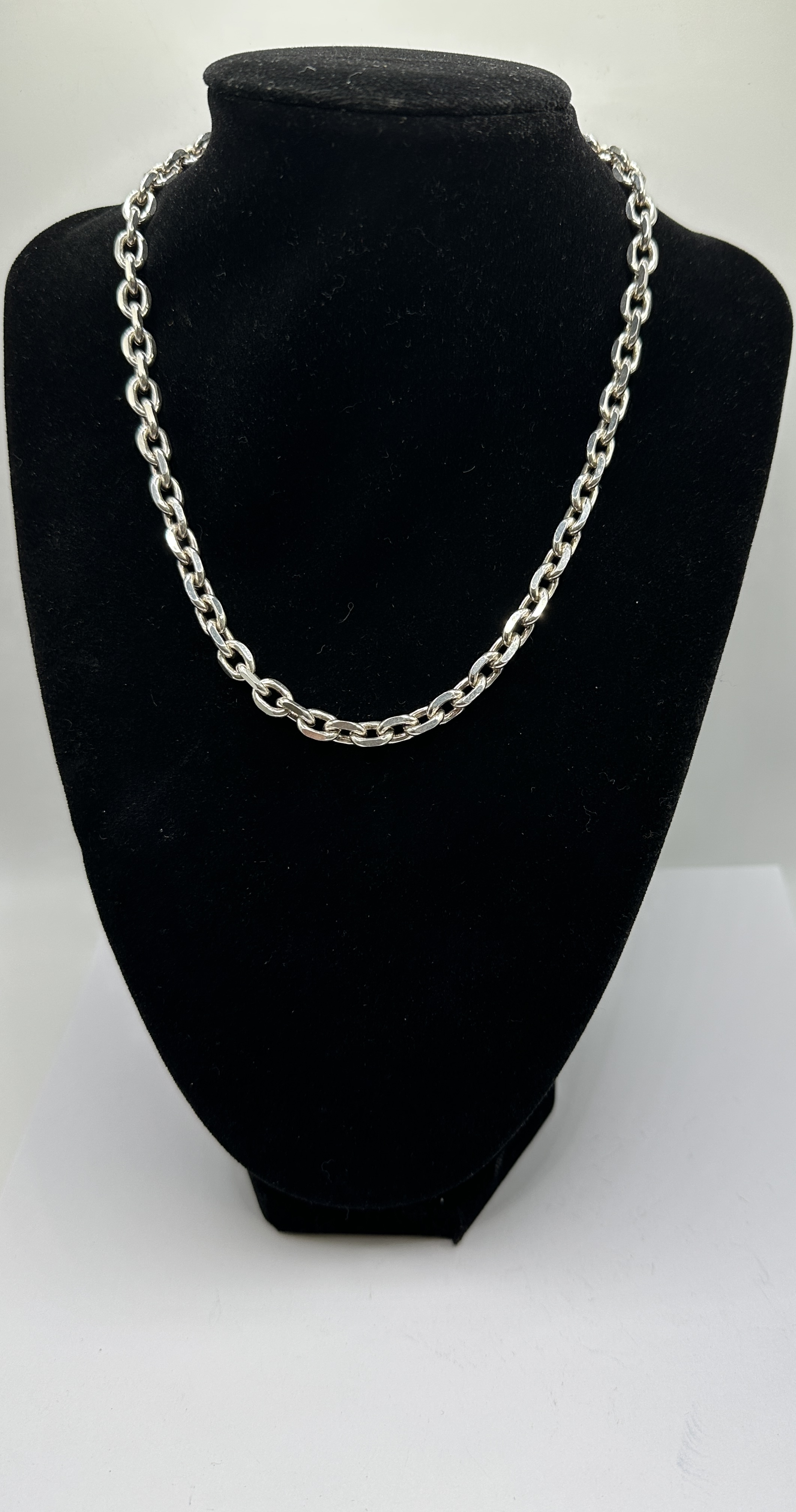 The necklace is in good condition with a bright polished finish. There are no visible broken links or significant signs of wear. The clasp is in good working order.