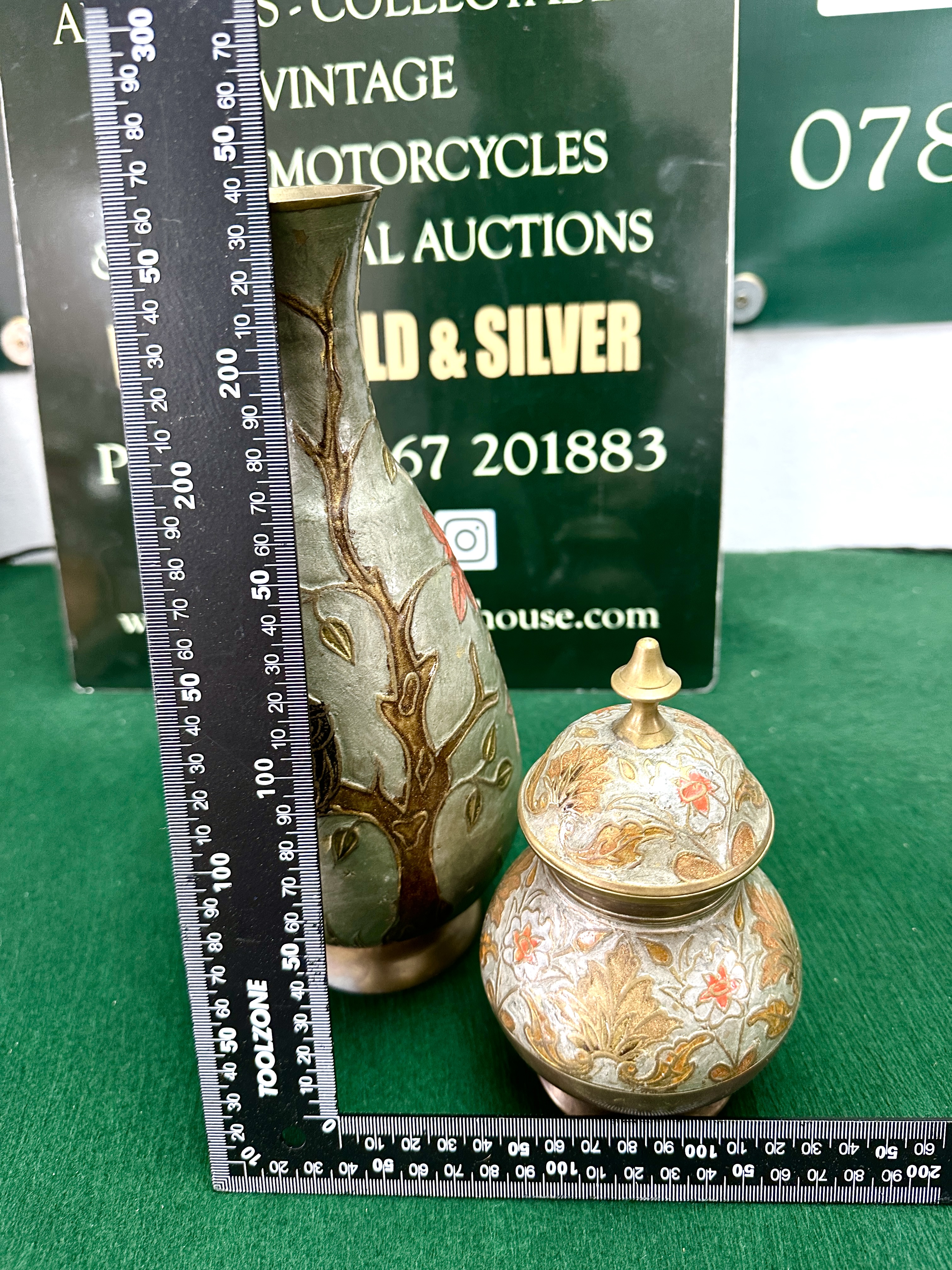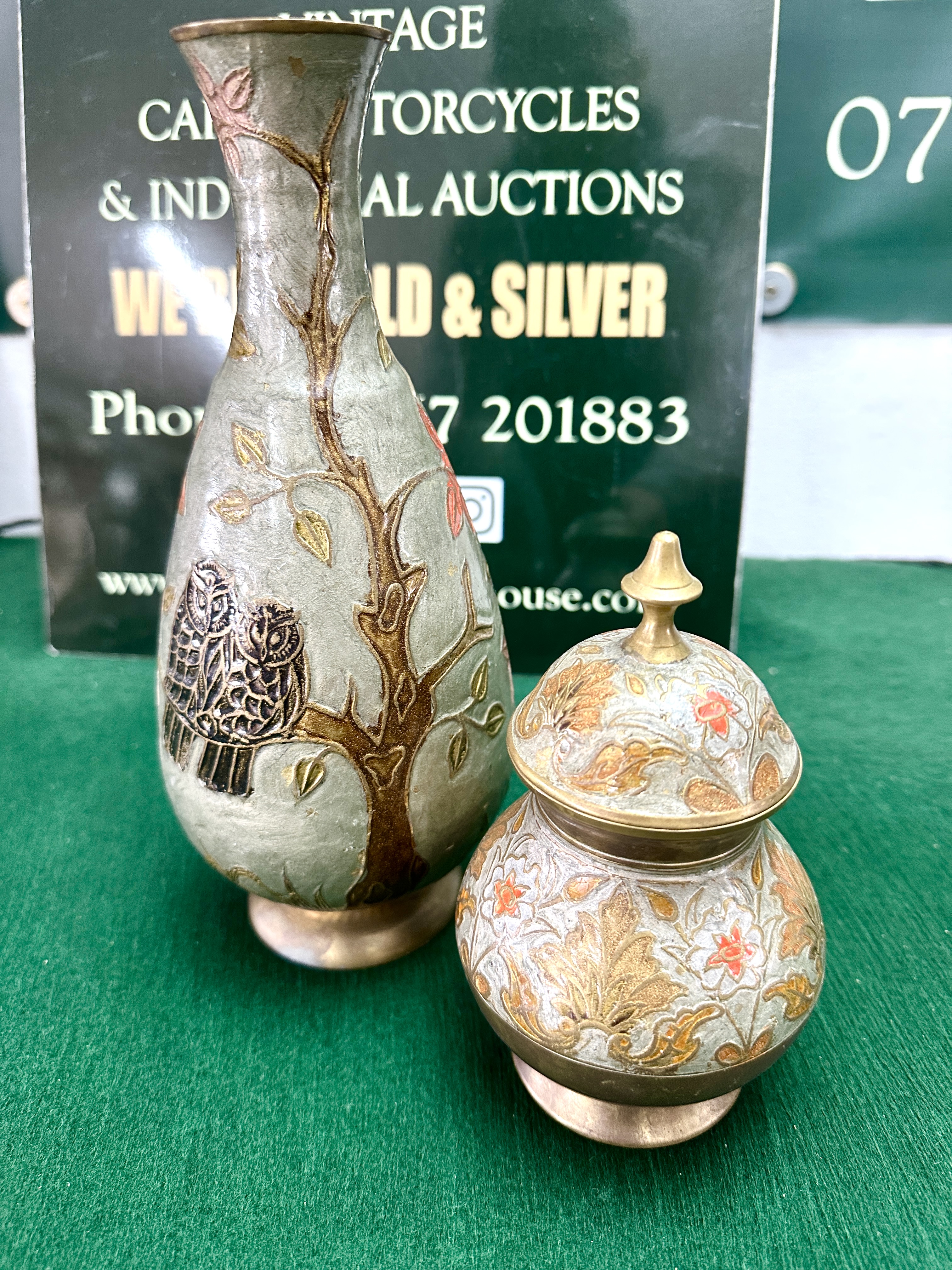 A two-piece lot of decorative enamelled brassware, in the style of mid-20th century Indian export ware from regions such as Moradabad or Jaipur. Both items are constructed from cast brass with decoration achieved through an etching process, with the recessed areas filled with coloured enamels in the champlevé technique. The lot includes a tapered bottle-form bud vase with a flared rim, featuring an etched design of an owl perched on a tree branch against a textured, pale grey-green enamel ground. The second item is a small globular jar with a fitted domed lid and a pointed brass finial, decorated with an intricate foliate and floral pattern in shades of gold, white, and orange. The exposed brass surfaces at the rims, finial, and bases exhibit a natural dull-gold patina. No maker marks, characters, or symbols are visible on the bases or bodies of either piece.