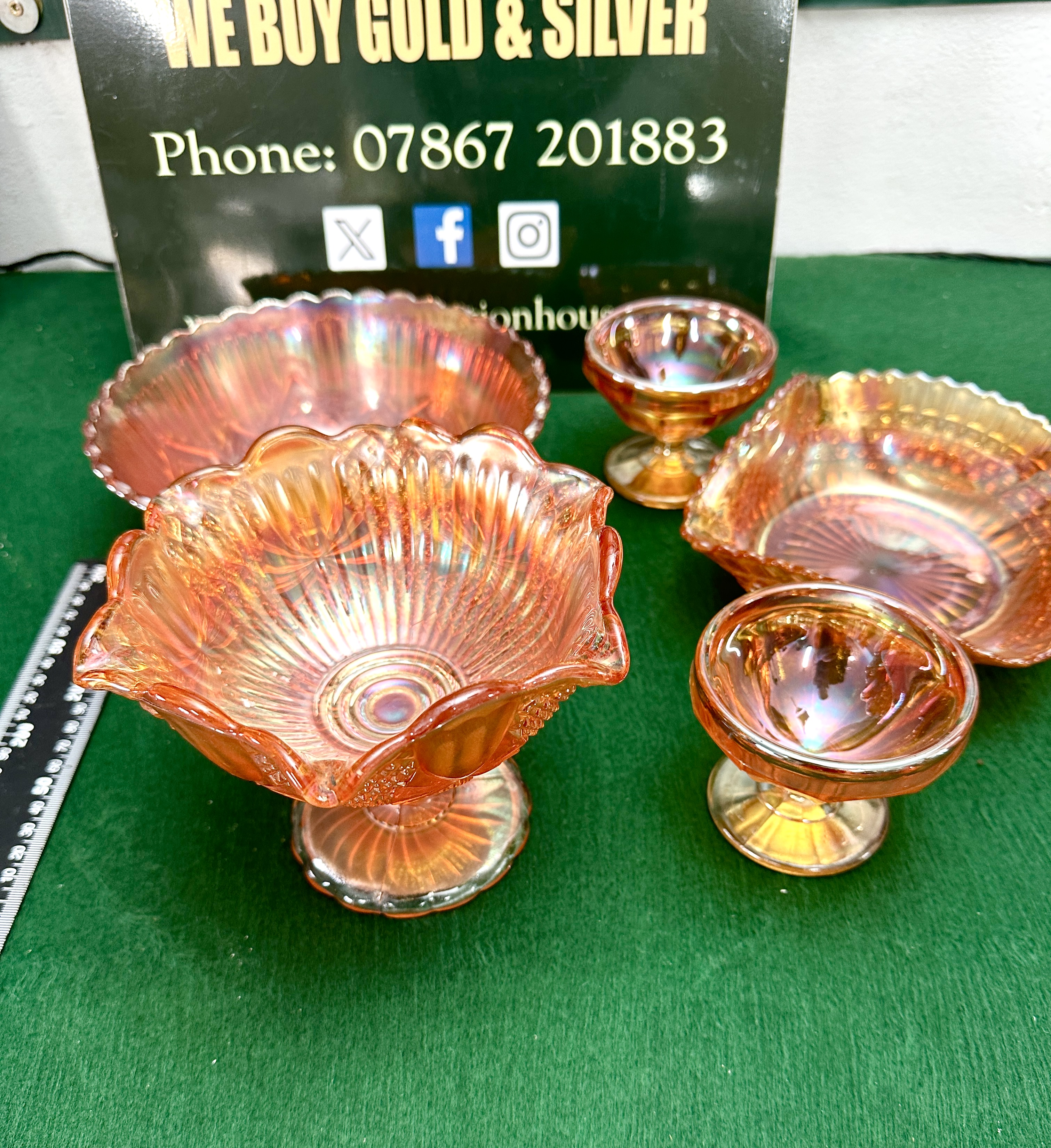 A collection of marigold carnival glass comprising various forms of iridescent pressed glass. The group includes a large footed compote featuring a deeply ruffled and scalloped rim with internal vertical ribbing and a textured exterior on a flared ribbed foot. Also included is a circular bowl with a crimped and scalloped rim and a central sunburst motif, a square-form dish with a scalloped rim and geometric starburst pattern, and two matching small footed dishes with ribbed stems and bases. The glass features a characteristic orange-amber base with a rainbow-hued iridescent lustre. These pieces are characteristic of early 20th-century production and resemble patterns produced by manufacturers such as Imperial Glass, Sowerby, and Brockwitz. No maker marks are present.