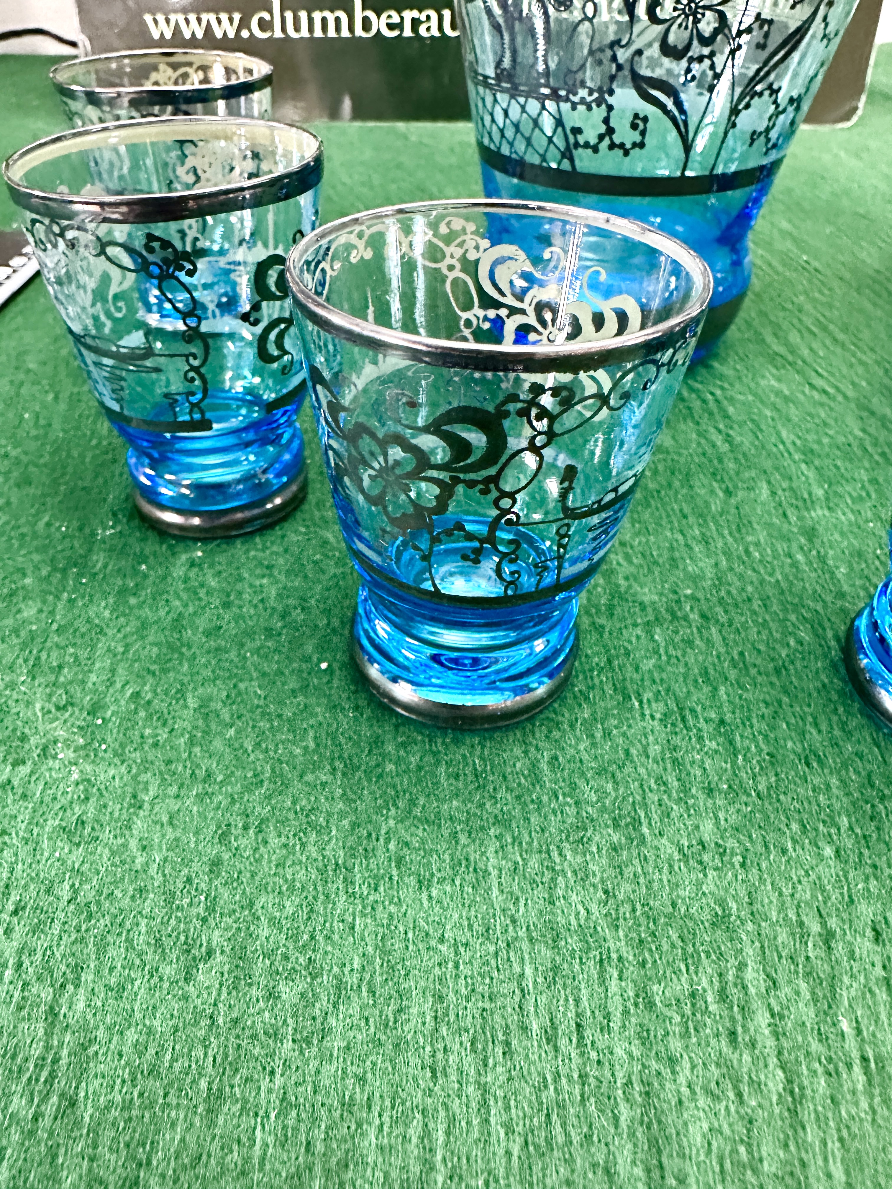 A mid-20th century glass decanter set attributed to Murano, Italy, comprising a decanter with stopper and six matching liqueur glasses. The set is constructed from transparent turquoise-blue glass decorated with silver overlay, also known as silver deposit. The decanter features a tapered body with a thickened base and a silver-toned collar, decorated with stylised floral motifs, scrolling foliage, and a bird. It is complete with a matching blue glass stopper featuring a pointed finial and silver-toned band. The six glasses are of flared bucket form with weighted footed bases and silver-toned rims, displaying corresponding silver patterns.