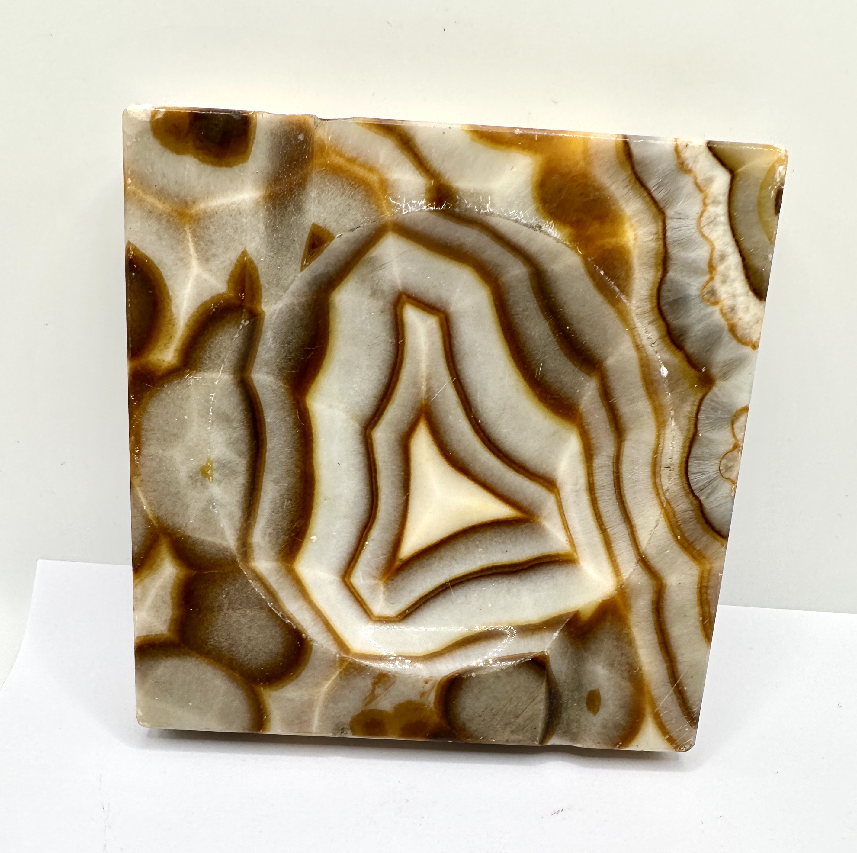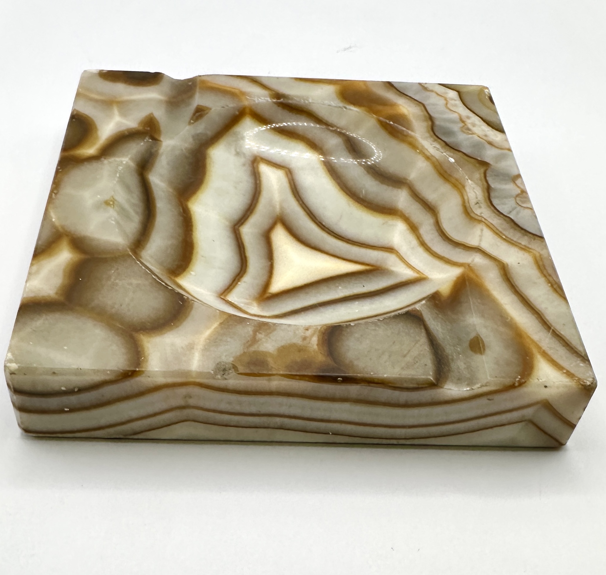 A mid-century square-form ashtray carved from a solid block of banded onyx. The stone displays natural translucent cream, honey, and amber-toned wavy and concentric figure throughout. The design features a shallow circular centre well with four integral rests carved into the corners. The stone has been polished to a smooth finish to highlight the natural geological patterns. No maker’s marks or signatures are present.