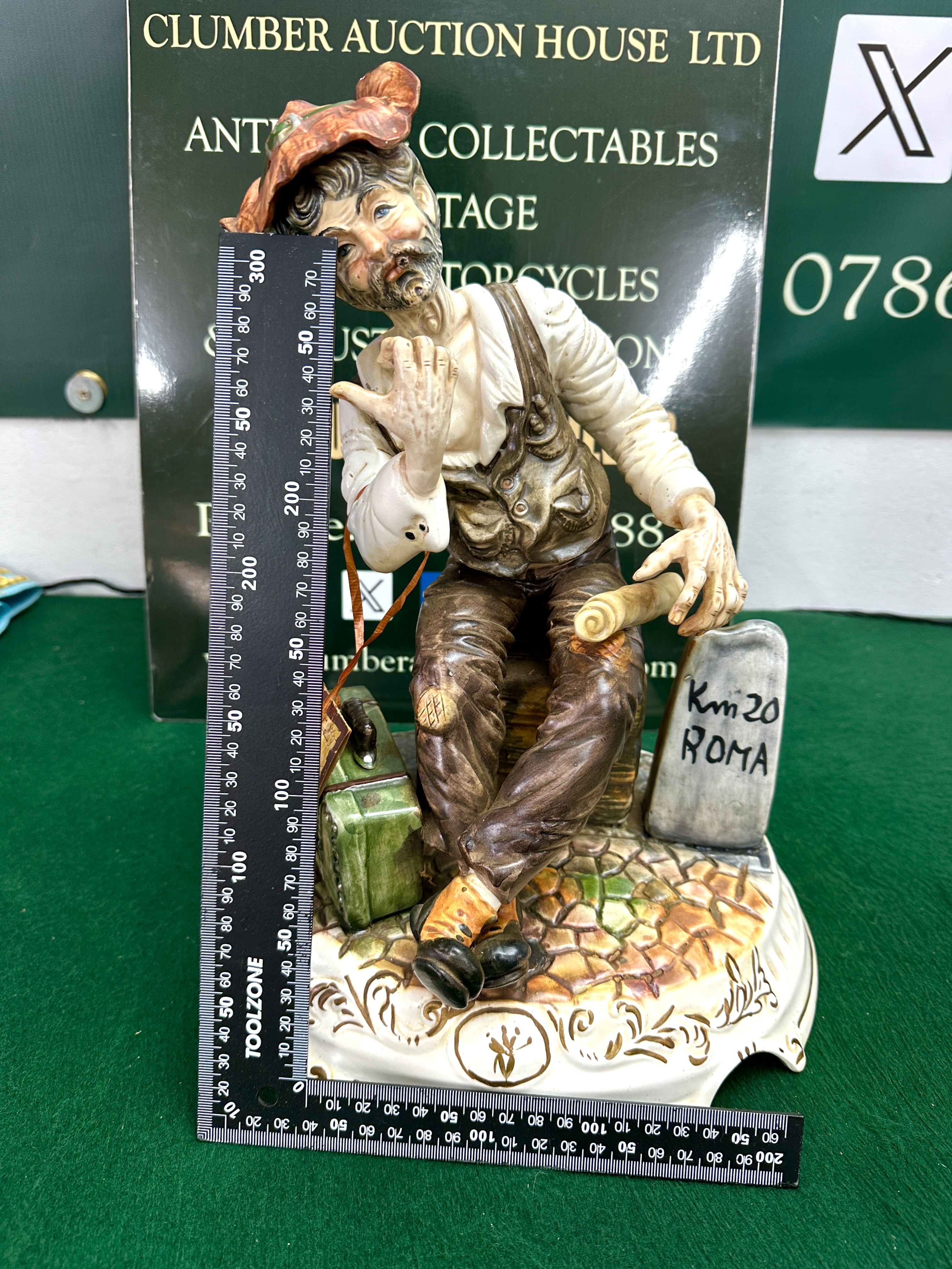 A Capodimonte hand-painted ceramic figurine by the sculptor Giuseppe Cappe, depicting a dishevelled traveller or vagabond. The character is portrayed in a seated pose atop a wooden trunk, set upon a base textured to resemble cobblestones. To his right sits a green suitcase with a hanging tag, and to his left is a milestone inscribed Km 20 ROMA. The figure is dressed in a floppy, tattered hat, a white open-collared shirt, a brown waistcoat, and patched trousers, and is shown holding a rolled scroll or map. The piece features expressive detailing and a scroll-moulded base with gilded highlights. The front of the base bears a blue underglaze mark consisting of a capital letter N surmounted by a five-pointed crown within a circular frame. An incised signature for G. Cappe is located on the top of the base beside the milestone.