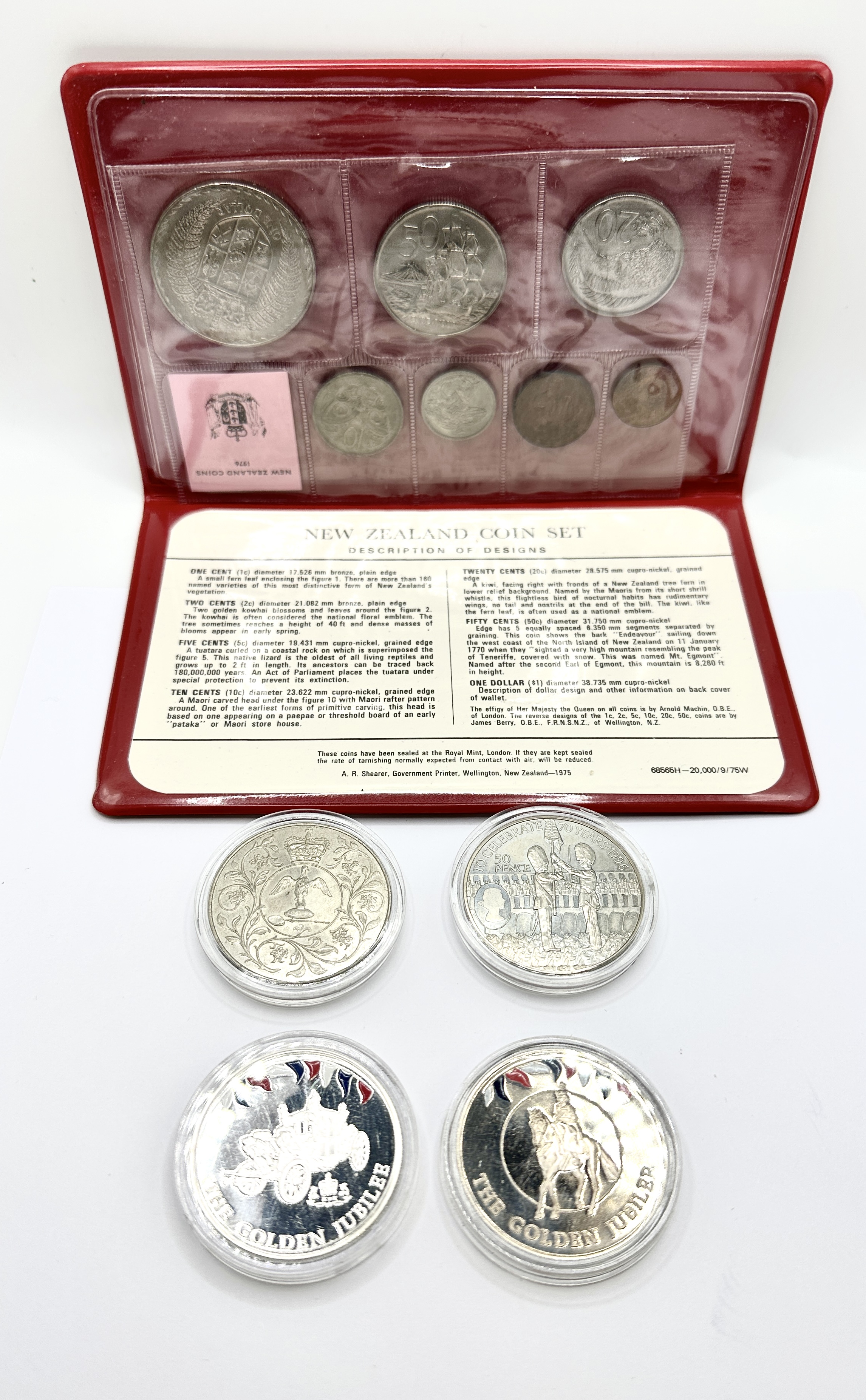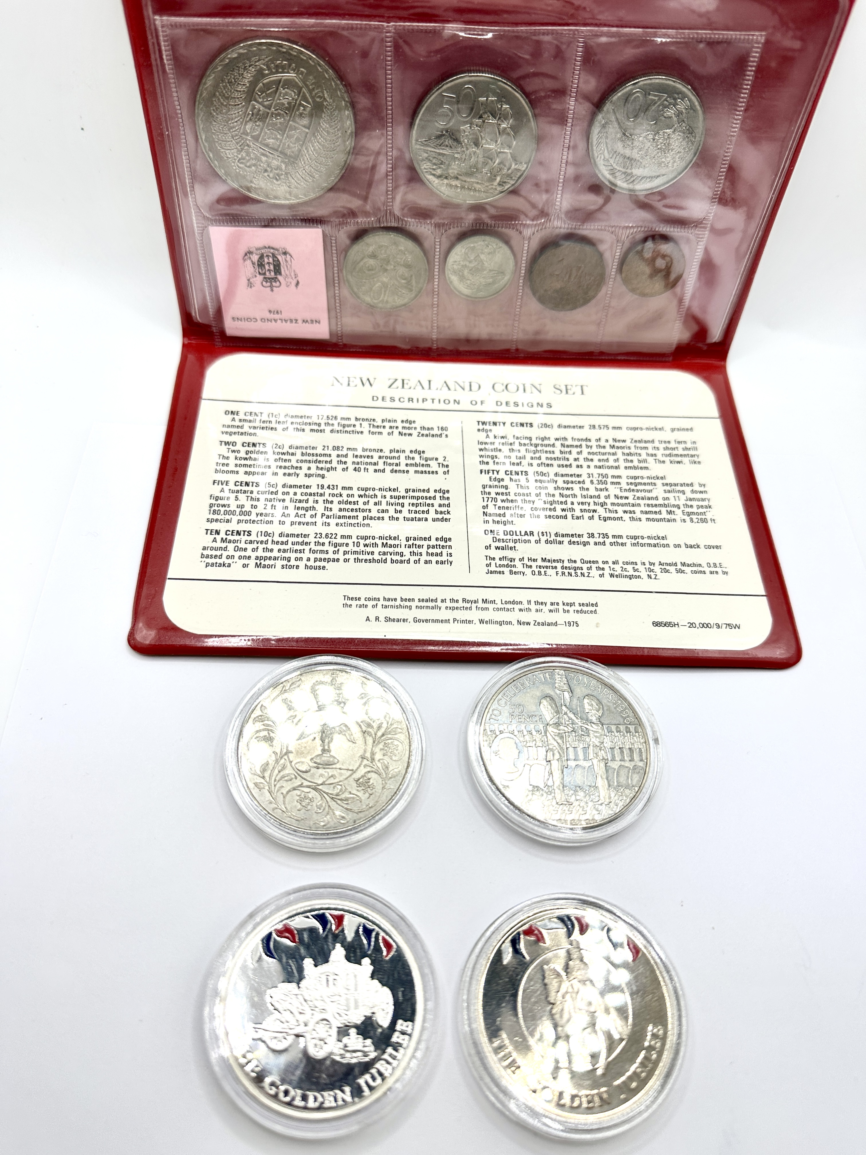 A collection of numismatic items comprising a New Zealand uncirculated coin set and several individual commemorative pieces. The New Zealand set, produced at the Royal Mint, London, is housed in its original red vinyl folding wallet and includes various denominations. The coins are composed of cupro-nickel and bronze. The additional items are presented in protective acrylic capsules and include a UK commemorative 50 pence coin marking the 70th birthday of Queen Elizabeth II, a crown-sized medal featuring the four national floral emblems of the United Kingdom, and Golden Jubilee commemorative medals featuring red and blue enamel accents. These medals depict the Gold State Coach and a royal figure on horseback.