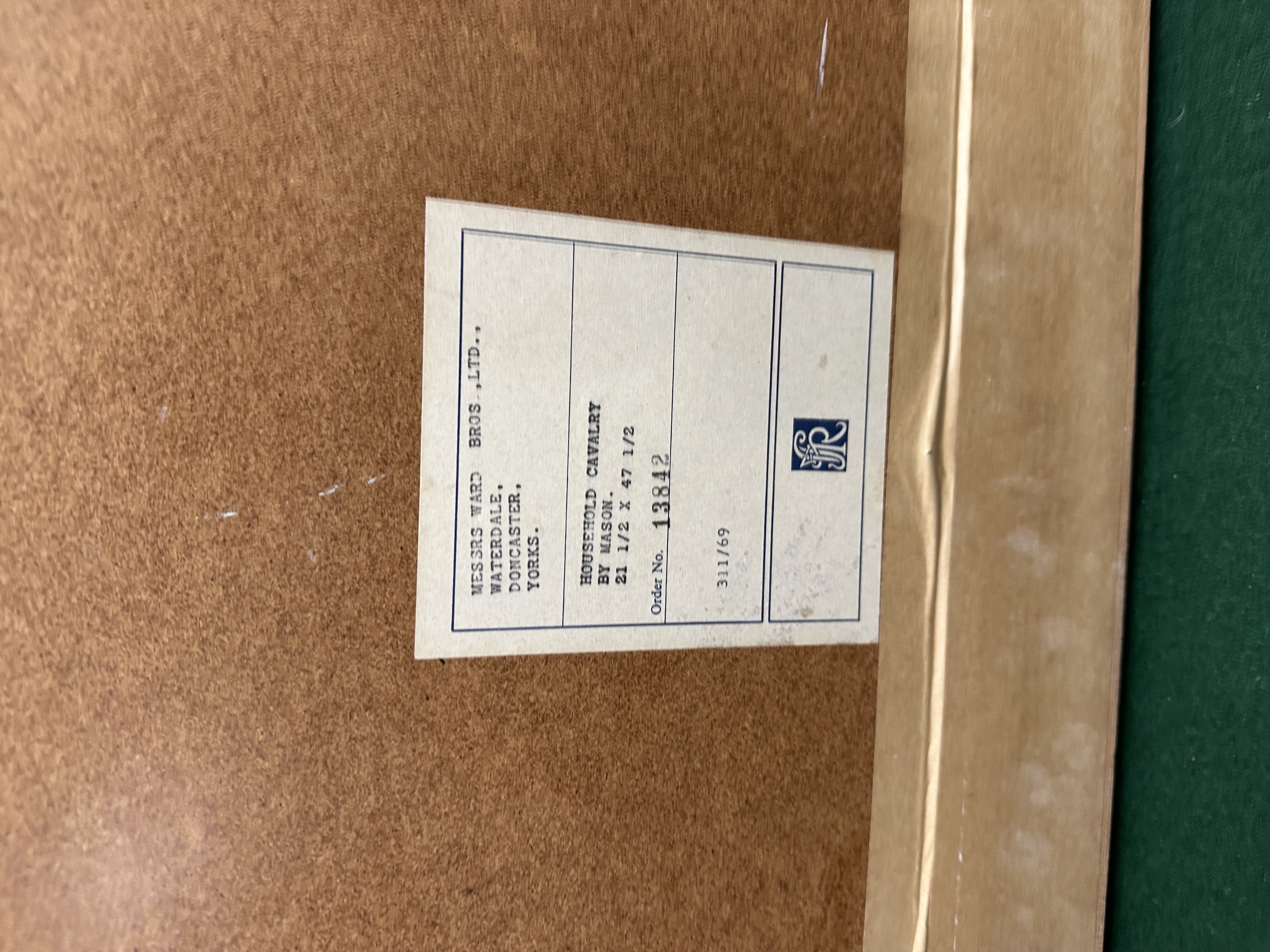 A mid-20th-century commercial print on textured board depicting members of the Household Cavalry on horseback in London. The composition features the Victoria Memorial and Buckingham Palace in the background, rendered in a stylized, graphic manner with horizontal bands of muted colour. The work is presented in a cream-coloured wooden frame with a black inner slip. A paper label is affixed to the reverse from Messrs Ward Bros. Ltd., Waterdale, Doncaster, Yorks., which identifies the subject as Household Cavalry and the artist as Mason. The label also bears the order number 13842 and the code 311/69, likely indicating a production date of 1969.