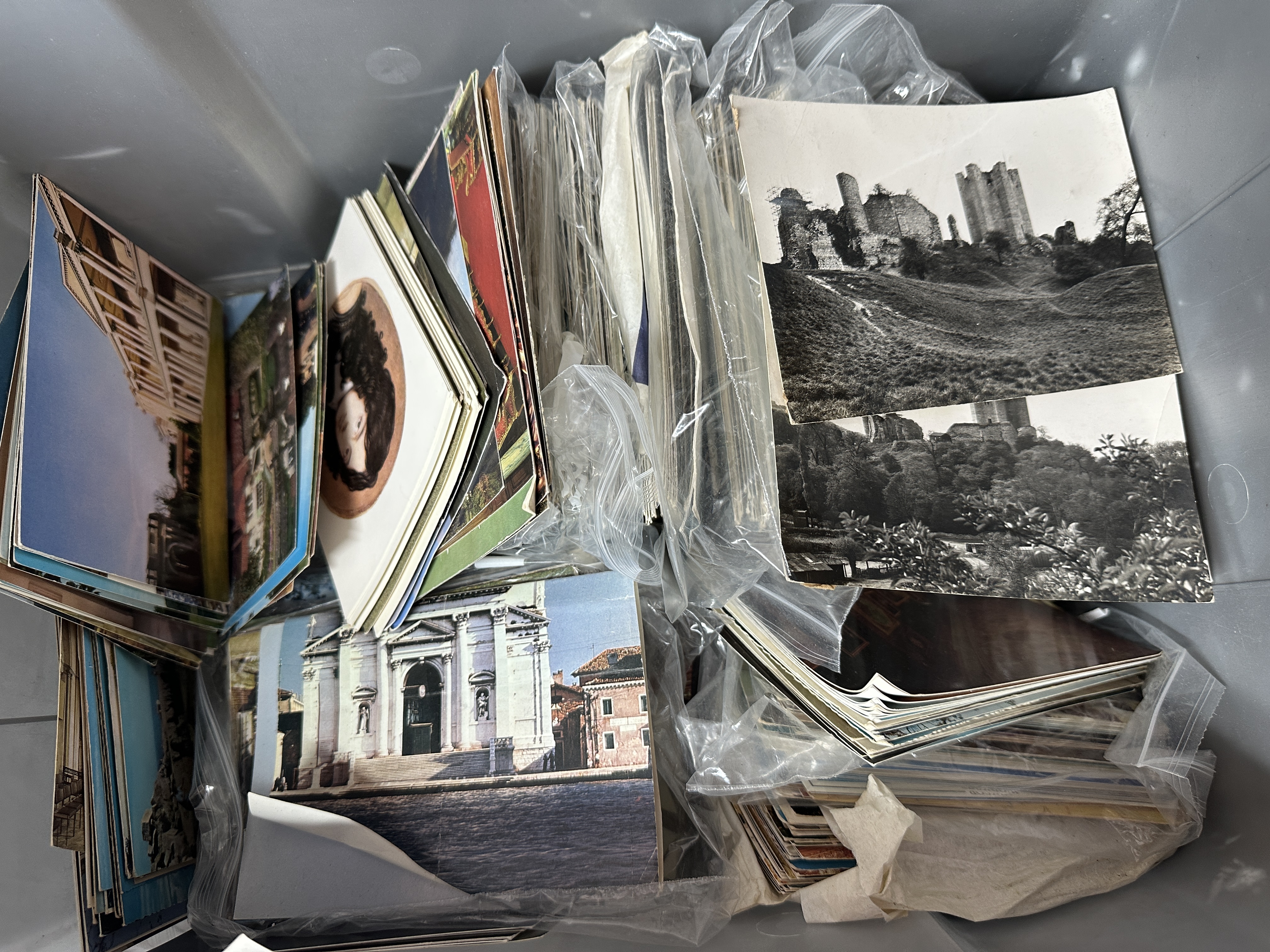 A large collection of postcards and photographic ephemera spanning the early to late 20th century. The lot contains a diverse range of subjects including British and international topographical views, architectural landmarks, historic ruins, and art reproductions. Included within the group are two black and white real photographic postcards (RPPCs) depicting a substantial hillside castle ruin in the style of Corfe Castle, Dorset. The collection also features a large-format colour postcard of a classical Venetian church on a canal side, resembling a Palladian structure such as Il Redentore. Other items include various mid-20th-century colour topographical postcards of urban and coastal scenes, and art reproduction cards including a portrait of a woman in a circular frame. The items are uncollated and housed in stacks and clear plastic bags.