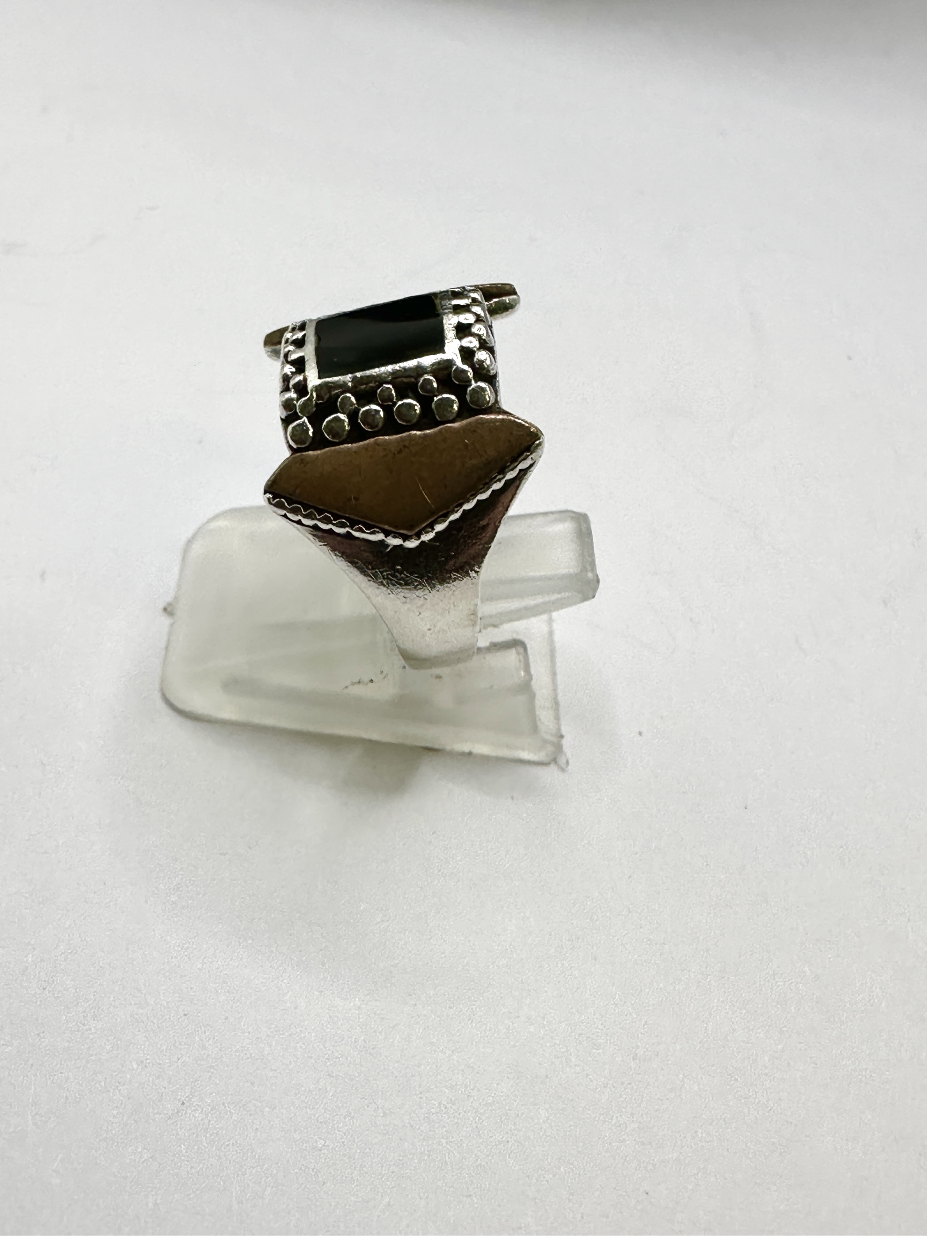 A contemporary 925 silver signet style ring featuring a central square cut black stone, likely onyx, flush set within a rectangular bezel. The central setting is framed by a raised border decorated with a series of small spherical beads in a granulated style. The shoulders are accented with two shield shaped inlays of a textured copper toned material. The ring features a polished silver toned shank. No maker marks or hallmarks are visible on the interior or exterior surfaces.