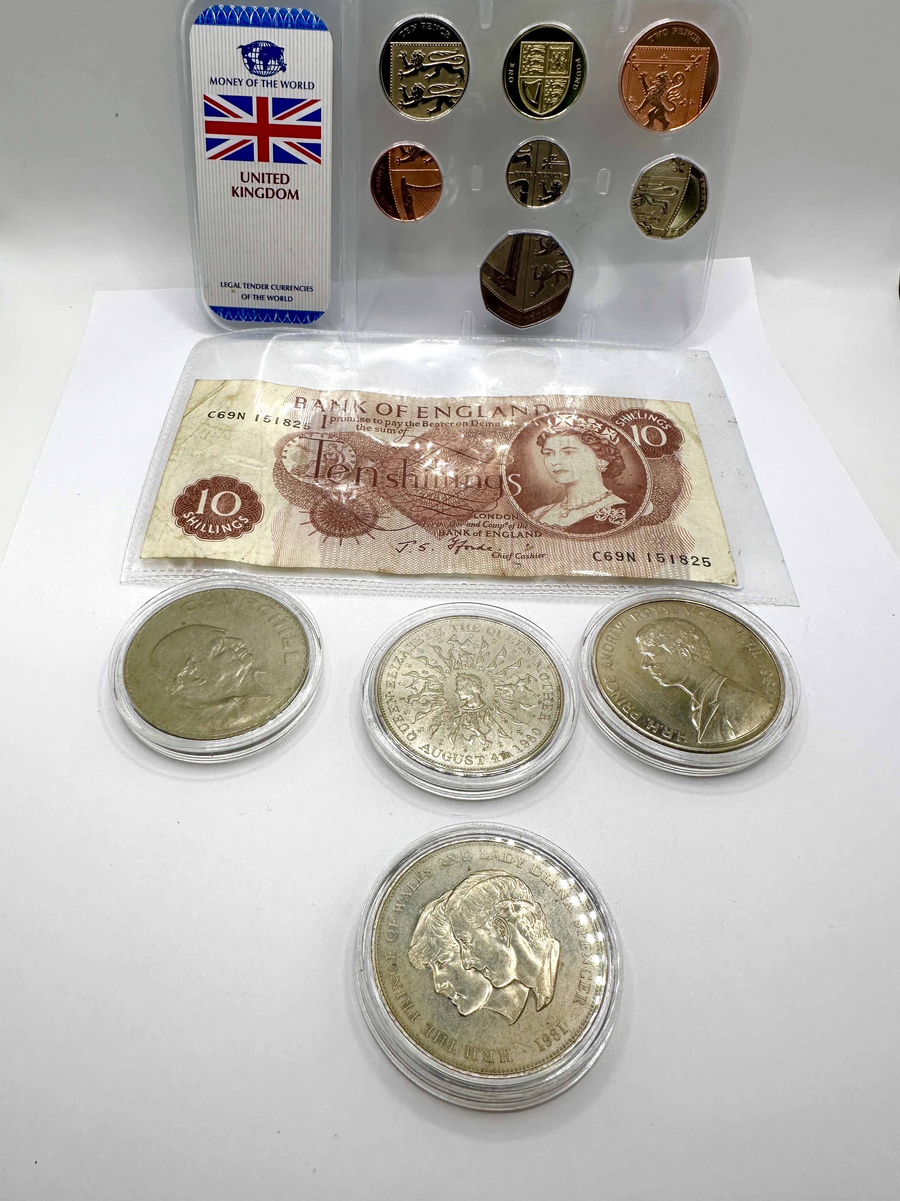 A collection of United Kingdom numismatic items comprising a banknote, a definitive coin set, and four commemorative crown-sized pieces. The lot includes a Bank of England Ten Shillings banknote, Series C, featuring the portrait of Queen Elizabeth II and the signature of Chief Cashier J. S. Fforde, serial number C69N 151825. Also present is a Money of the World presentation card containing a set of seven decimal coins: One Pound, Fifty Pence, Twenty Pence, Ten Pence, Five Pence, Two Pence, and One Penny, all featuring the Matthew Dent Royal Shield reverse designs. The collection is completed by four cupro-nickel commemorative pieces: a 1965 Winston Churchill memorial crown; a 1980 Queen Elizabeth the Queen Mother 80th birthday crown; a 1981 H.R.H. the Prince of Wales and Lady Diana Spencer wedding crown; and a 1982 H.R.H. Prince Andrew Royal Visit commemorative coin. The commemorative items are housed in individual protective plastic capsules.