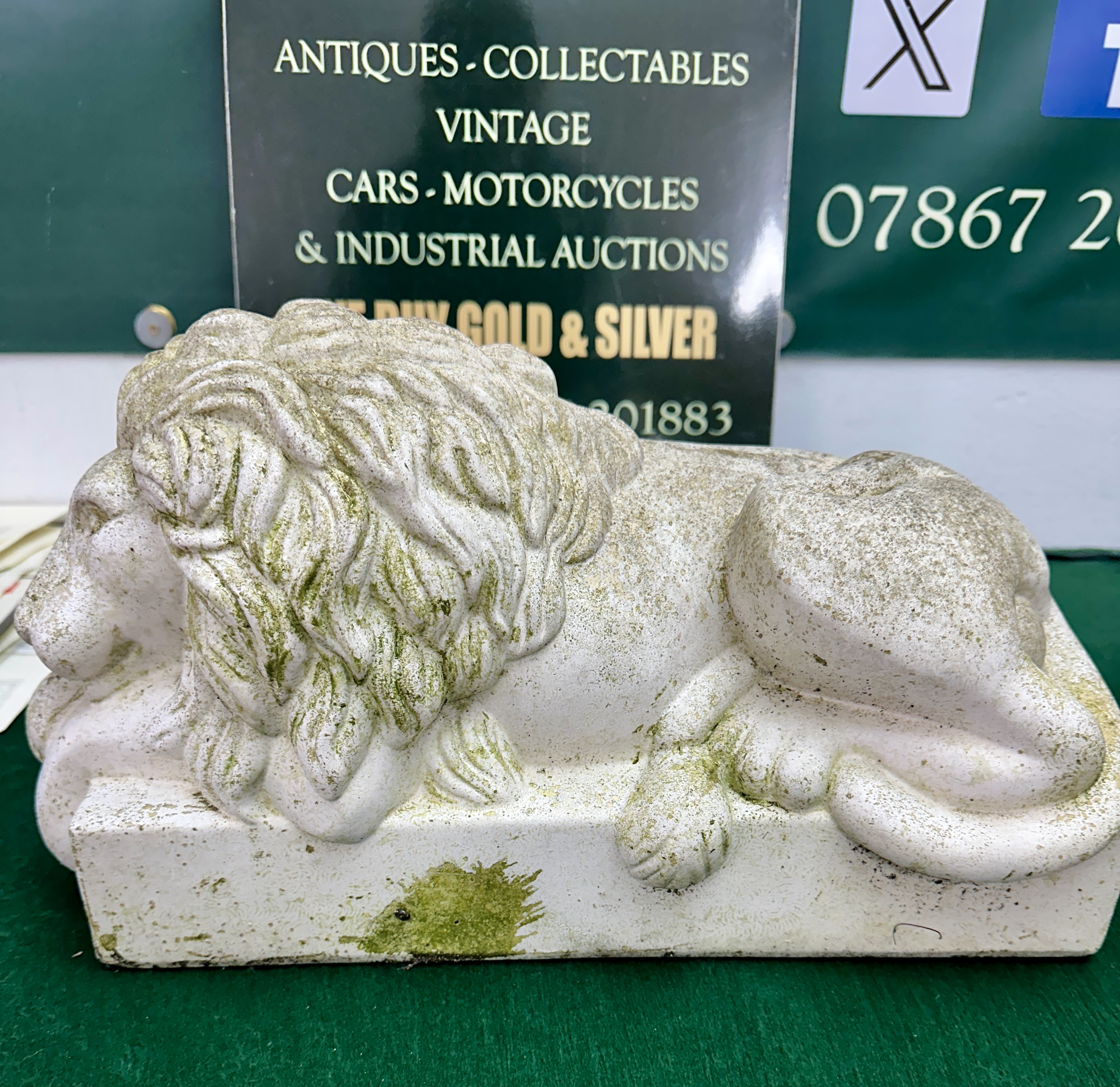 The sculpture exhibits significant weathering consistent with long-term outdoor exposure. There is extensive green organic growth, including algae and moss, across the mane and the front of the base. The surface shows characteristic pitting, minor abrasions, and general atmospheric soiling. No major structural chips or repairs are visible.