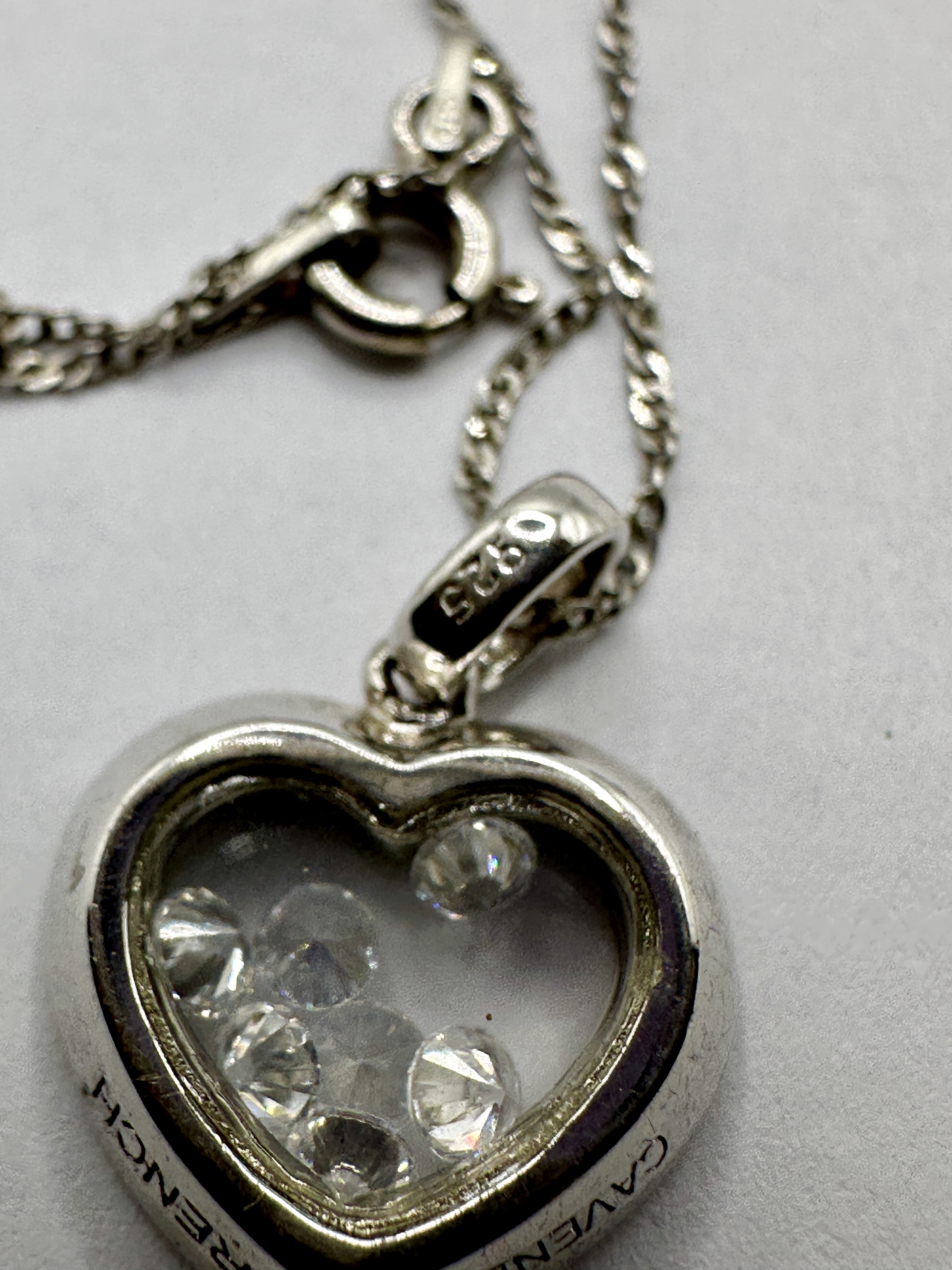 A sterling silver necklace featuring a heart-shaped pendant from the Cavendish collection by French Connection. The pendant is constructed with a central glazed compartment containing multiple loose, round brilliant-cut colourless stones in a floating style. The edge of the heart pendant is engraved with the words FRENCH and CAVENDISH. The bail is stamped with the mark 925. The pendant is suspended from a fine trace-link chain fitted with a bolt ring clasp.