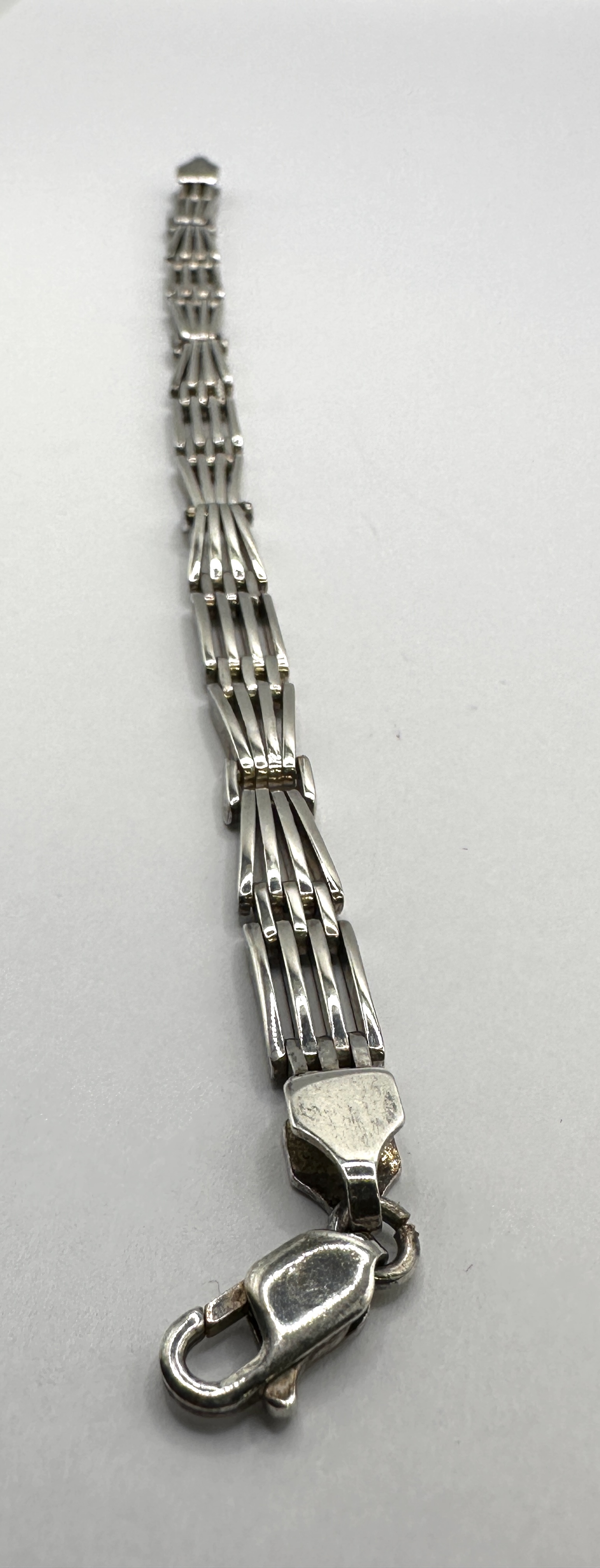 The bracelet is in fair to good condition. There is noticeable tarnishing and oxidation throughout the silver surfaces, particularly within the recessed areas of the gate links. Fine surface scratches and wear are present, consistent with age and regular use. The piece would benefit from professional cleaning and polishing.