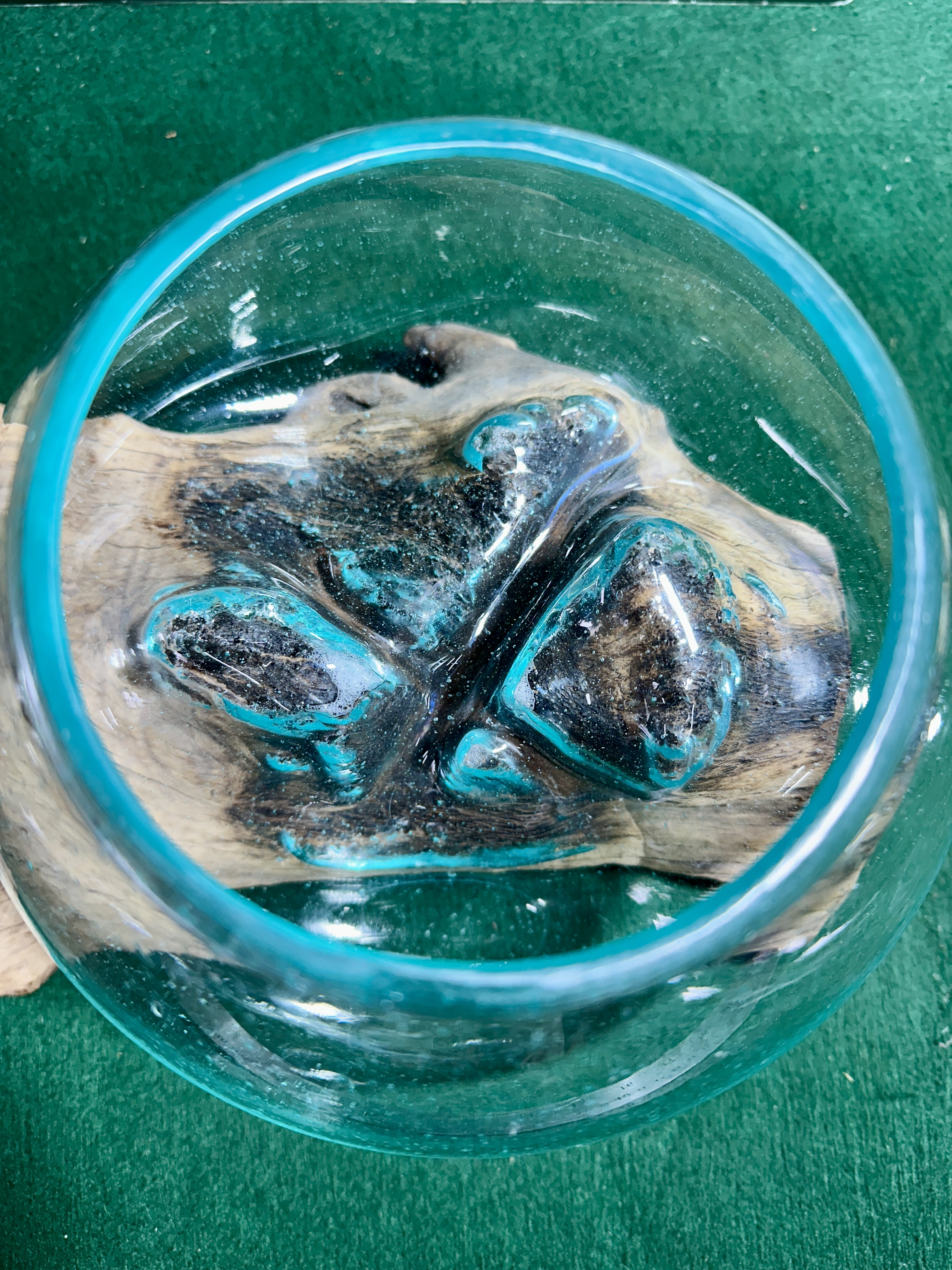 A contemporary decorative bowl of globular form, hand-blown from aquamarine-tinted glass. The piece is slumped while molten directly onto a piece of weathered natural hardwood root, allowing the base of the glass to conform to the contours of the timber. The glass features internal air bubble inclusions throughout. This style is in the style of contemporary Balinese craftsmanship and is frequently marketed under brands such as Cohasset Gifts or Chesapeake Bay. The wood base exhibits natural weathering and surface charring where the molten glass made contact during the manufacturing process.