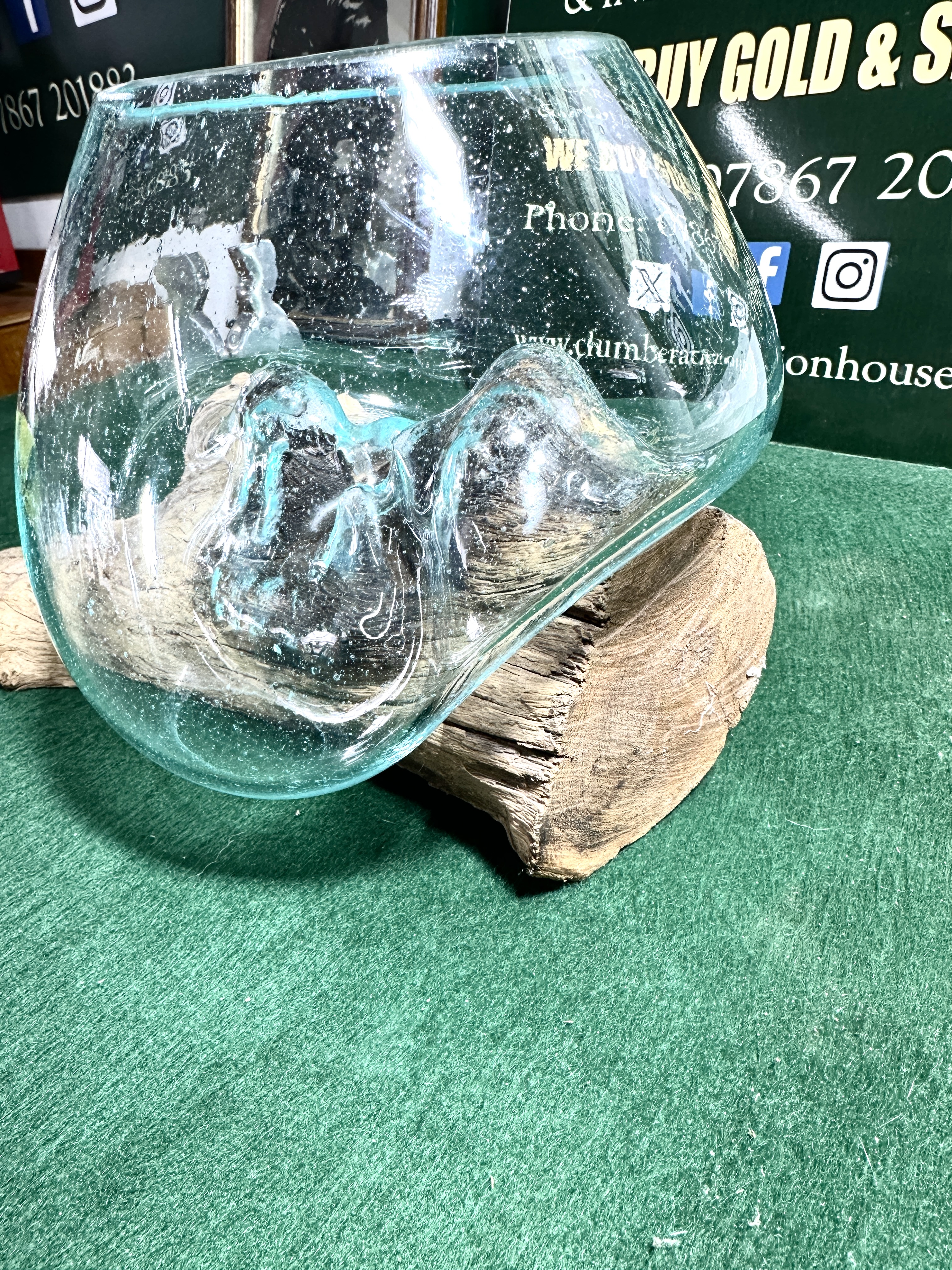 The item is in good condition. The glass is free from chips or cracks. The wood base shows natural weathering and charred areas which are inherent to the production process. Internal bubbles are a byproduct of the hand-blowing technique.