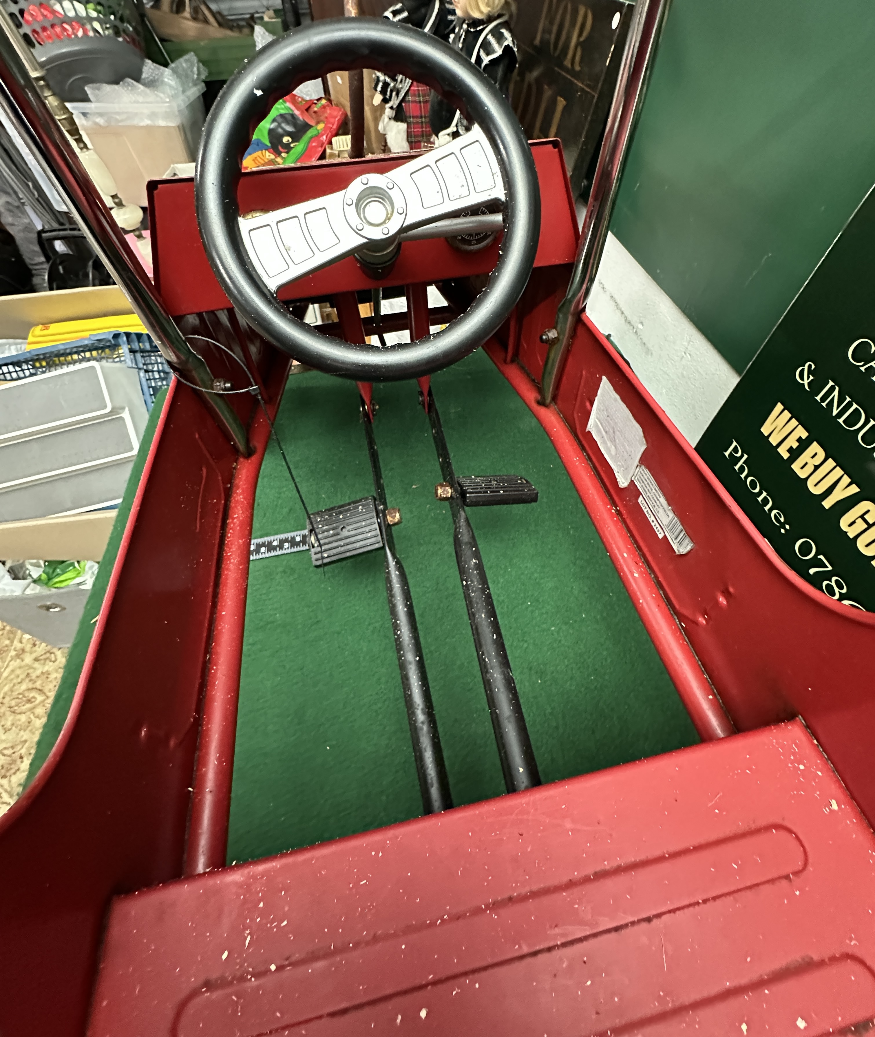 The item is in good overall condition. Visible surface oxidation and pitting are present on the chrome-effect brightwork, particularly on the handrails, radiator cowl, and hose reel. Minor paint chips and surface wear are evident across the body, consistent with previous use and storage. One headlight lens shows slight clouding. The pedal and steering mechanisms appear complete and functional, though they have not been mechanically tested.