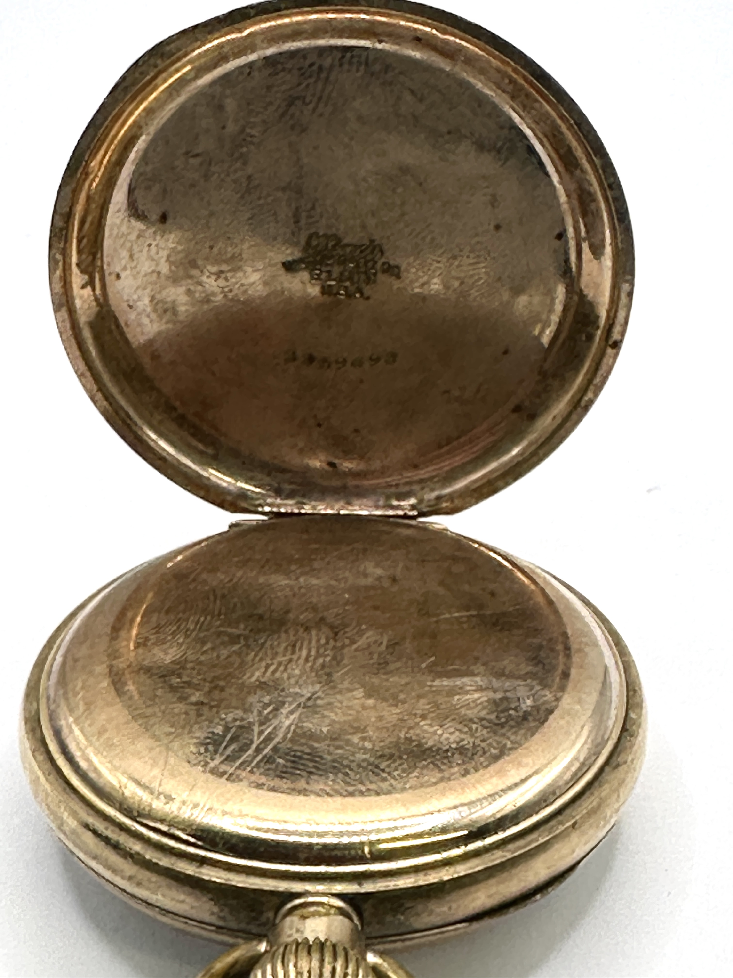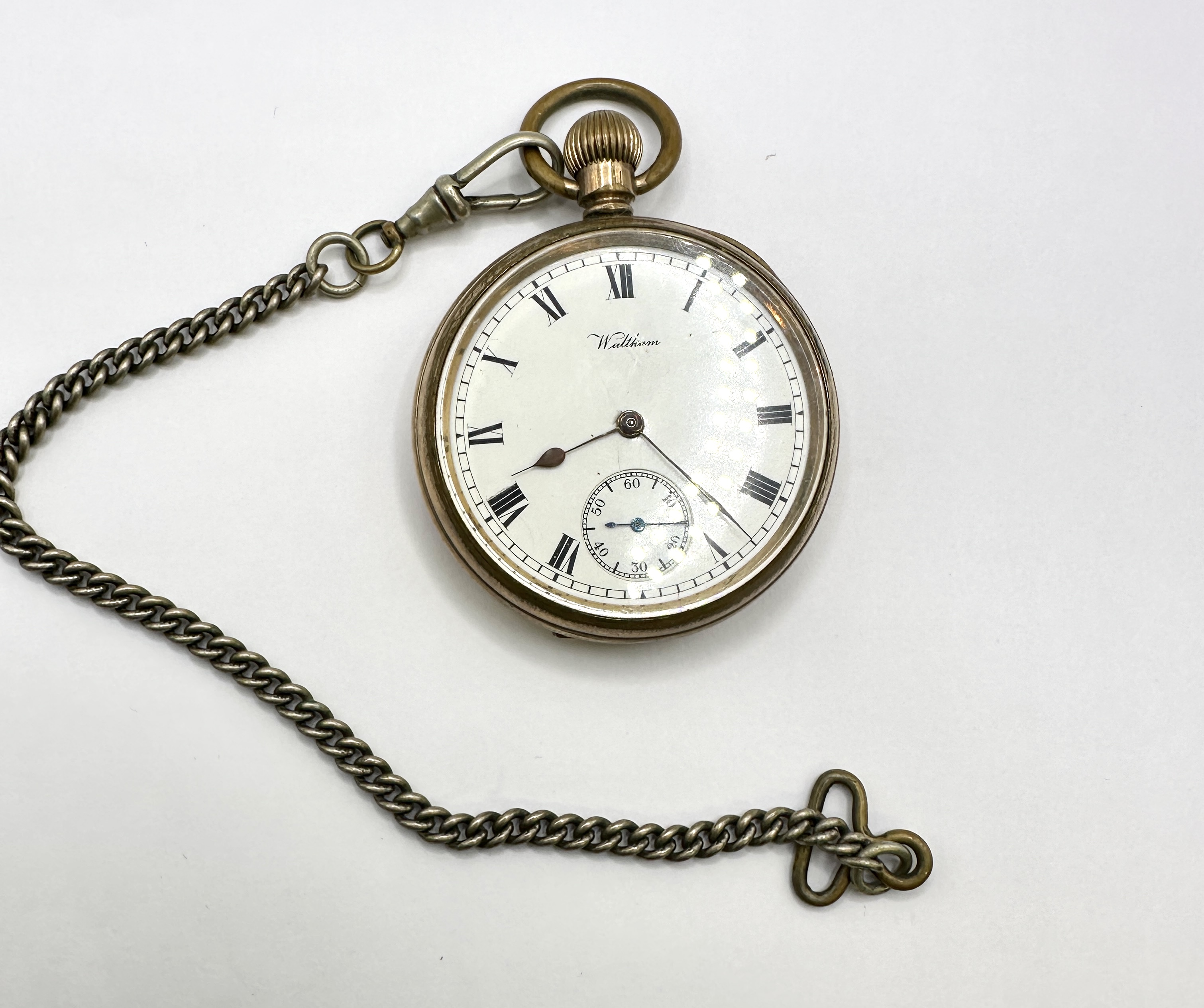 An American-made open-face pocket watch by Waltham. The white dial features black Roman numeral hour markers, an outer minute track, and a subsidiary seconds dial at the 6 o’clock position, signed Waltham in cursive script. The watch is housed in a gold-toned metal case, which shows the underlying brass base metal. The interior of the case back is stamped with the mark for the Illinois Watch Case Co., Elgin, U.S.A., and bears the serial number 3439493. The movement is a manual wind type. The watch is accompanied by a gold-toned curb link watch chain featuring a T-bar and a swivel lobster-style clasp.