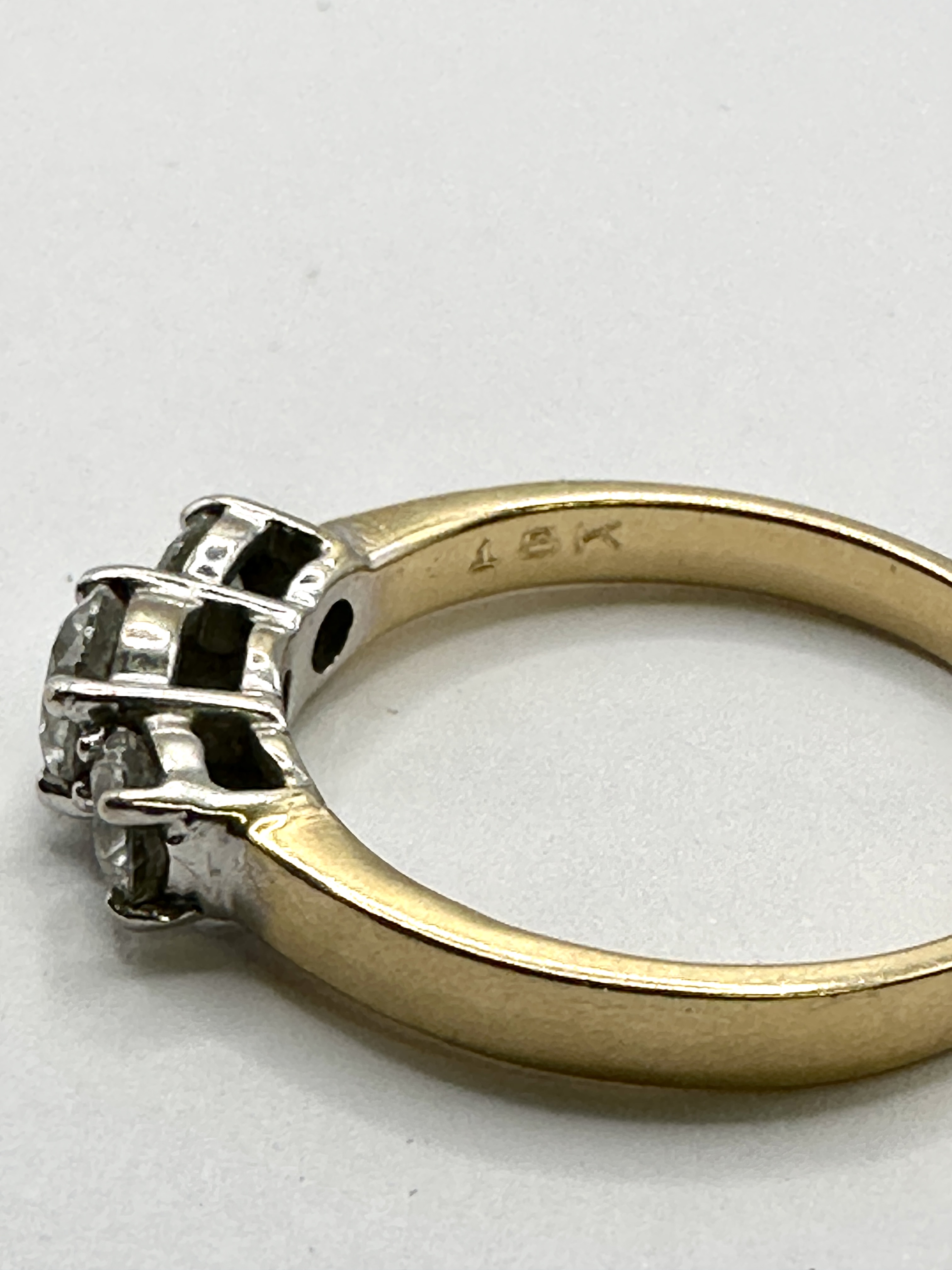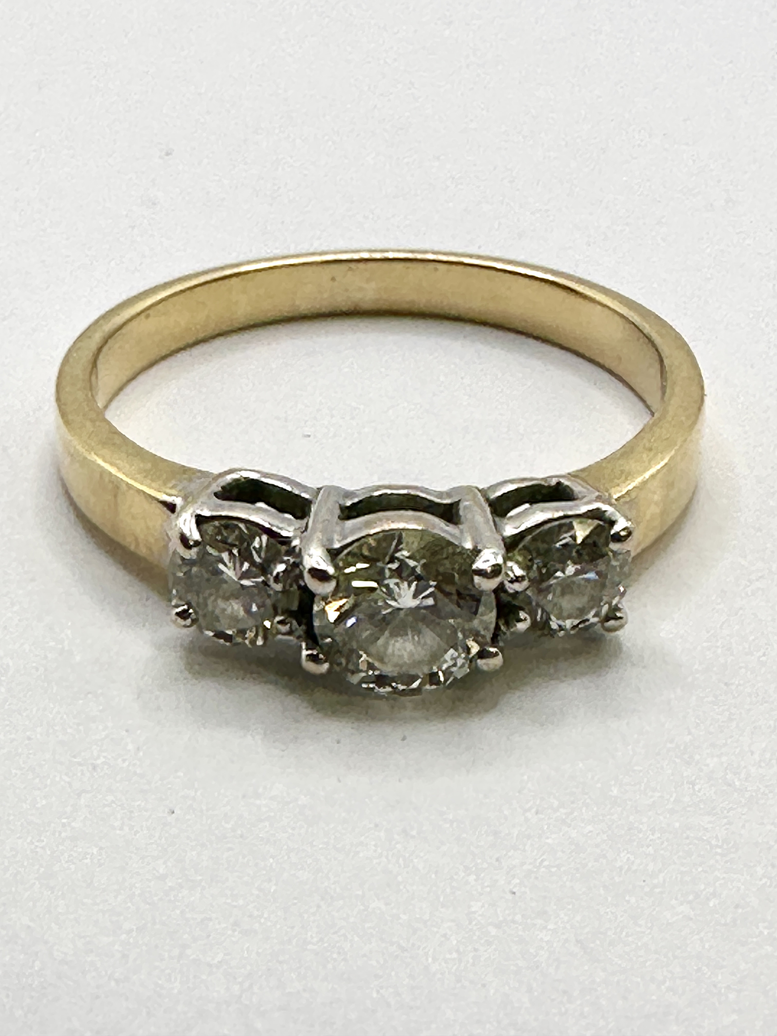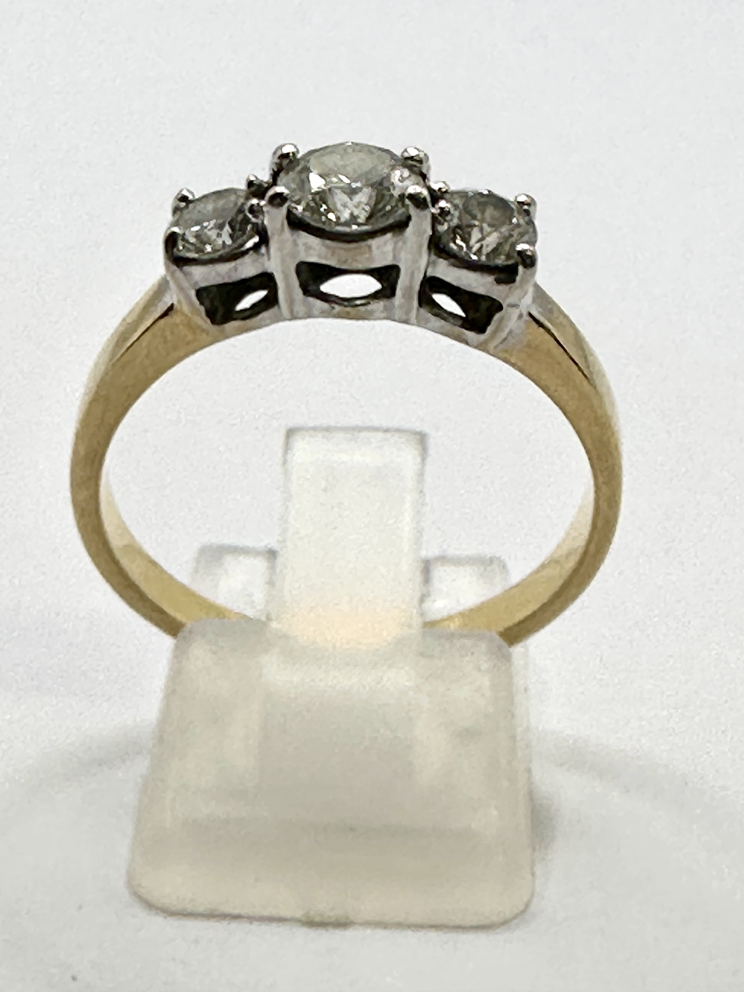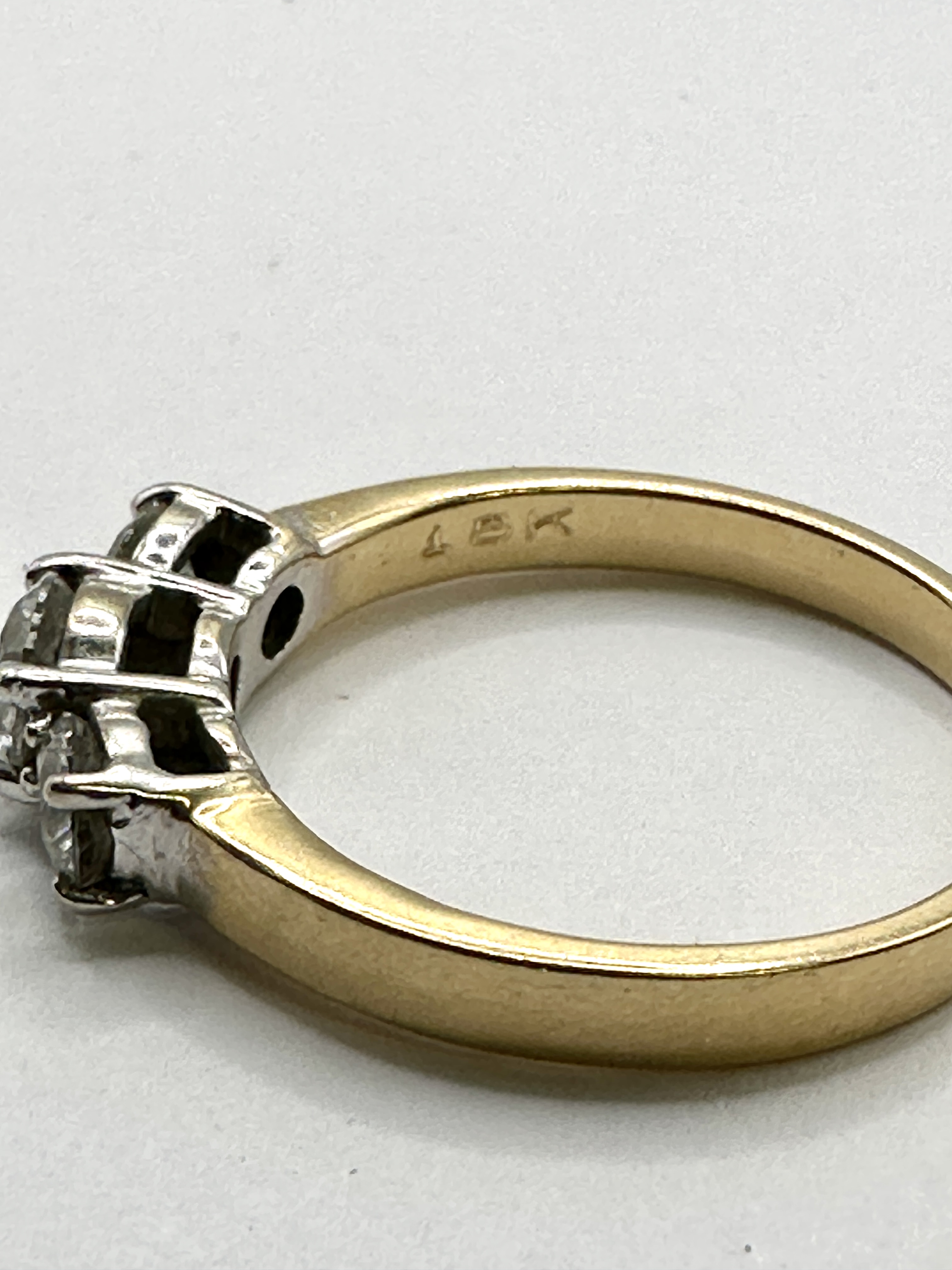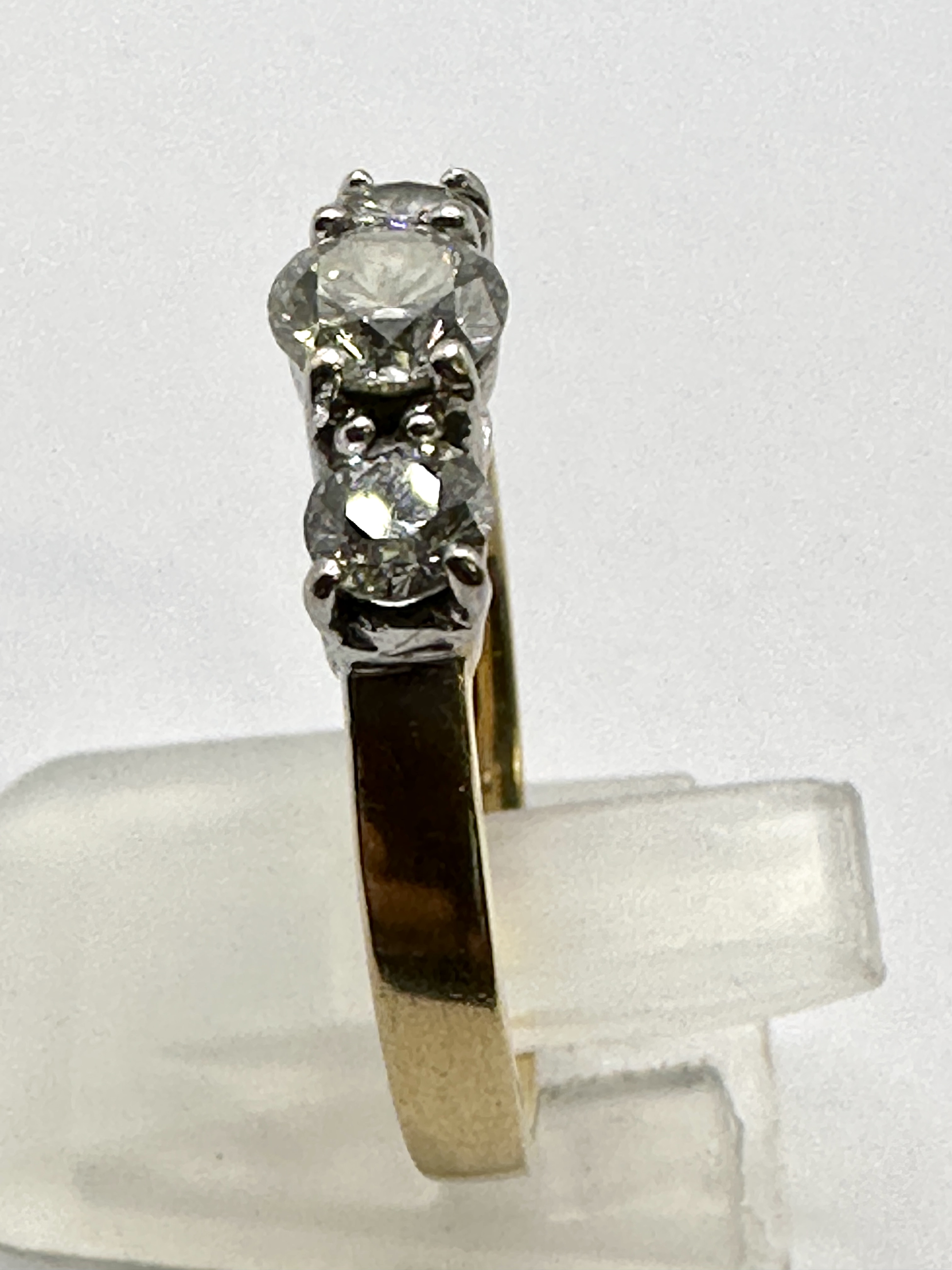 An 18 carat gold and diamond three-stone trilogy ring. The piece is of bi-metal construction, featuring a yellow gold shank and white gold settings. The ring is set with a central round brilliant-cut diamond, flanked by two smaller round brilliant-cut diamonds, all held in four-claw settings. The interior of the shank is stamped 18K.