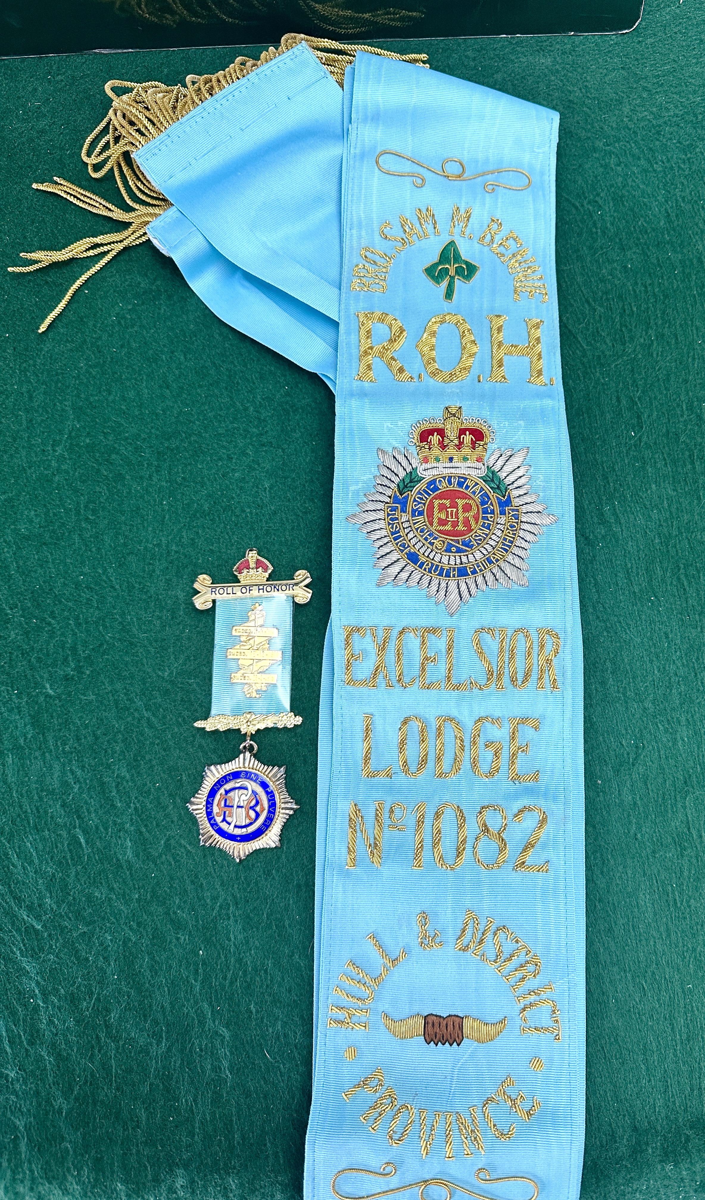 A collection of fraternal regalia associated with the Royal Antediluvian Order of Buffaloes (RAOB), Hull & District Province. The lot consists of a light blue moire fabric sash and a matching breast jewel. The sash features gold-toned metallic embroidery and fringe, inscribed with the name BRO. SAM M. BENNIE and the initials R.O.H. (Roll of Honour). The central embroidery includes a crown above a circular emblem featuring the Garter motto HONI SOIT QUI MAL Y PENSE. Additional text identifies the affiliation as EXCELSIOR LODGE No 1082 and HULL & DISTRICT PROVINCE, accompanied by a buffalo horn motif.