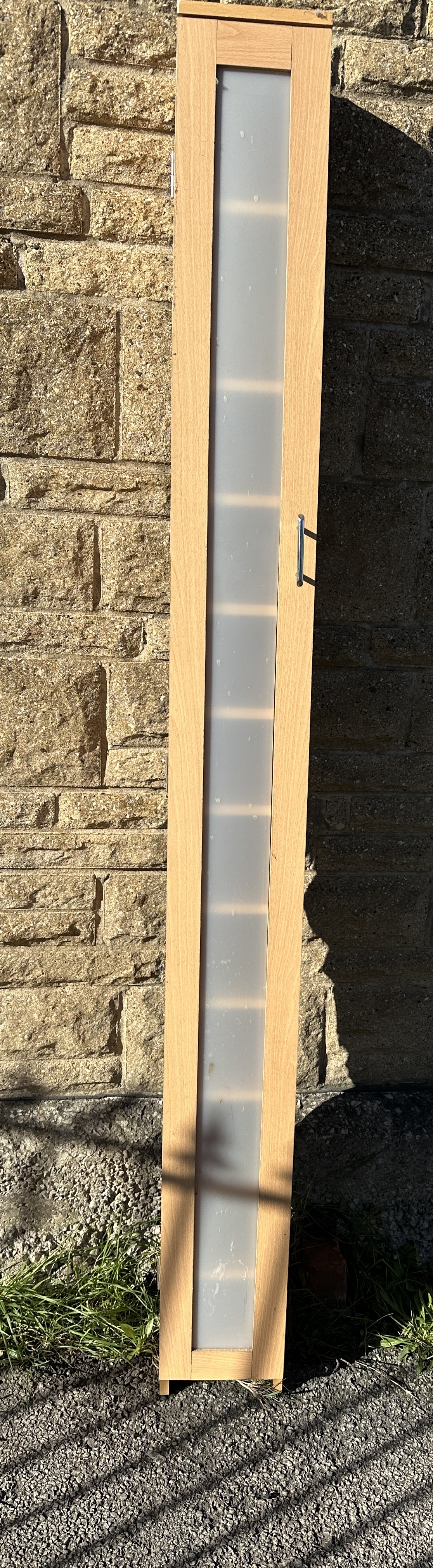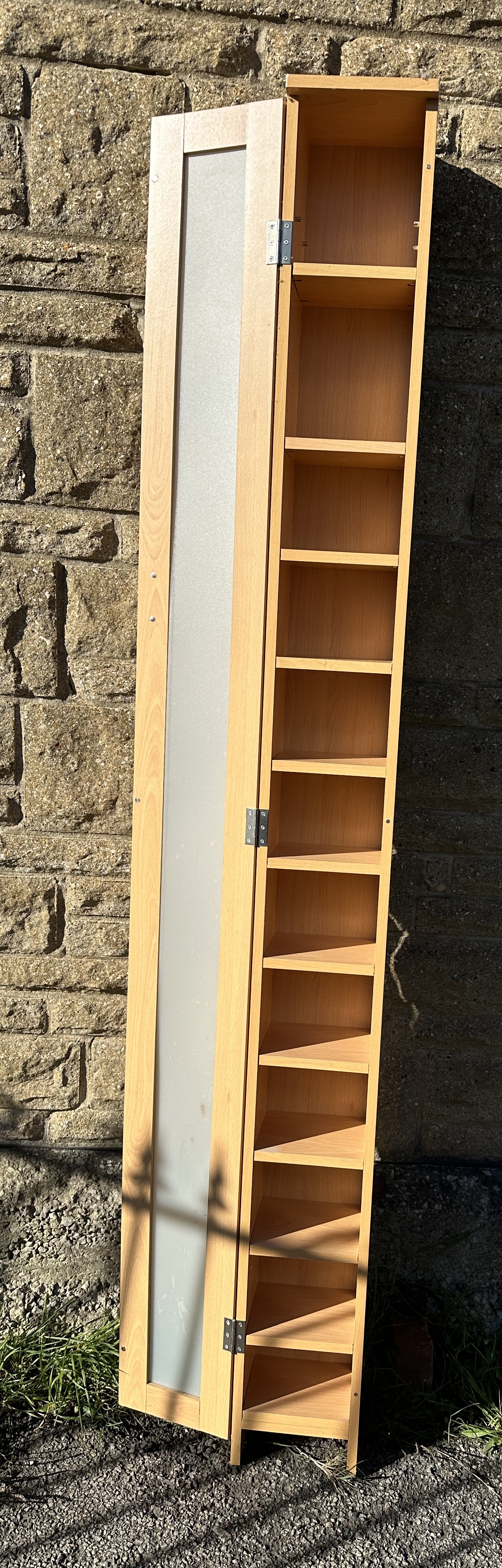 A contemporary tall and narrow media storage cabinet of single-piece construction. The unit is manufactured from composite wood finished in a light oak or beech effect veneer. The single door features a full-length inset panel of frosted translucent material. The interior is configured with ten shelves creating eleven narrow compartments, specifically designed for the storage of CDs or similar small media. The door is fitted with a modern brushed-metal effect bar handle and is mounted on three steel butt hinges. No maker’s marks or labels are present. The design is characteristic of mass-produced flat-pack furniture.
