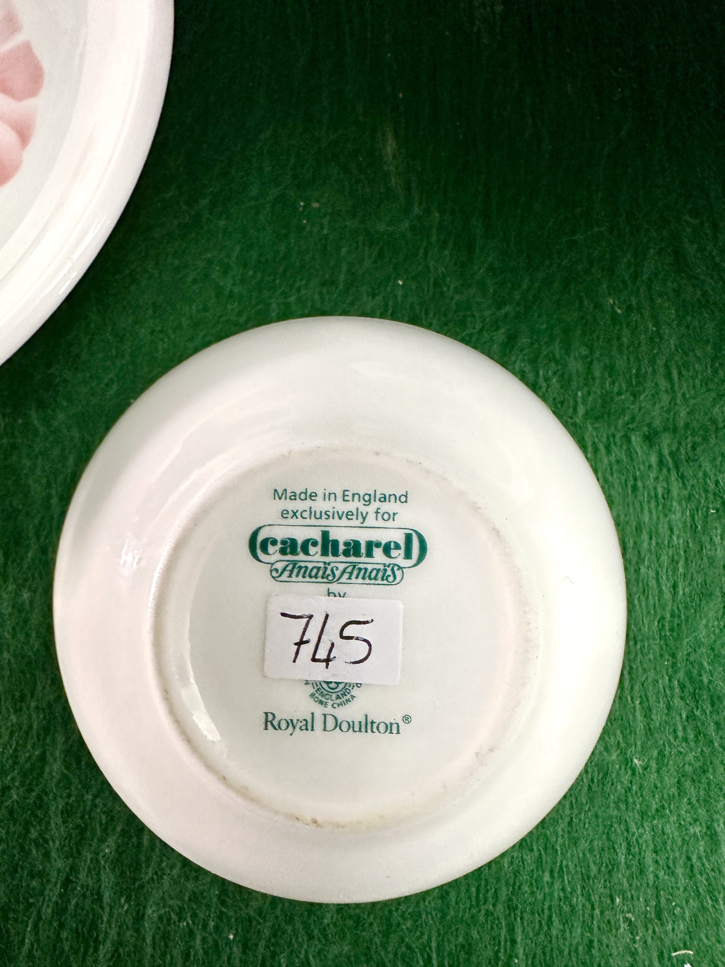 This lot comprises two distinct ceramic groups manufactured in England. The first is an earthenware wash set by Old Windsor Pottery, Staffordshire, consisting of a jug and a matching basin. The jug features a shaped spout and a gilt-finished handle, while the basin has a scalloped, fluted rim. Both pieces are decorated with transfer-printed floral sprays of purple irises and pink blossoms on a white ground with gilt highlights to the rims. The base of the basin bears the Old Windsor Pottery shield mark. The second group is a five-piece bone china vanity set produced by Royal Doulton exclusively for the Cacharel Anais Anais perfume line. This set includes two small circular bowls, a saucer, a cylindrical beaker, and a rectangular trinket tray. Each piece is decorated with the signature stylised pink floral motif associated with the fragrance. The bases are marked with the Royal Doulton lion and crown backstamp alongside the Cacharel branding.