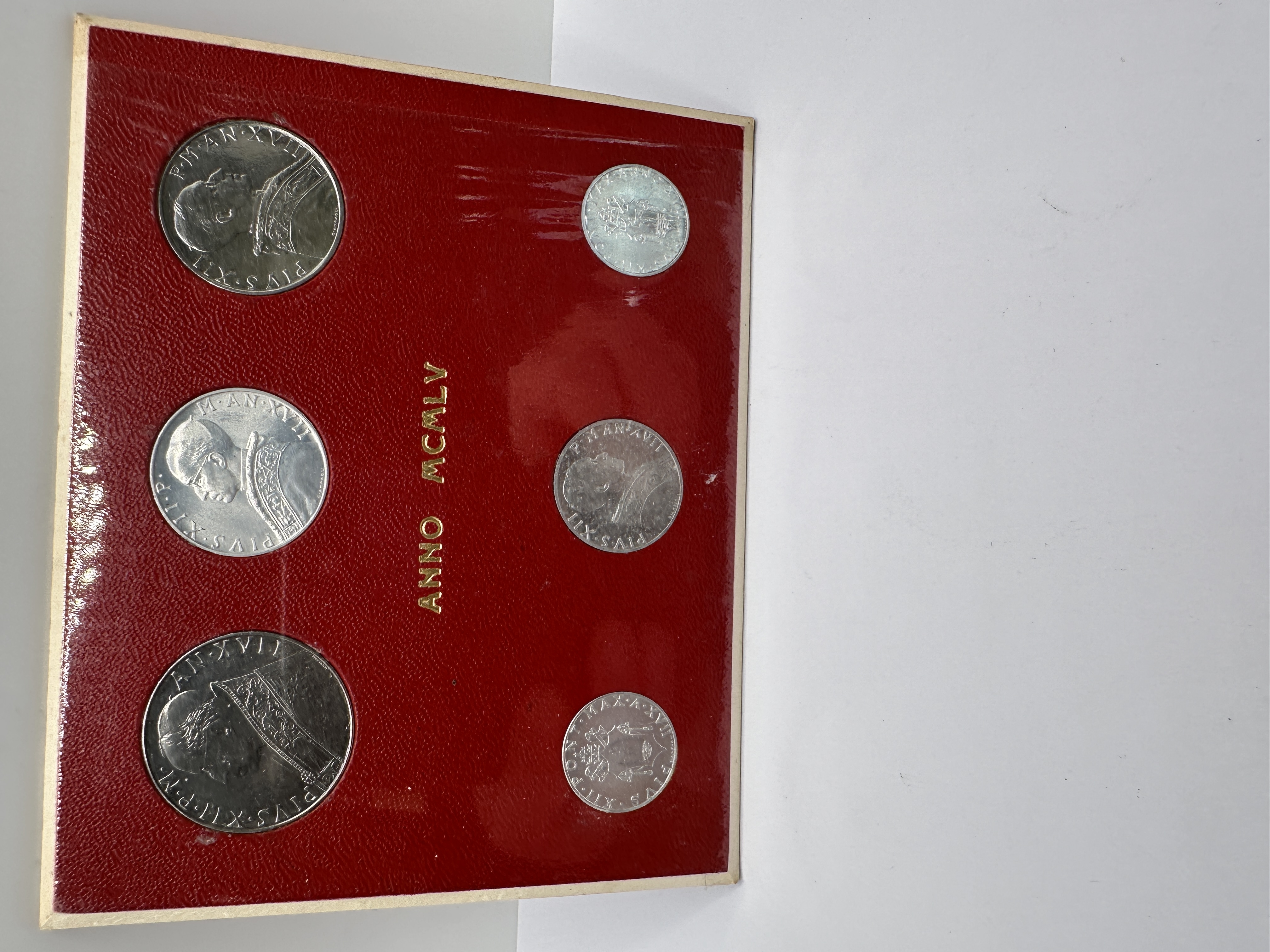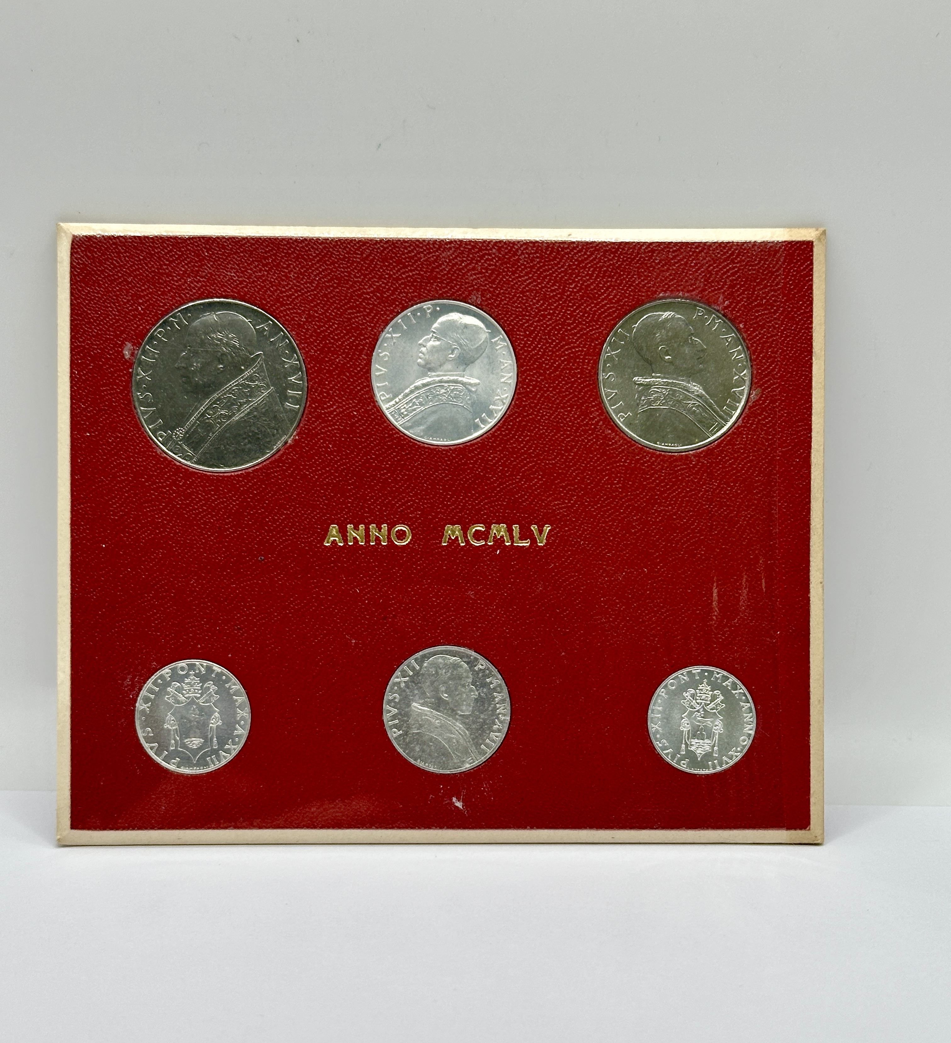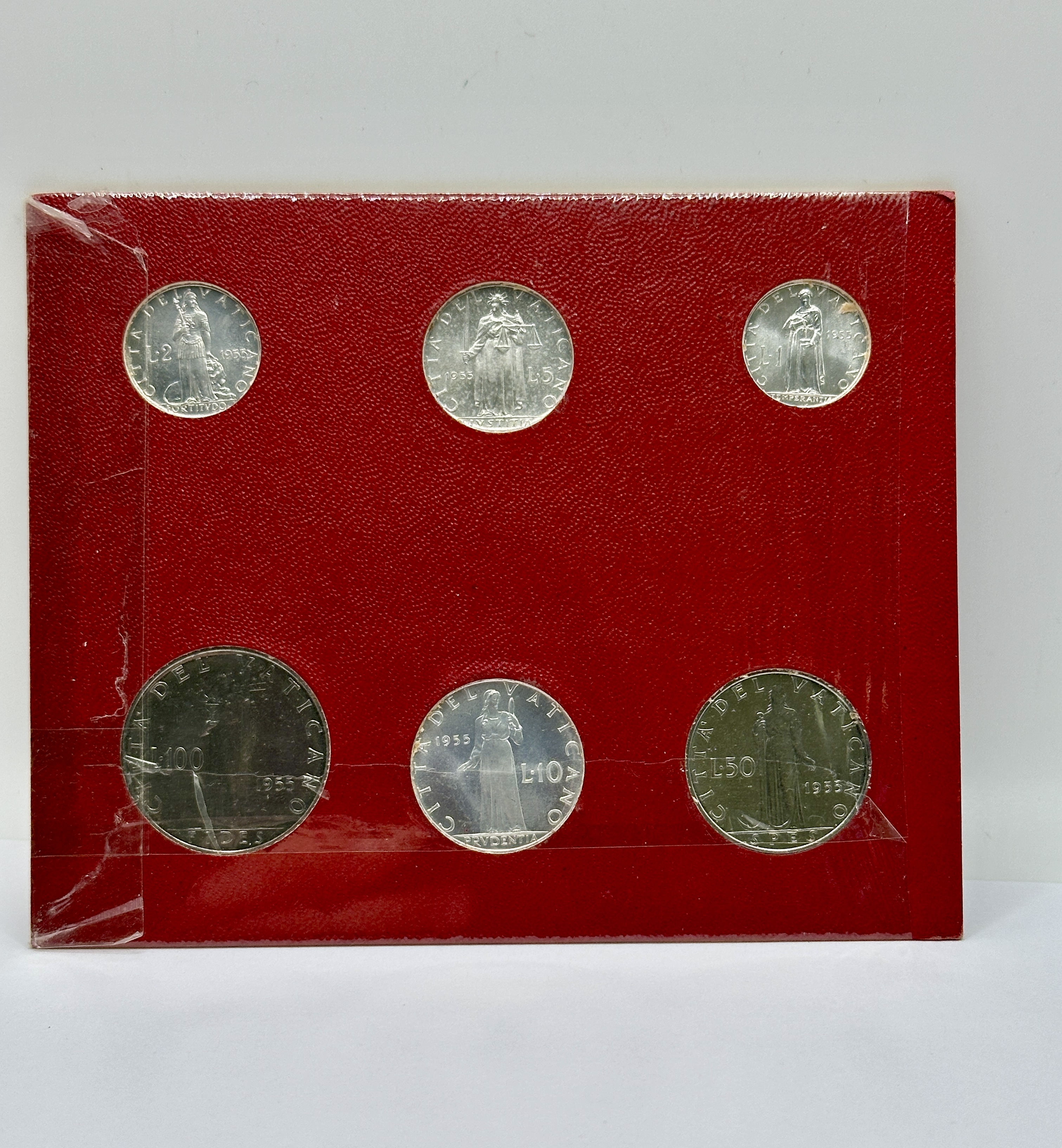 1955 (Anno MCMLV) Vatican City official mint set. This collection was issued during the seventeenth year of the pontificate of Pope Pius XII, as indicated by the inscription PIVS XII P.M. AN. XVII. The set comprises several denominations including L.1, L.2, L.5, L.10, L.50, and L.100. All coins are struck in 925 silver. The obverses of the L.5, L.10, L.50, and L.100 denominations feature the portrait of Pope Pius XII, while the L.1 and L.2 denominations depict the papal coat of arms. The reverses bear the legend CITTA DEL VATICANO and the date 1955, accompanied by allegorical figures representing the virtues of Fortitudo, Ivstitia, Temperantia, Fides, Prvdentia, and Spes. The coins are housed in the original red pebbled-texture presentation card with gold-foil lettering reading ANNO MCMLV.