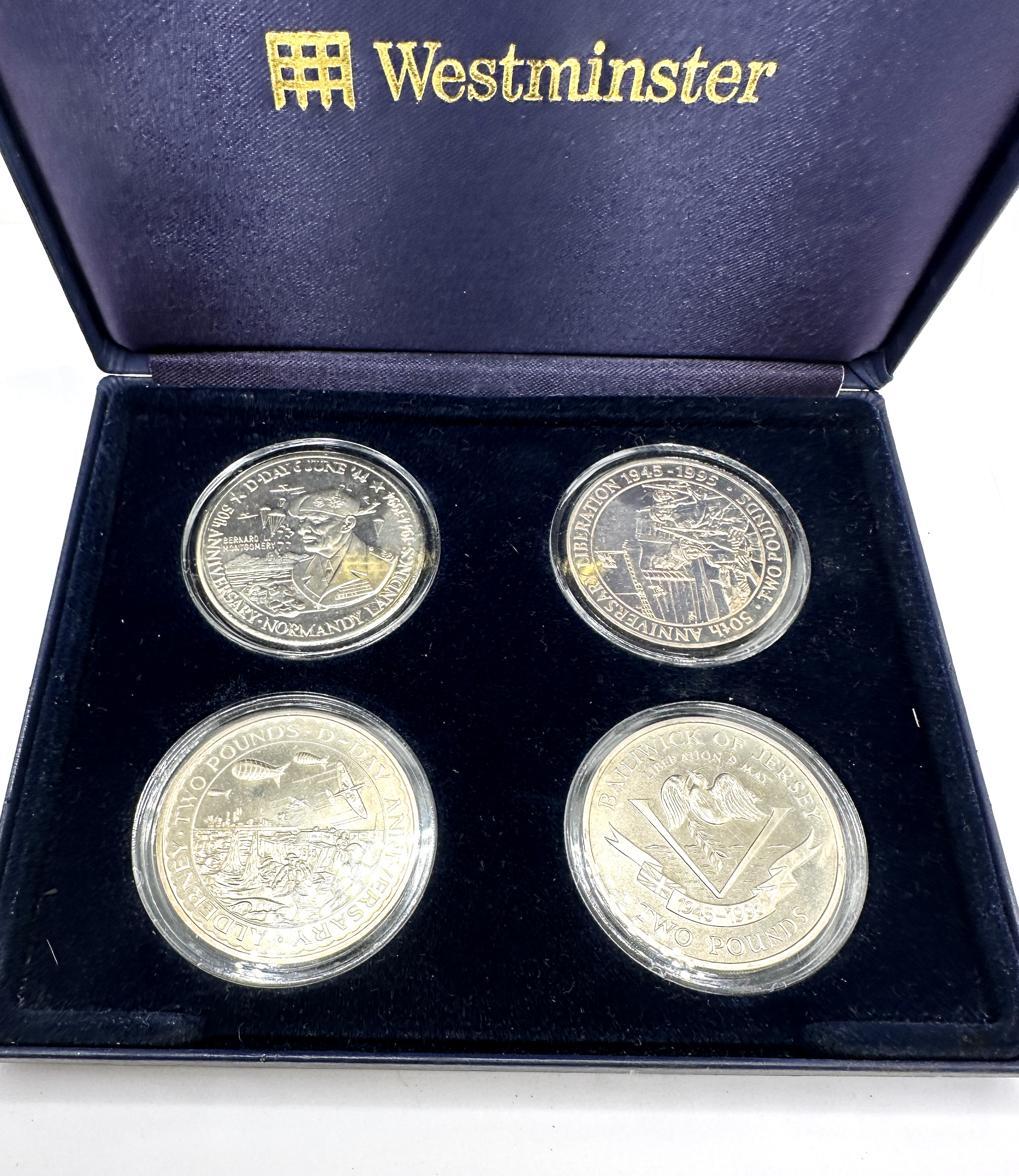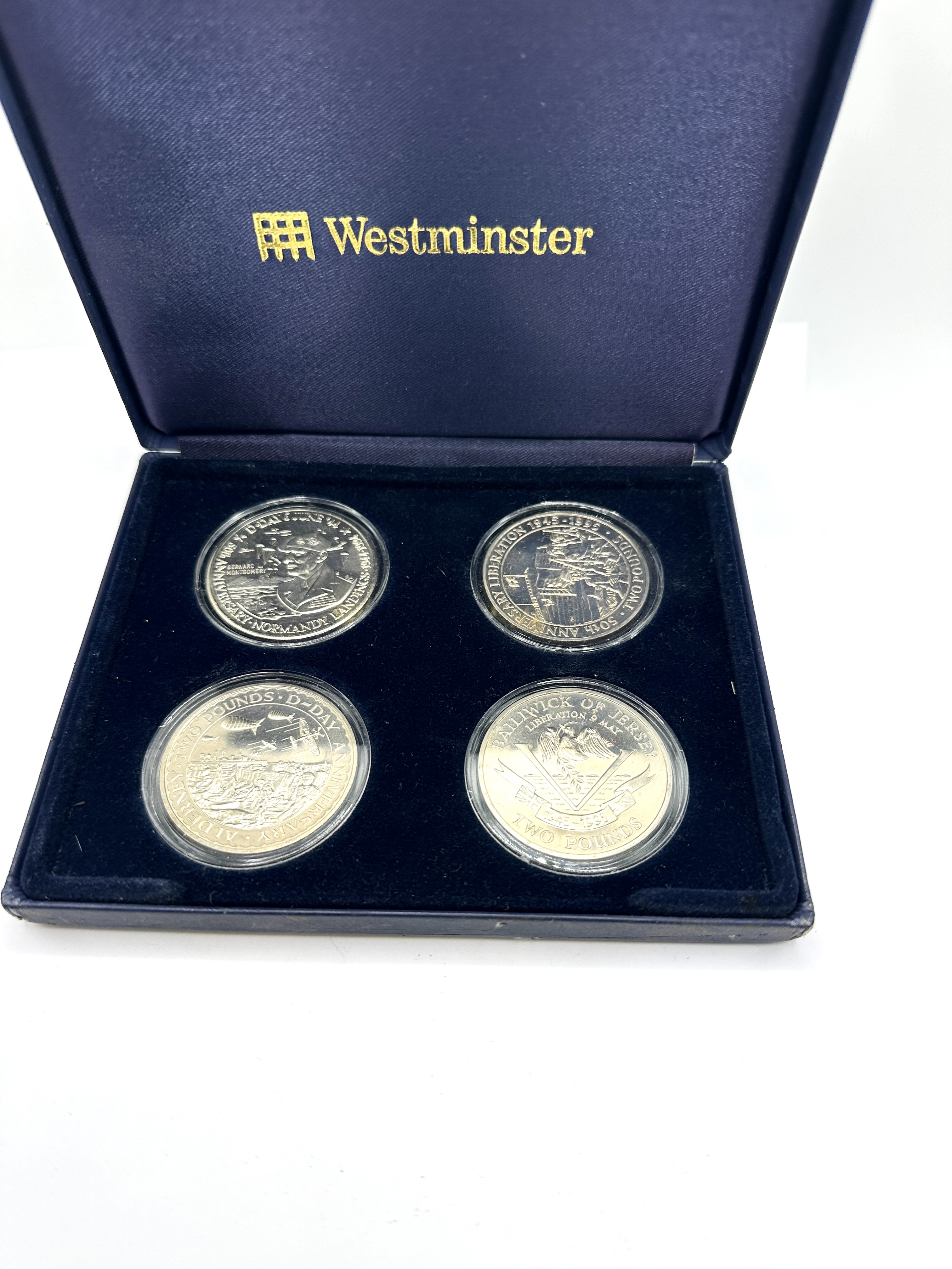 A collection of commemorative Two Pound coins issued by the Bailiwick of Jersey and Alderney, presented in a blue velvet-lined Westminster brand case. The coins are struck in white metal with a proof finish. The collection includes issues dated 1994 and 1995 commemorating the 50th anniversaries of D-Day and the Liberation. Each coin is housed in an individual clear plastic protective capsule. Inscriptions include Bernard Montgomery D-Day 50th Anniversary, Alderney D-Day Anniversary, Bailiwick of Jersey Liberation 1945-1995, and 50th Anniversary Liberation 1945-1995. The obverses traditionally feature the effigy of Queen Elizabeth II.