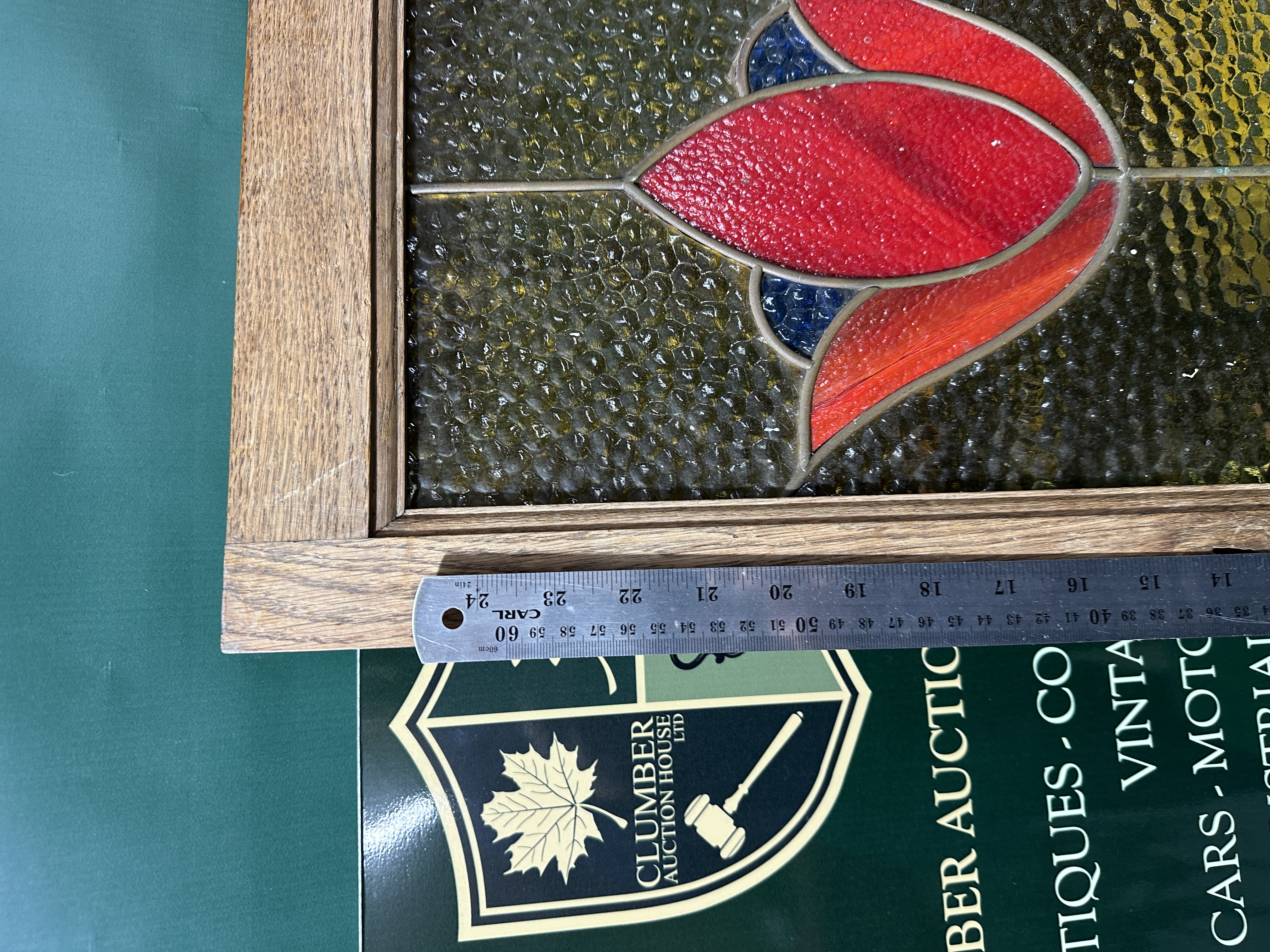 The glass panels are in good structural condition with no apparent cracks or missing segments. The lead cames show a natural aged patina and appear stable. The oak frames exhibit signs of wear, including surface scratches, scuffs, and some finish loss, consistent with age and previous installation. Some surface dust and grime are present.