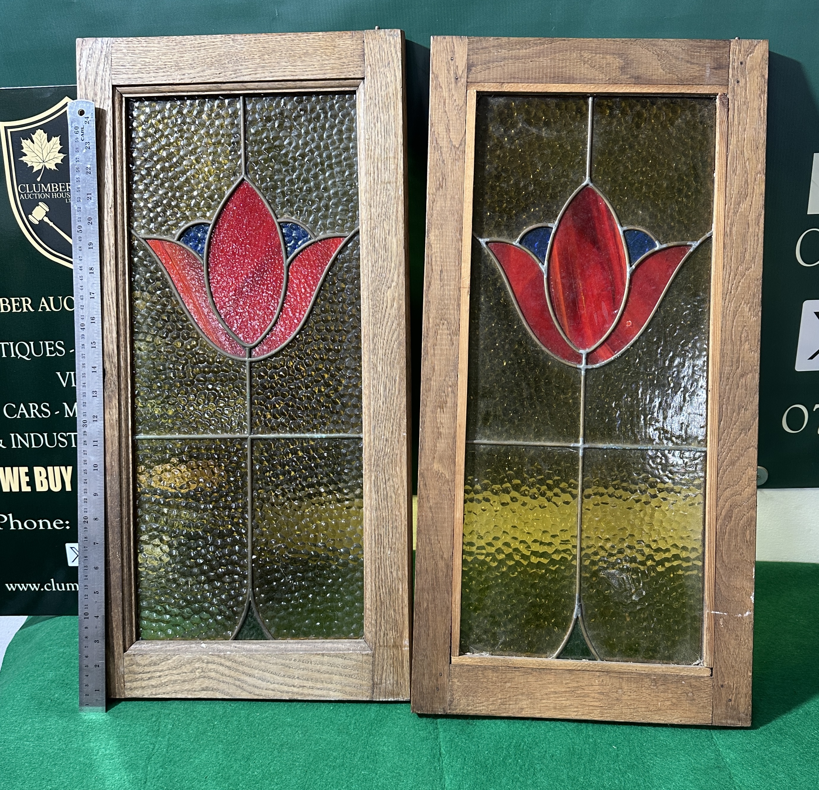 A pair of 20th-century leaded stained glass panels, likely originally intended for use in a cabinet or door. Each panel features a central stylised tulip motif composed of red and orange streaked glass with deep blue accents. The motif is set against a background of amber-tinted, hammered-texture cathedral glass. The panels are secured within simple rectangular oak frames. The construction follows traditional leaded techniques with various textured and coloured glass segments. No maker’s marks, signatures, or labels are visible on the glass or the wooden frames. These panels are characteristic of British residential glass from the late Victorian or Edwardian periods, circa 1900 to 1915.