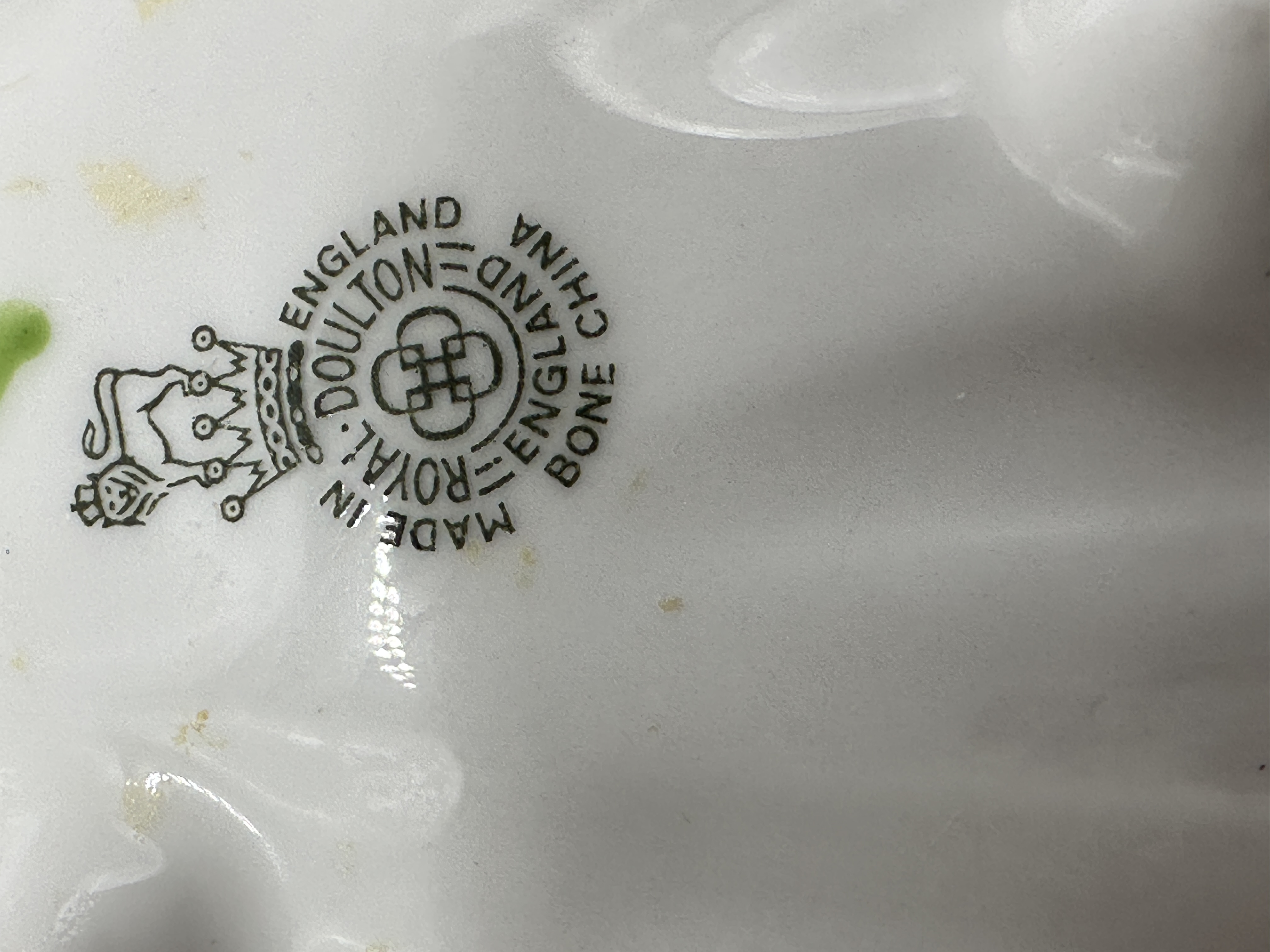 A collection of decorative fairy or cherub ornaments, each depicting a young child in various poses including seated, reclining, and lying prone. The figures are positioned on bases shaped like broad leaves. Each ornament is crafted from a cold-cast resin or composite material with a matte, hand-painted finish. The figures wear textured outfits and matching bonnets, all detailed with glitter accents. Each figure features a pair of wire-framed, glittered mesh wings. The ornaments are fitted with gold-tone hanging cords and circular gold-coloured cardboard tags. Similar items are frequently attributed to the Giovanni Collection by Turtle King Corp or the New Century series. Note: An image of a Royal Doulton bone china backstamp is included in the documentation; however, this mark corresponds to a glazed ceramic surface and does not belong to these resin figurines, which are of unknown manufacture.