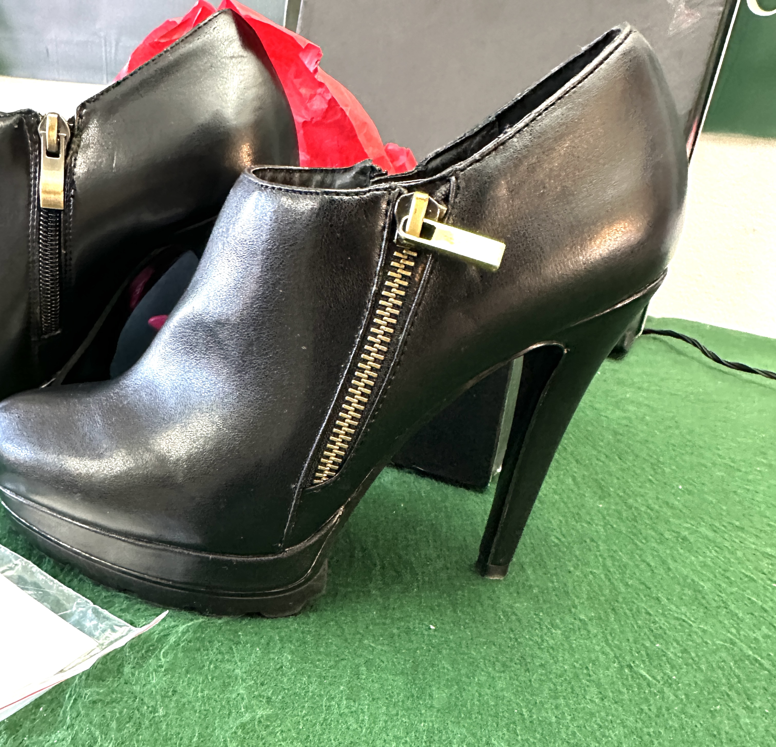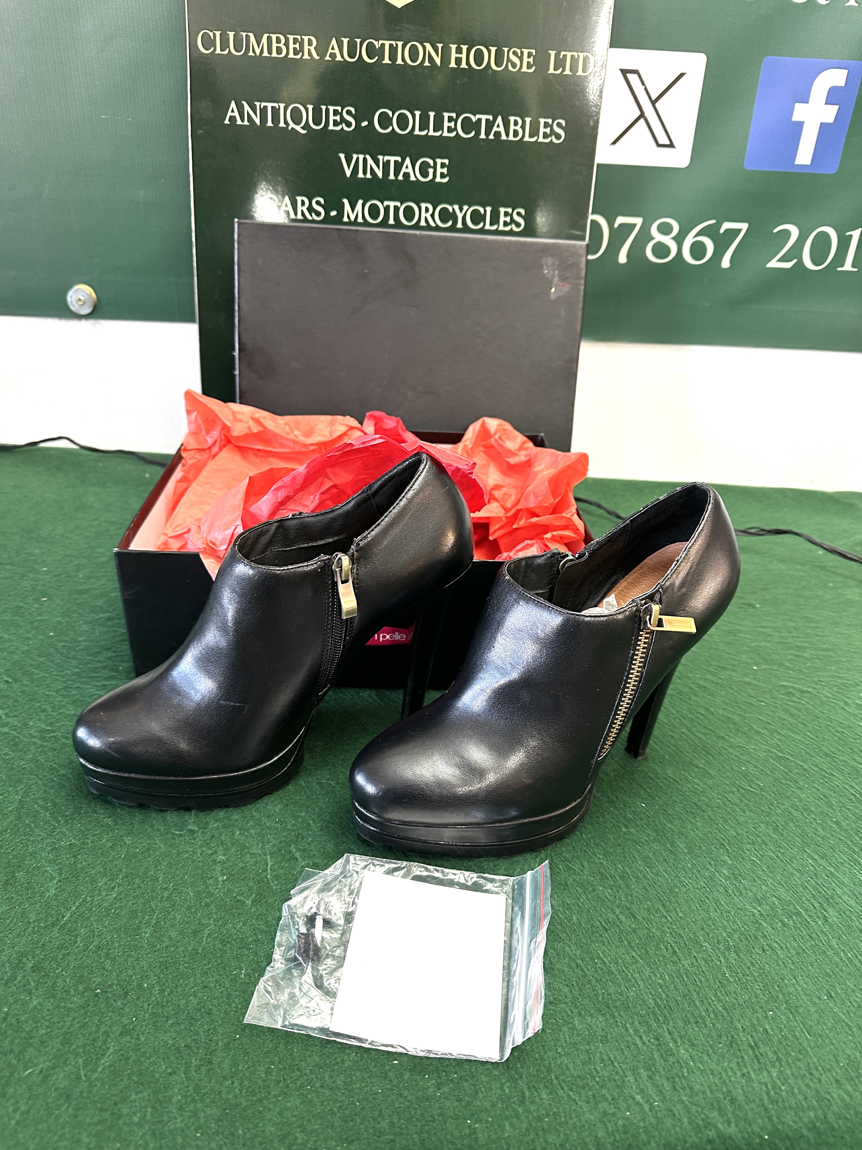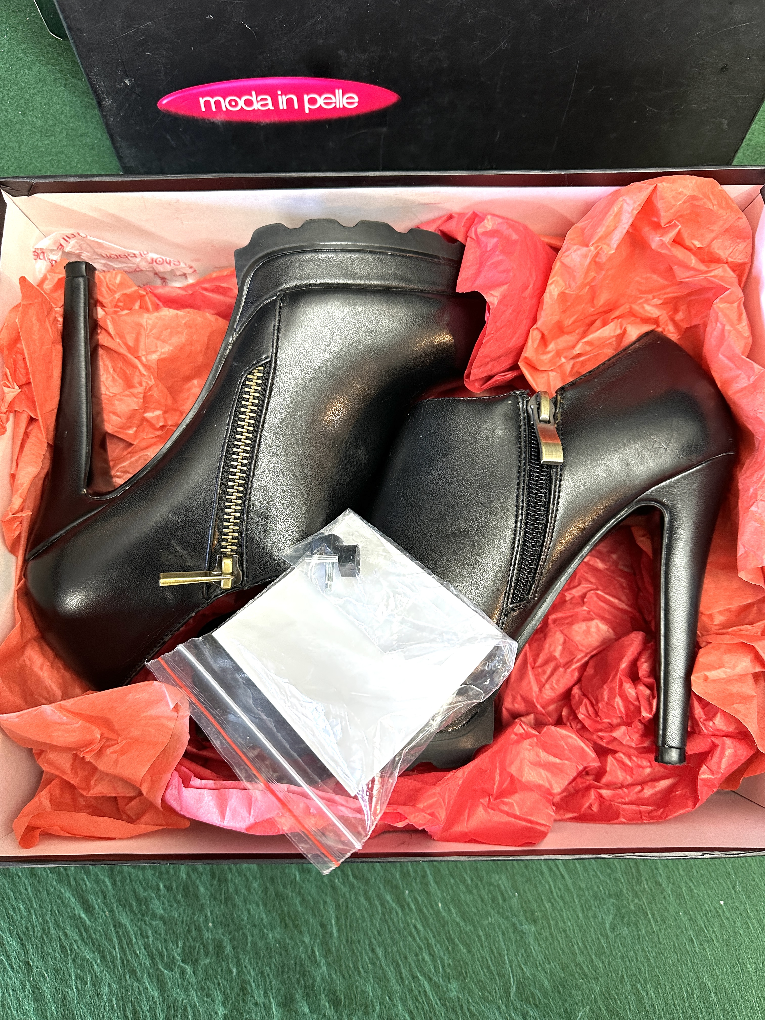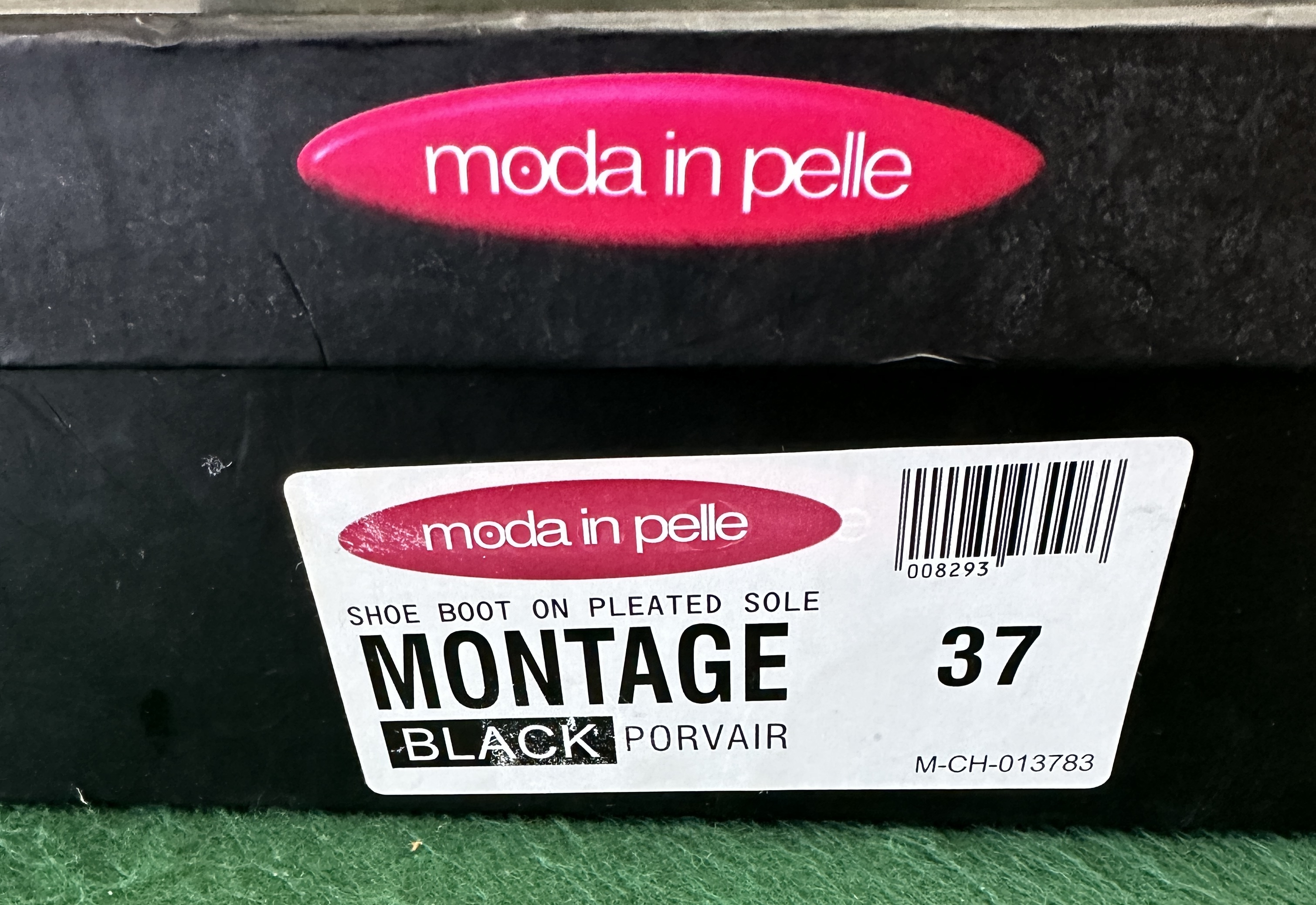 A pair of ankle-height shoe boots by the British brand Moda in Pelle, model Montage. The uppers are constructed from black Porvair, a breathable synthetic leather substitute. The design features an almond-shaped toe and a high stiletto heel. The boots are built on a platform sole with a pleated lugged tread pattern. Each boot is fitted with a side zip closure featuring a large, rectangular gold-tone metal pull. The interior is lined with a tan-coloured material. The items are housed in their original black branded box with red tissue paper and include a small plastic bag containing two replacement heel tips.