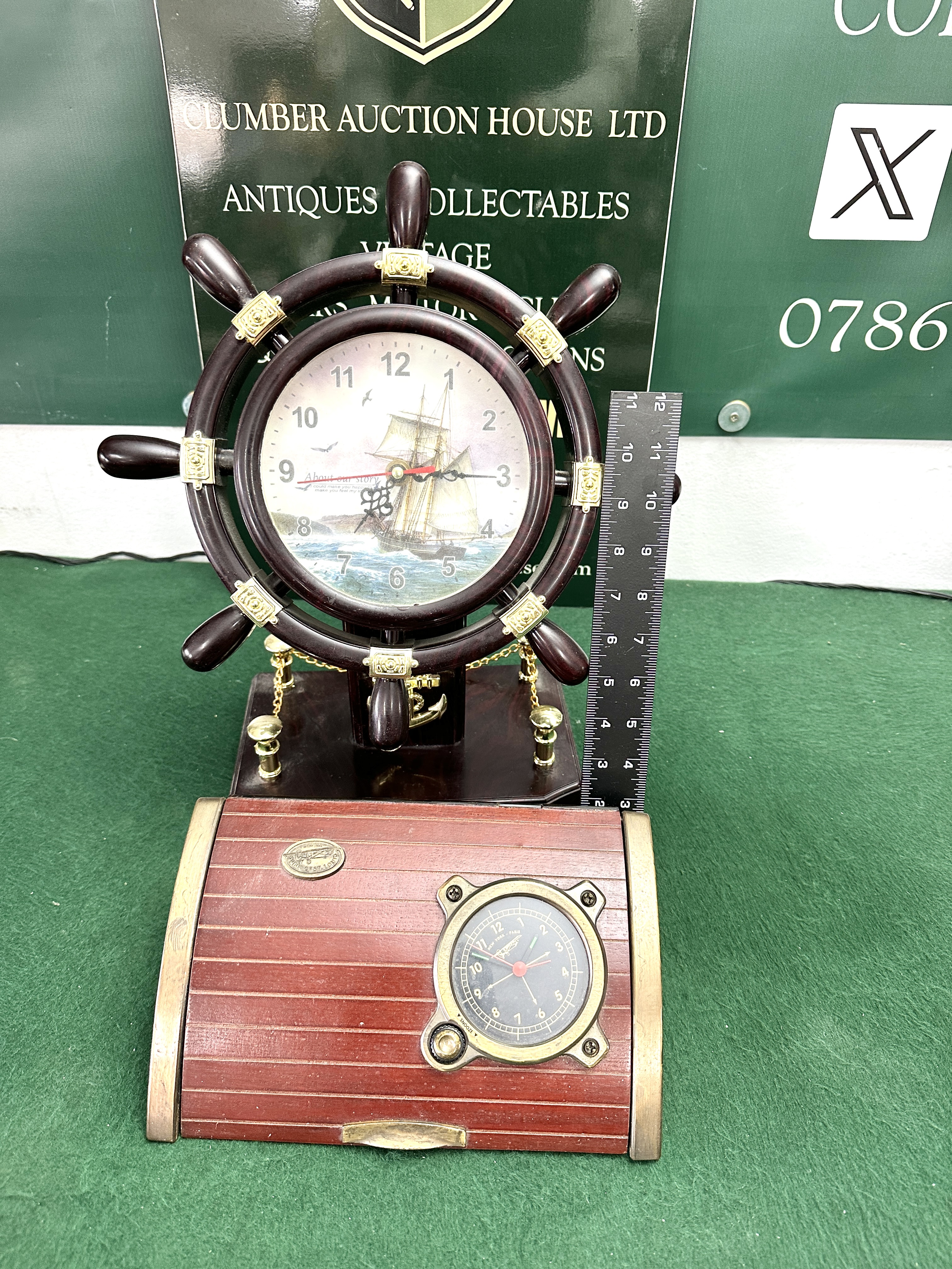 A contemporary nautical-themed novelty mantel clock and desk stationery set. The case is constructed from a dark wood-effect composite material with a polished finish, featuring brass-toned metal and plastic accents including a ship’s wheel frame, decorative anchor, and chains. The primary clock is set within the ship’s wheel and features a dial illustrated with a sailing ship at sea. The dial includes black Arabic numerals, ornate black hour and minute hands, a red sweep seconds hand, and decorative text reading About our story could make you happy make you feel my love. The base of the unit consists of a hinged stationery compartment designed to hold pens and small desk items. Set into the lid of this compartment is a secondary smaller clock with a black dial, white Arabic numerals, and a stylised world map background marked with New York, Paris, and London. Both timepieces utilise quartz battery-powered movements. The smaller clock includes an integrated alarm function with an On/Off switch located on the reverse of the housing.
