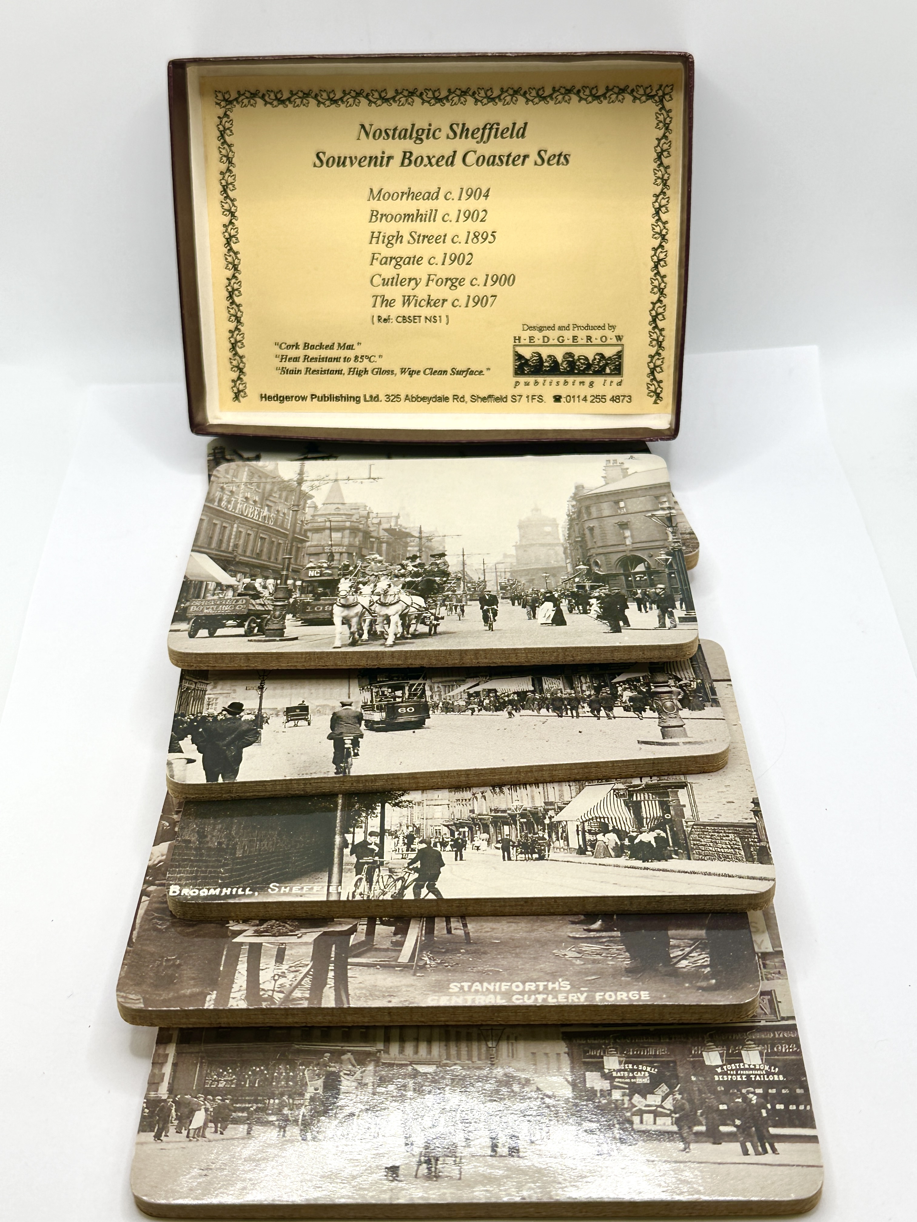 A set of souvenir coasters titled Nostalgic Sheffield, produced by Hedgerow Publishing Ltd of 325 Abbeydale Road, Sheffield (Reference: CBSET NS1). Each coaster features a high-gloss, heat-resistant upper surface printed with a sepia-toned historical photographic scene of Sheffield. The collection includes depictions of Moorhead c. 1904, Broomhill c. 1902, High Street c. 1895, Fargate c. 1902, Cutlery Forge c. 1900, and The Wicker c. 1907. The coasters are cork-backed for surface protection. The set is housed in its original manufacturer box lid, which displays the maker logo and local Sheffield contact information.