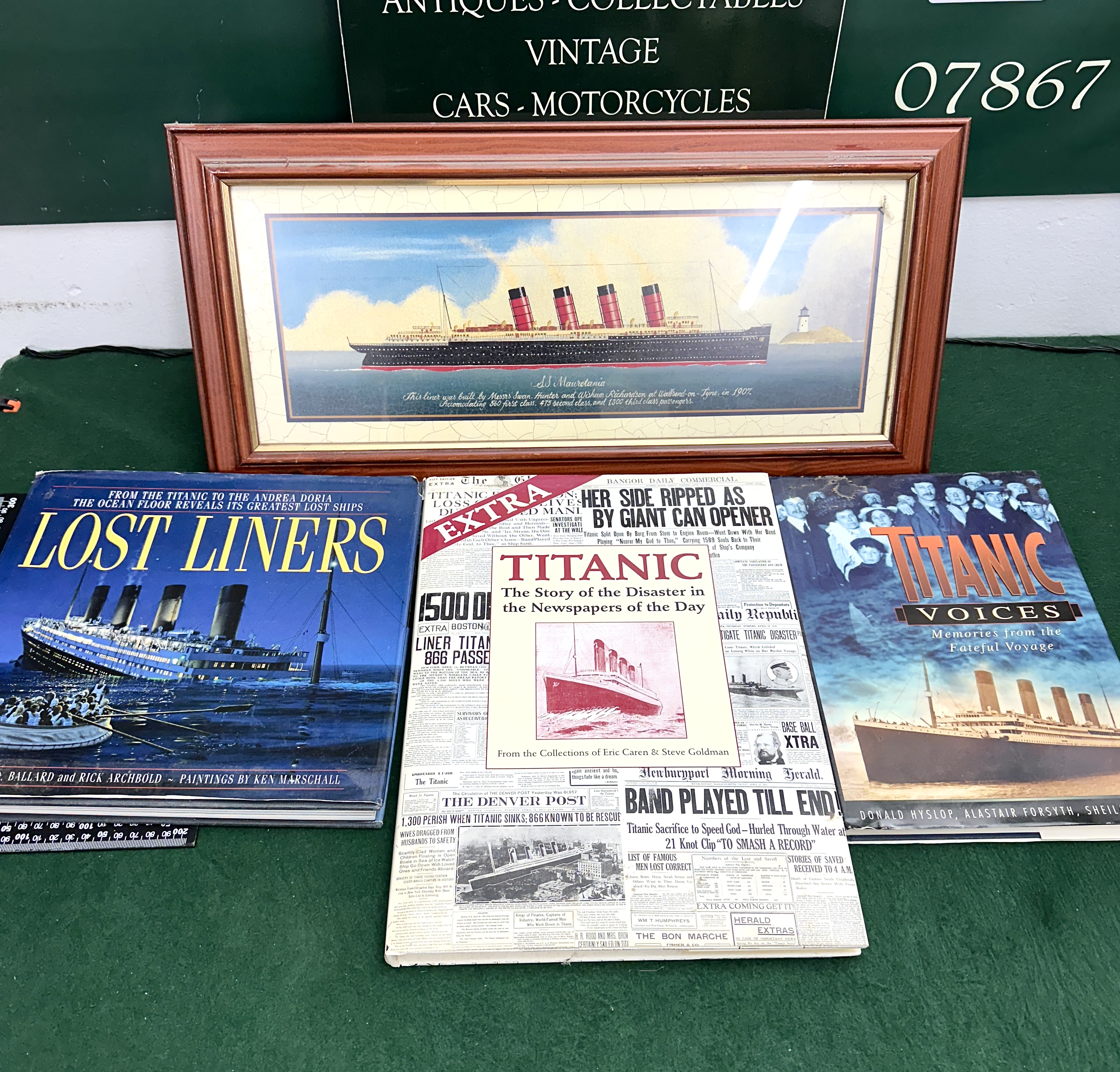 A collection of three publications and one framed print relating to historical ocean liners. The first volume is Lost Liners: From the Titanic to the Andrea Doria, the Ocean Floor Reveals its Greatest Lost Ships by Robert D. Ballard and Rick Archbold, featuring illustrations by Ken Marschall, published by Seven Dials, circa 1997. This is a large format hardcover with a dust jacket. The second publication is Titanic: The Story of the Disaster in the Newspapers of the Day by Eric Caren and Steve Goldman, published by Castle Books, which is an oversized softcover compilation of historical newspaper reprints. The third book is Titanic Voices: Memories from the Fateful Voyage by Donald Hyslop, Alastair Forsyth, and Sheila Jemima, published by Sutton Publishing in association with Southampton City Council, circa 1994, in a large format softcover format. The framed commemorative colour print depicts the Cunard liner SS Mauretania at sea with four funnels. Below the image, the text reads SS Mauretania in cursive script, followed by a description of its construction by Messrs Swan, Hunter and Wigham Richardson at Wallsend-on-Tyne in 1907 and its passenger capacity. The print is mounted in a cream-coloured mat and housed in a mahogany-finish wooden frame with a gold-tone inner slip.
