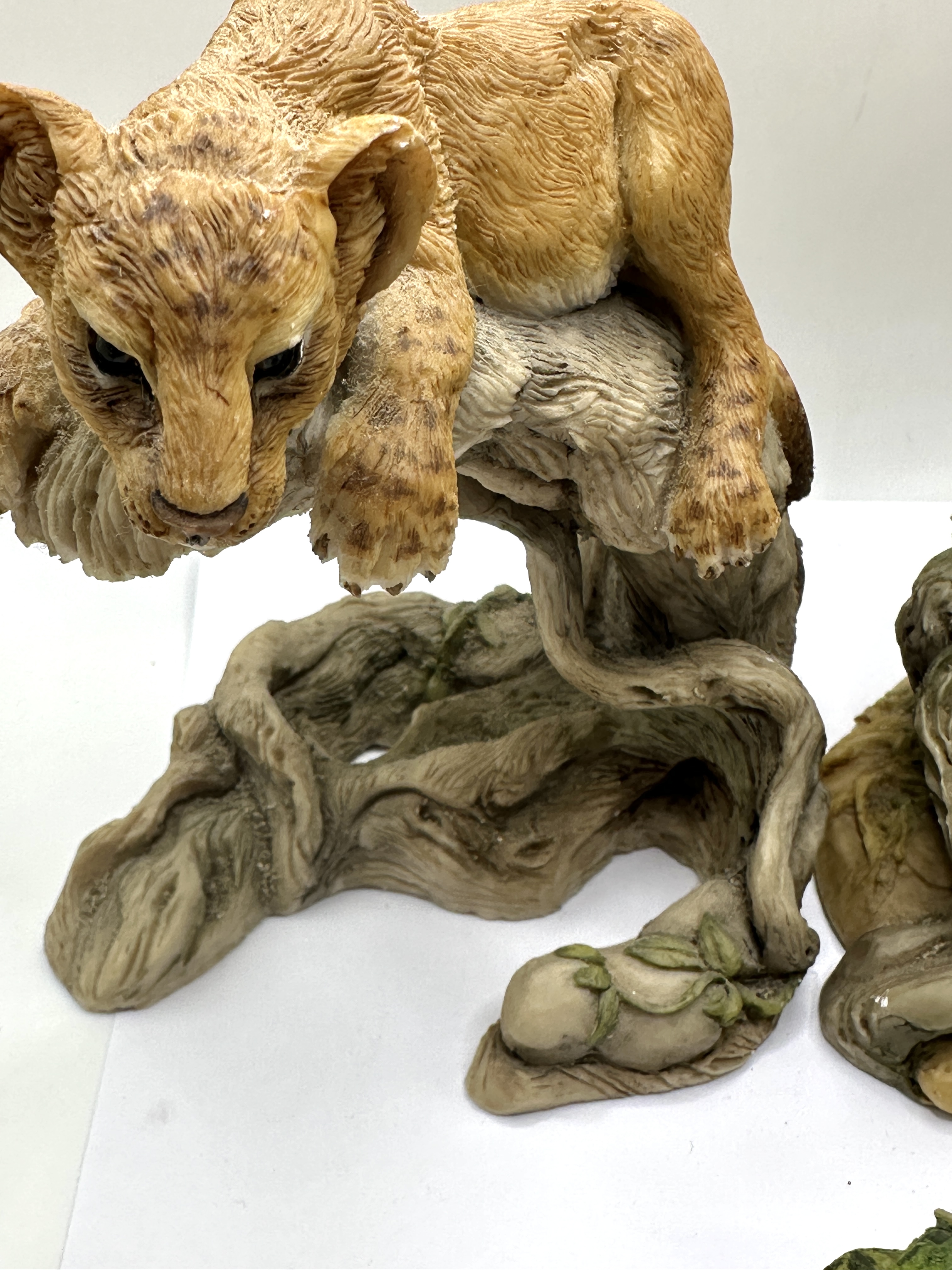 A collection of cast resin figurines comprising three wildlife studies and one novelty maritime piece. The wildlife studies include a leopard cub perched on a gnarled branch, a lion cub draped over a branch in a relaxed pose, and a frog resting on a rocky base. Each figurine is hand-painted with realistic textures and naturalistic colours to simulate fur and skin. The novelty piece depicts a bearded sea captain at a ship’s steering wheel, designed as a bottle holder. This item contains a bottle of Old Smuggler Blended Scotch Whisky. No manufacturer marks, signatures, or factory stamps are visible on the exterior of the resin figurines. The whisky bottle features the embossed word Established on the glass, a neck seal printed with the text Afore ye go, and a primary label for Old Smuggler Blended Scotch Whisky.