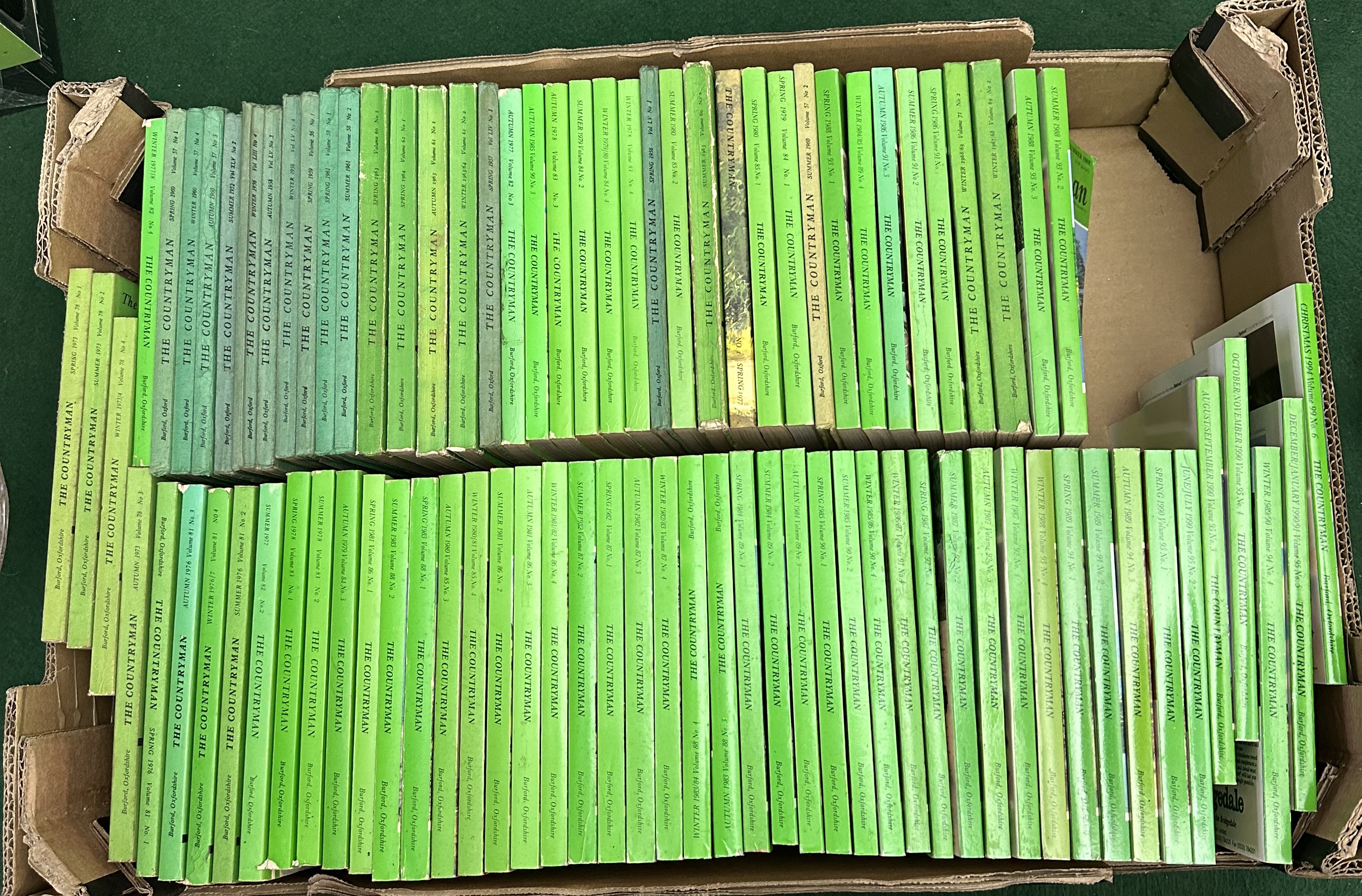 This collection comprises approximately 85 issues of The Countryman, a quarterly magazine published in Burford, Oxfordshire. The periodicals are bound in their original softcover paperback format, featuring the publication’s characteristic green spines. The collection spans a broad date range from the late 1950s through to the mid-1990s. Specific issues identified by their spine markings include Winter 1957 (Volume 55 Number 4), Spring 1958 (Volume LV Number 1), Spring 1960 (Volume 57 Number 1), Spring 1973 (Volume 78 Number 1), Winter 1978 (Volume LV Number 4), Summer 1985 (Volume 90 Number 2), and the Christmas 1994 (Volume 99 Number 6) edition. The spines consistently display the title in capital letters followed by the season, year, volume, and issue number, alongside the publishing location of Burford, Oxfordshire.