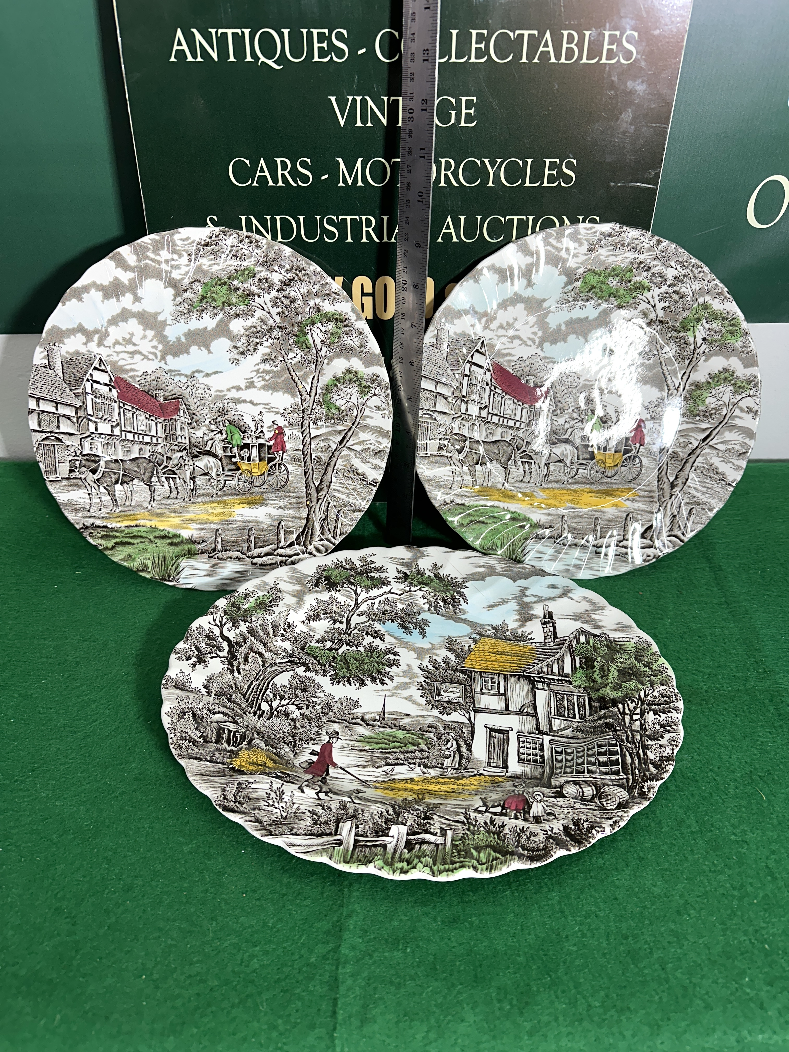 This lot comprises three pieces of Staffordshire earthenware manufactured by Myott, Son & Co. Ltd. The collection includes two circular dinner plates and one oval serving platter, all featuring scalloped rims. The decoration consists of sepia-toned transfer-printed scenes with hand-applied permanent colours in red, green, yellow, and blue. The two dinner plates feature the Royal Mail pattern, depicting a traditional English stagecoach arriving at a half-timbered inn. The oval platter features The Hunter pattern, showing a rural scene with a hunter and his dog in the foreground and a village inn titled The Swan in the background. The bases of the dinner plates bear a black printed mark with the text MYOTT ROYAL MAIL, a stagecoach illustration, and the inscription A GENUINE HAND ENGRAVING FINE STAFFORDSHIRE WARE WITH ALL PERMANENT COLOURS MADE IN ENGLAND. Small hand-painted red characters are also present. The platter base features a foliate-bordered mark reading THE HUNTER by MYOTT with an illustration of a man and dog, and the text HAND ENGRAVED PERMANENT COLOURS MADE IN ENGLAND, accompanied by a hand-painted green character.