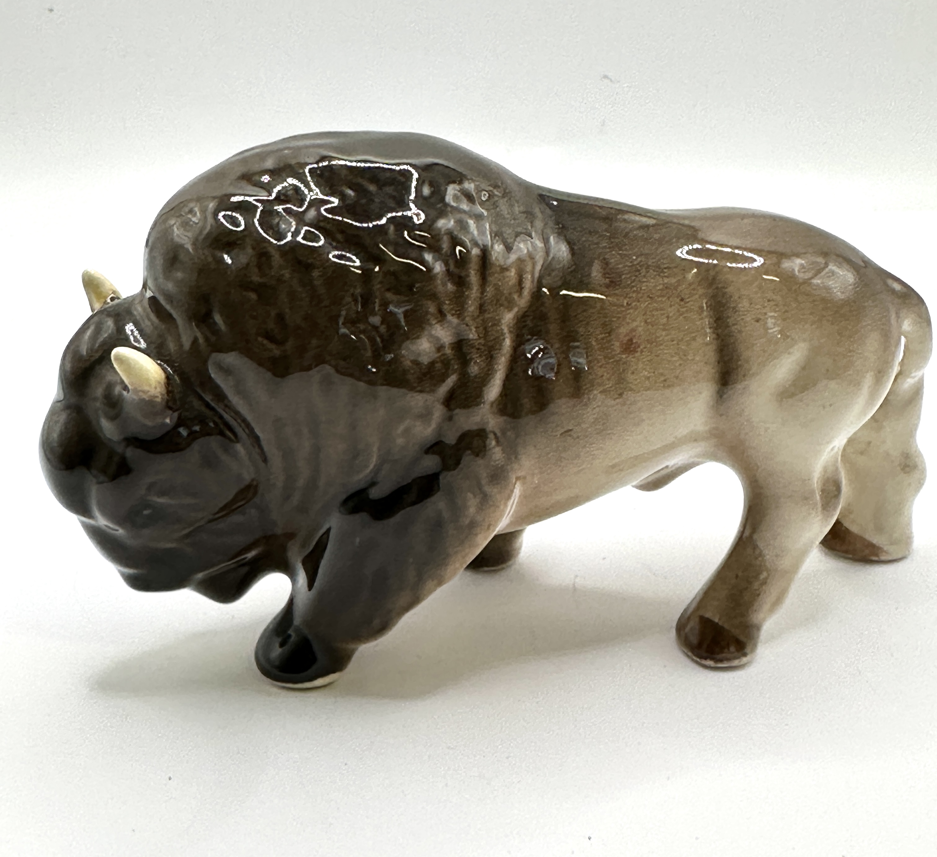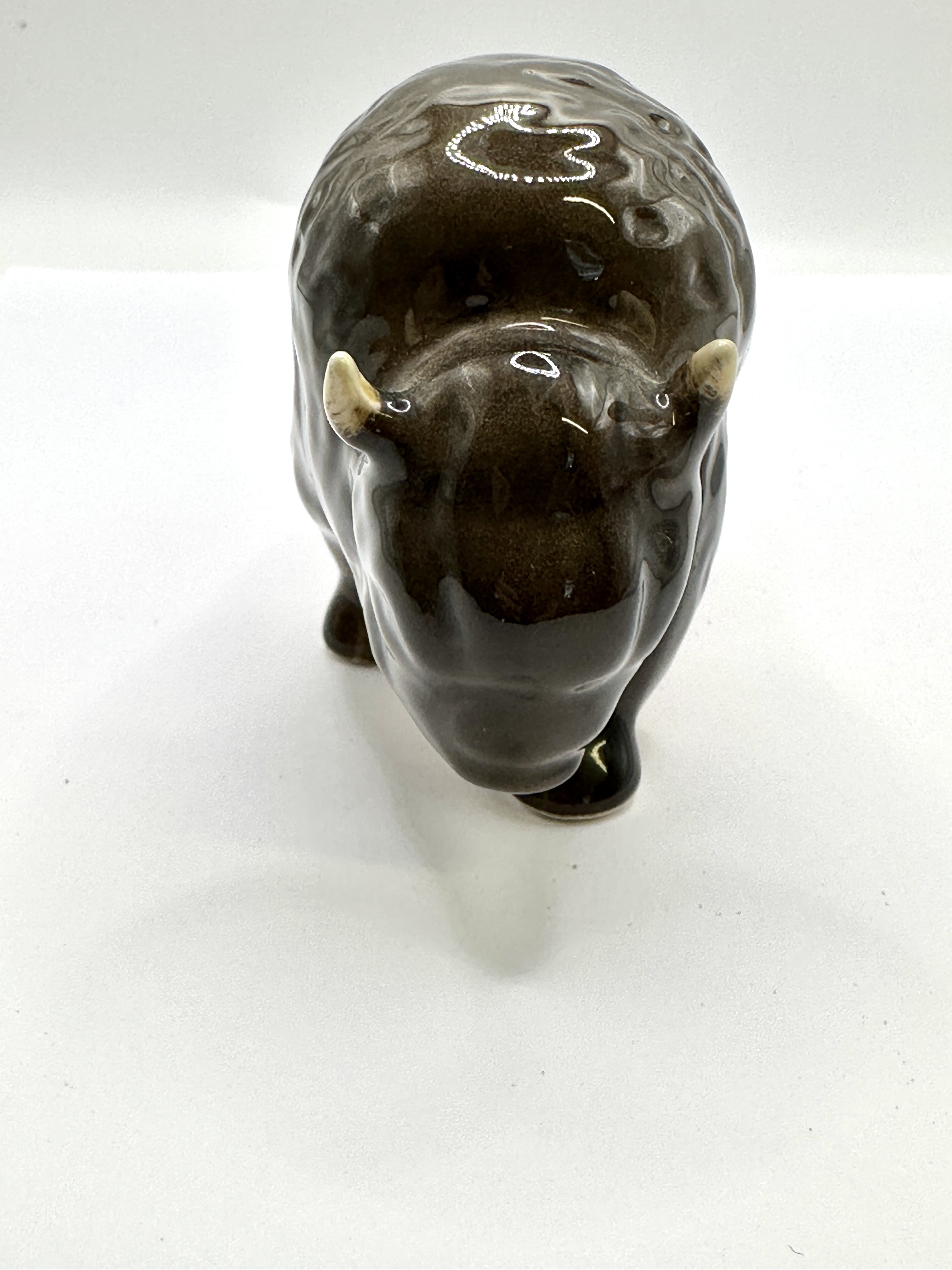 A ceramic figurine of an American bison, attributed to Melba Ware, England. The animal is modelled in a dynamic, forward-leaning posture with its head lowered. The piece features a glossy glaze in a tonal brown colour palette, with dark chocolate brown on the head and forelegs transitioning to a lighter, sandy brown on the hindquarters. The horns are finished in a contrasting off-white glaze. The front quarters and head feature a moulded, textured finish to represent the thick mane, while the rear is smooth. No maker’s marks or signatures are visible on the exterior of the piece.