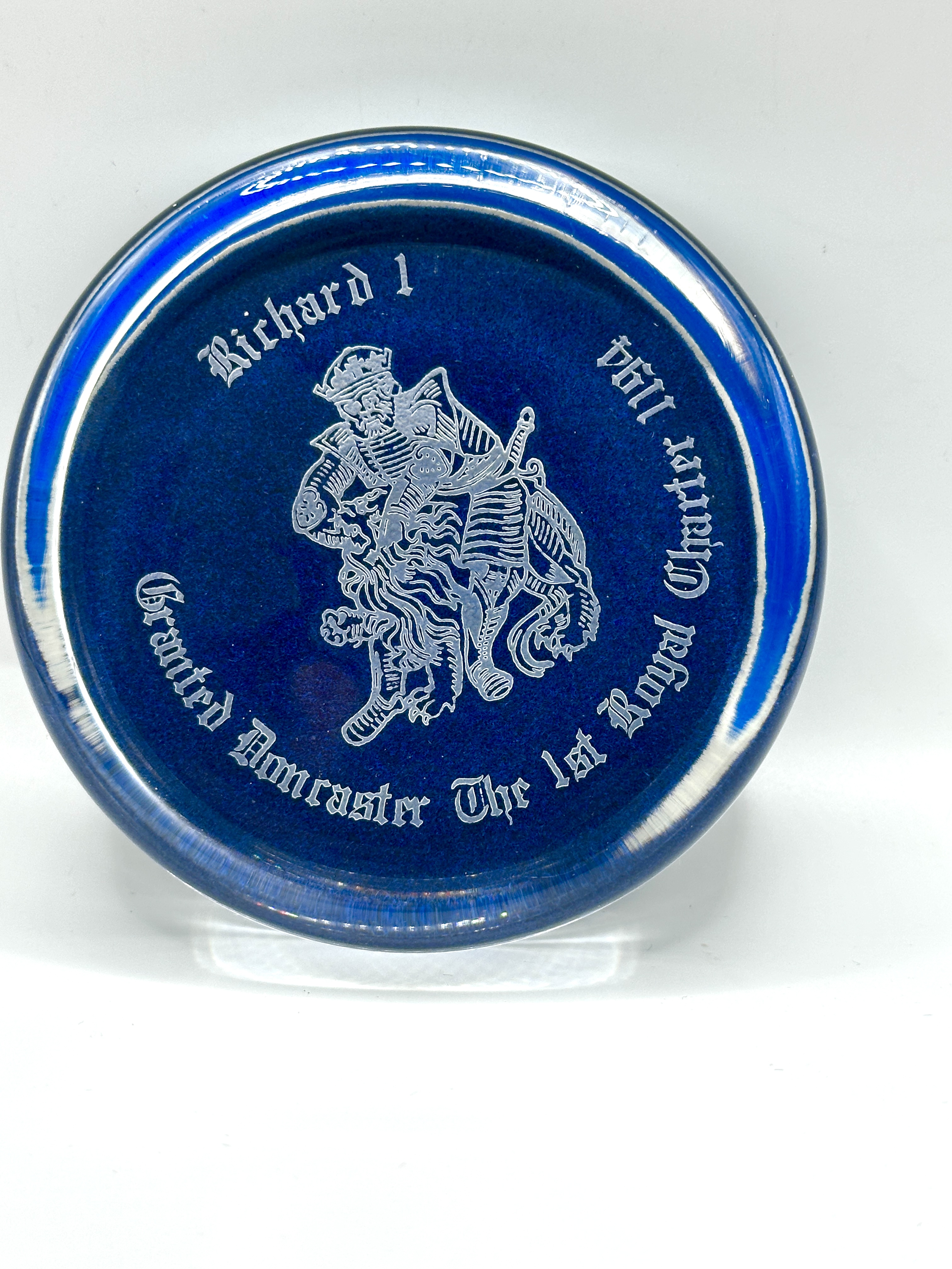 A circular commemorative glass paperweight produced by Daphne Pain Paperweights of Wiltshire. The piece is constructed from clear cast glass with a deep cobalt blue base layer. The internal shoulder of the weight features blue and white swirling ribbon motifs. The upper surface is decorated with a sandblasted etched design depicting King Richard I and a lion. The face is inscribed in Gothic script with the text Richard I and Granted Doncaster The 1st Royal Charter 1194. The item is accompanied by its original red cardboard presentation box with a foam insert and a trade card for the maker.