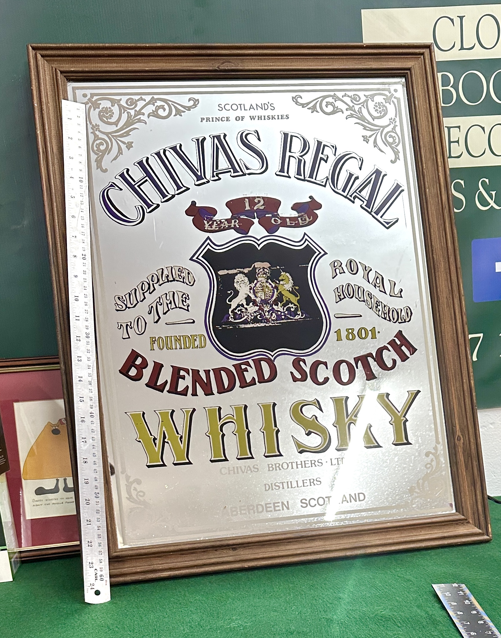 A mid-to-late 20th-century advertising mirror for Chivas Regal Blended Scotch Whisky. The mirror features multi-coloured graphic text and decorative scrollwork. The central design includes a coat of arms flanked by the phrases Supplied to the and Royal Household. Printed text includes Scotlands Prince of Whiskies, Chivas Regal, 12 Year Old, Founded 1801, and Blended Scotch Whisky. The base is marked Chivas Brothers Ltd Distillers Aberdeen Scotland. The glass is housed in a dark-stained wooden frame with a decorative fluted profile.