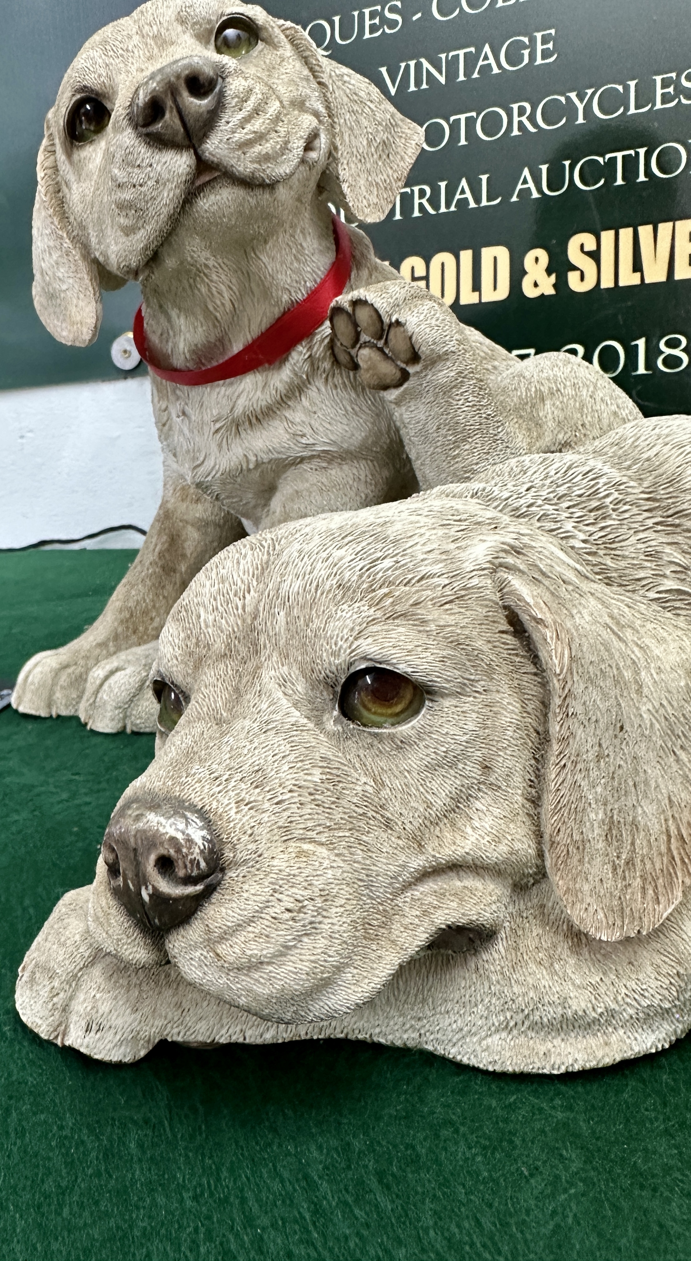 A pair of naturalist figurines depicting yellow Labrador Retriever puppies. The first figure is shown in a sitting position, scratching behind its ear with a hind leg and wearing a fixed red collar. The second figure is depicted in a recumbent pose with its head resting on its paws. Both items are constructed from a cast resin or composite material with a heavily textured surface designed to simulate fur. The eyes are inset with a glossy finish, while the noses and paw pads feature hand-painted details. The poses and finish are characteristic of sculptures produced by Sandicast, although no maker’s marks are visible on the exterior surfaces.