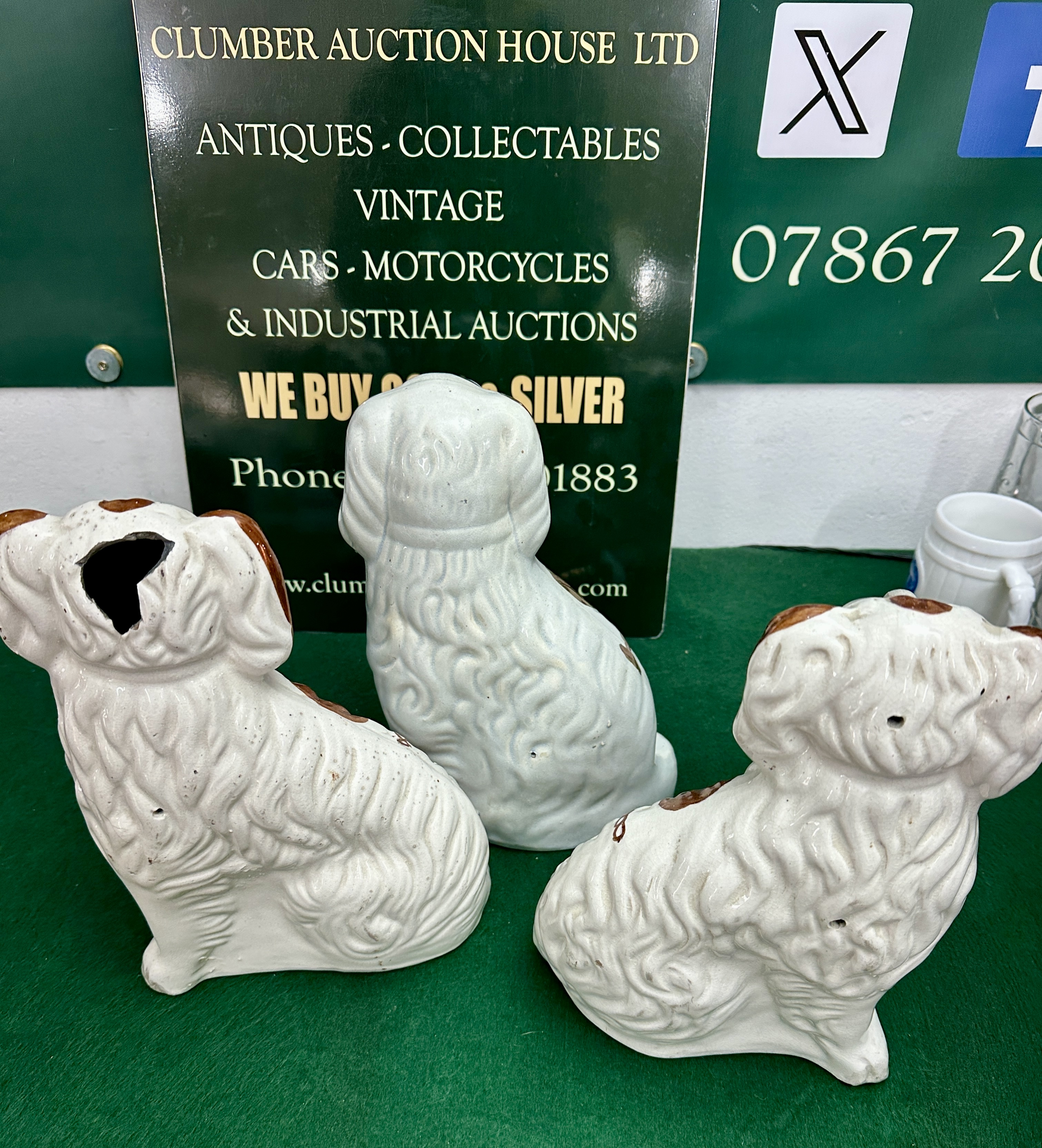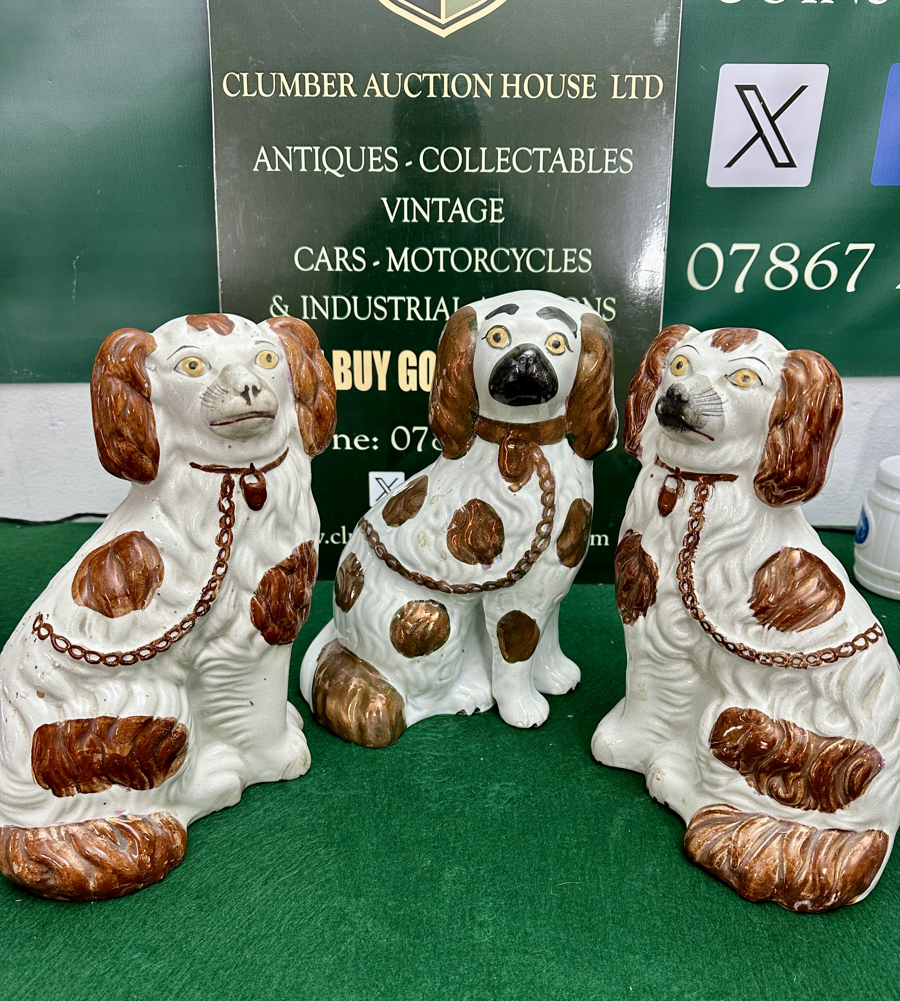 A trio of earthenware seated spaniel chimney ornaments, comprising a matched pair and a single figure, in the style of 19th-century Staffordshire potteries. Each figure is modelled in a seated position with textured fur, floppy ears, and a collar with an attached lead chain. The decoration consists of hand-applied copper lustre patches to the ears, body, and tail, with facial features including eyes and muzzles picked out in black pigment. The moulded collars and chains are also highlighted in copper lustre. The glaze on the central figure exhibits a more pronounced bluish-white tint compared to the outer pair. No factory marks or signatures are visible.