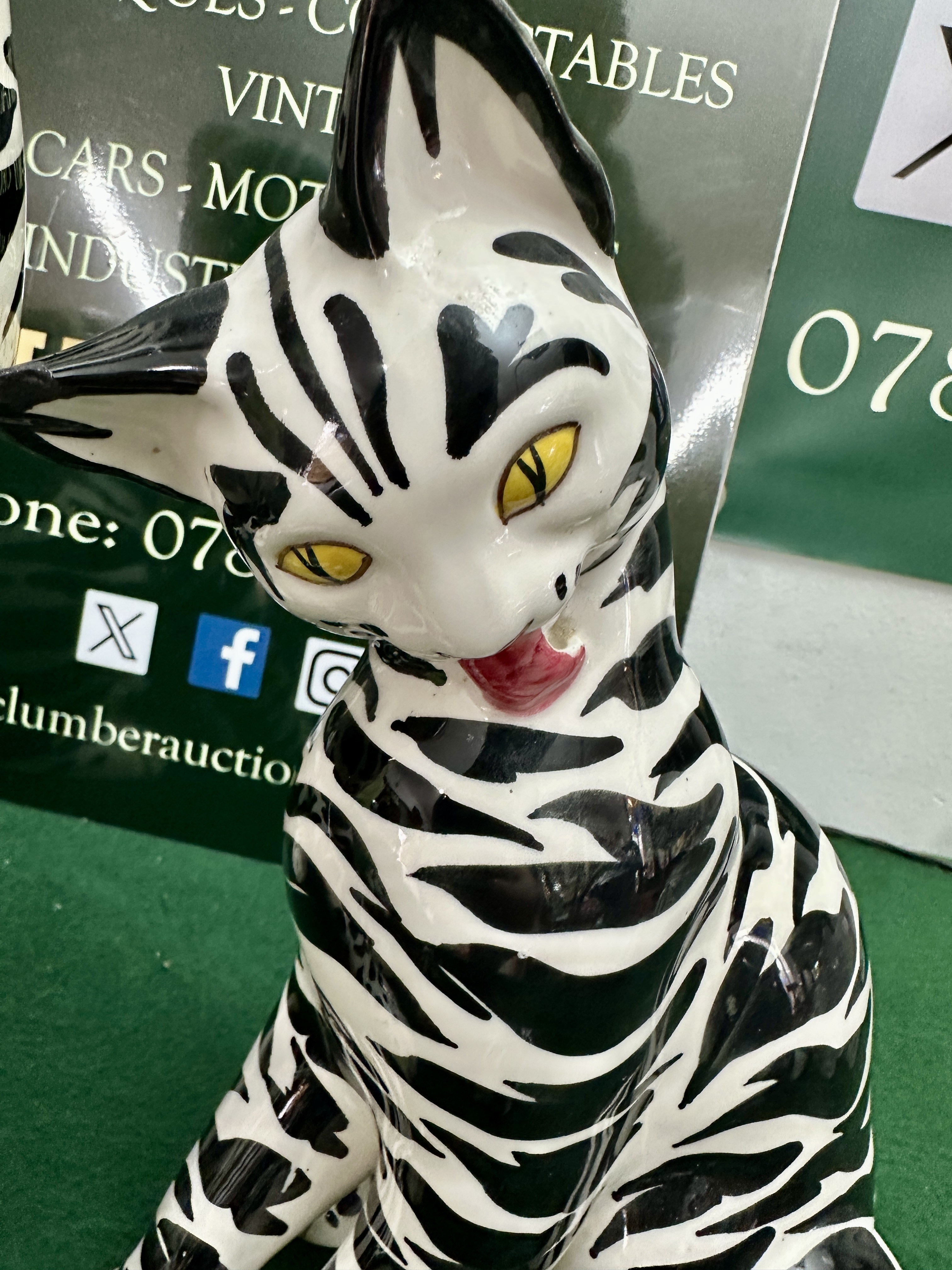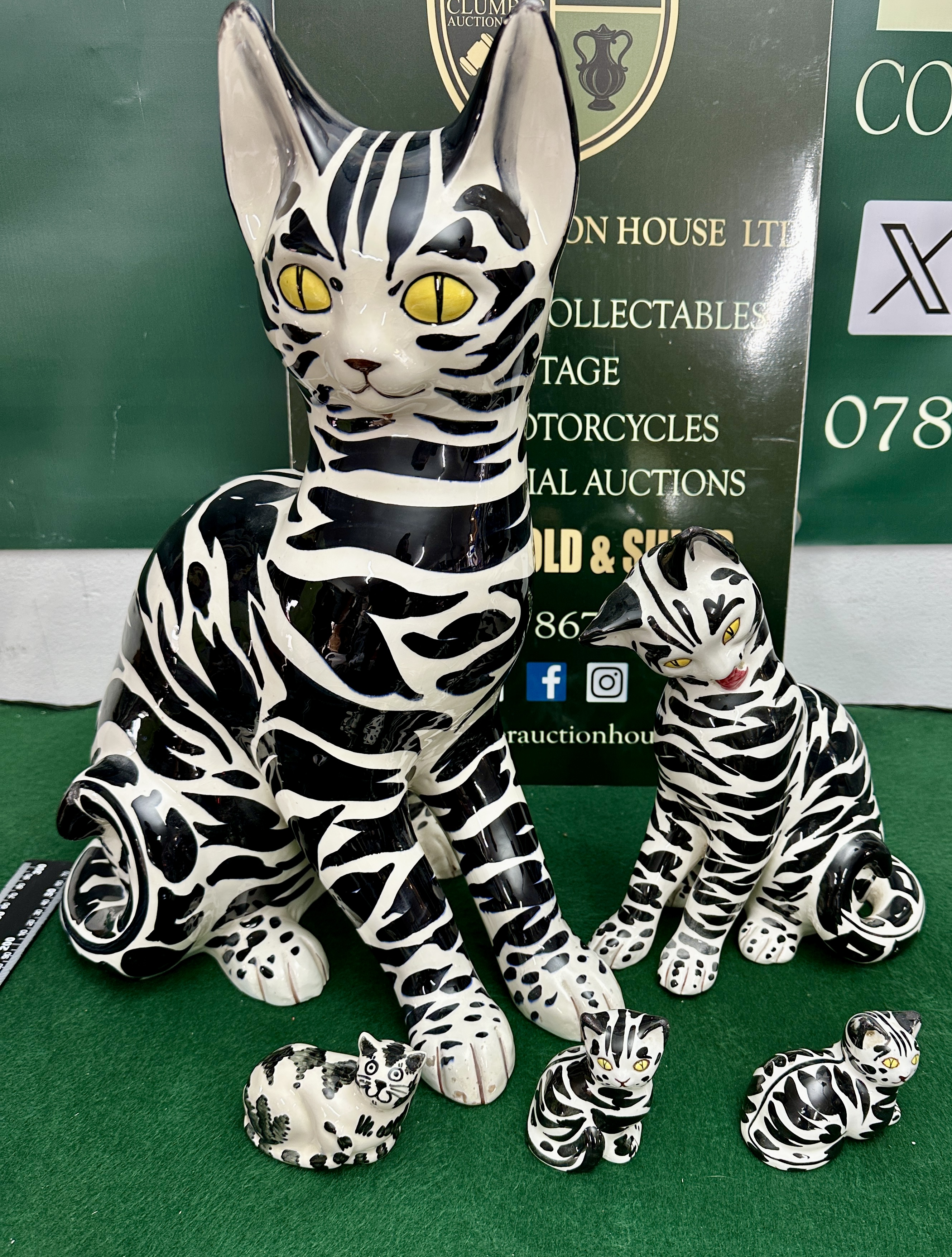 A collection of ceramic figurines depicting cats and kittens in various poses. The group includes a large seated cat, a medium-sized cat with a tilted head and protruding pink tongue, and several smaller kittens. Each piece is constructed from glazed ceramic with a high-gloss finish. The decorative scheme consists of hand-painted black zebra-style stripes over a white ground, with the exception of one kitten featuring a mottled spotted pattern. All figures are characterised by large yellow eyes with vertical black pupils. This style is closely associated with mid-20th-century Italian export pottery, often distributed by companies such as Raymor. No manufacturer marks, signatures, or factory stamps are visible on the exterior surfaces of the items.