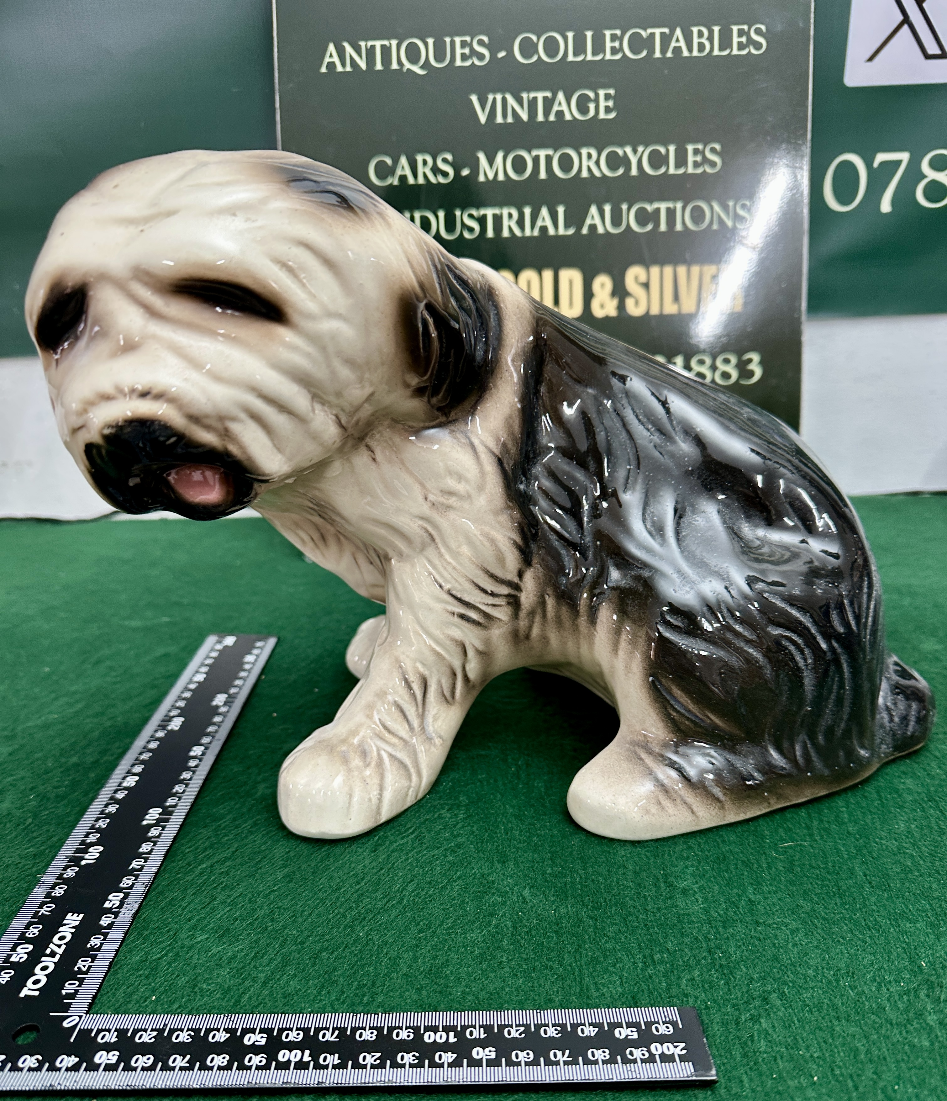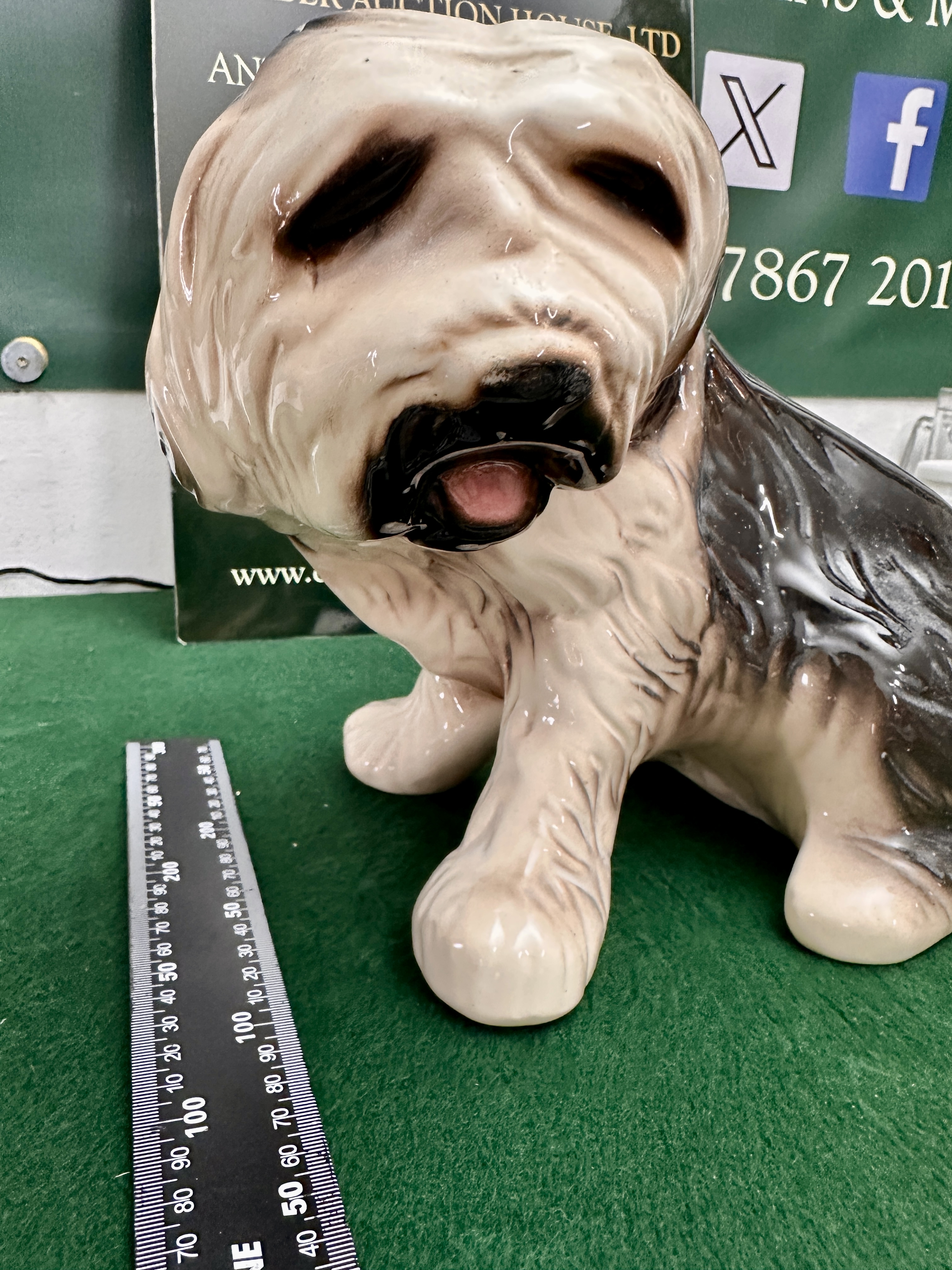 A large glazed ceramic figurine of an Old English Sheepdog, in the style of mid-20th-century British commercial potteries such as Coopercraft or Melba Ware. The dog is depicted in a seated position with the head turned slightly to the left and the mouth open to reveal a pink tongue. The piece features a textured surface to simulate the breed’s long coat. It is finished in a glossy glaze with a cream and white base for the head and forequarters, and dark grey and black patches on the body and ears. No factory marks, model numbers, or decorator signatures are visible on the base or body of the item.