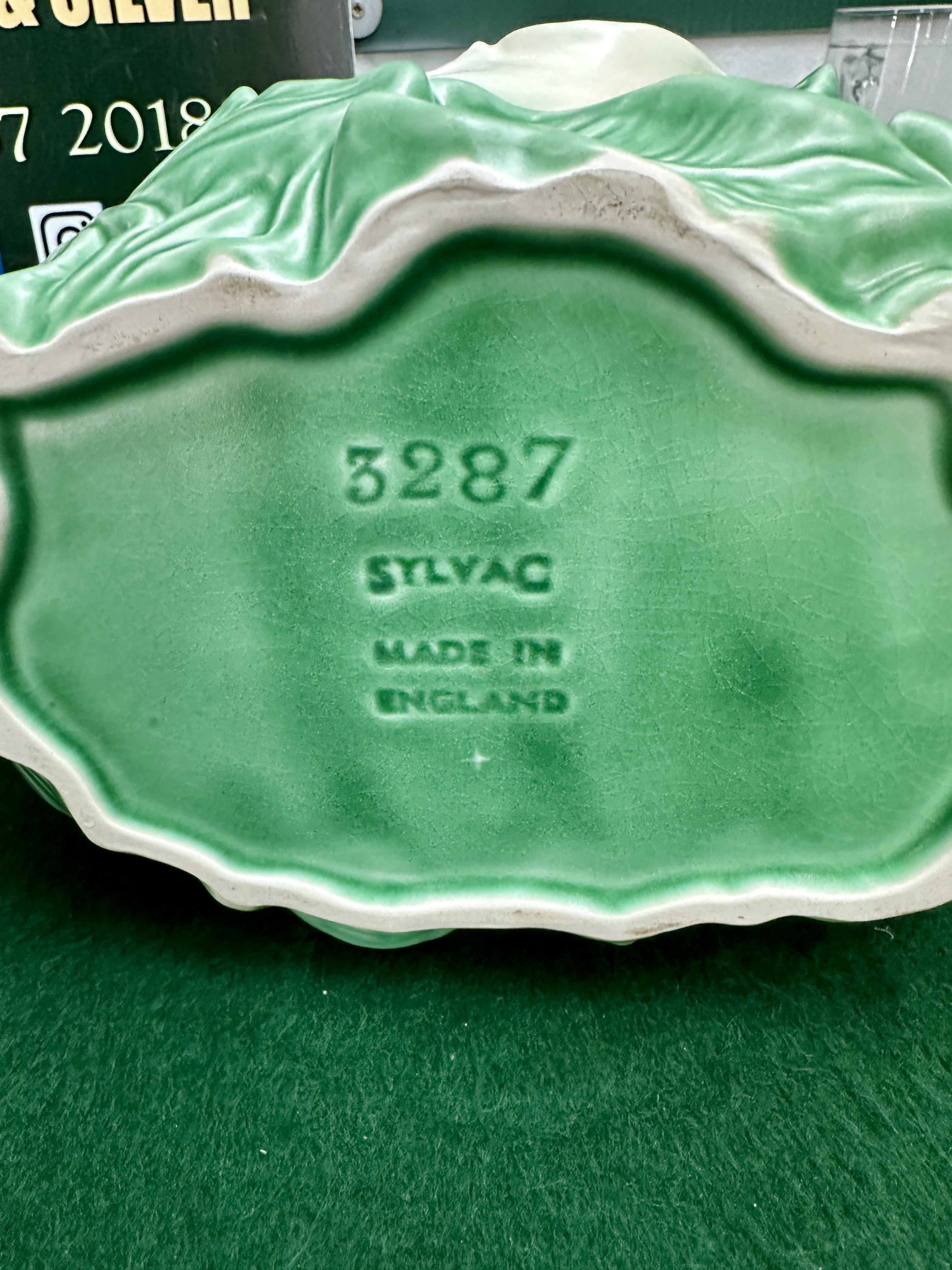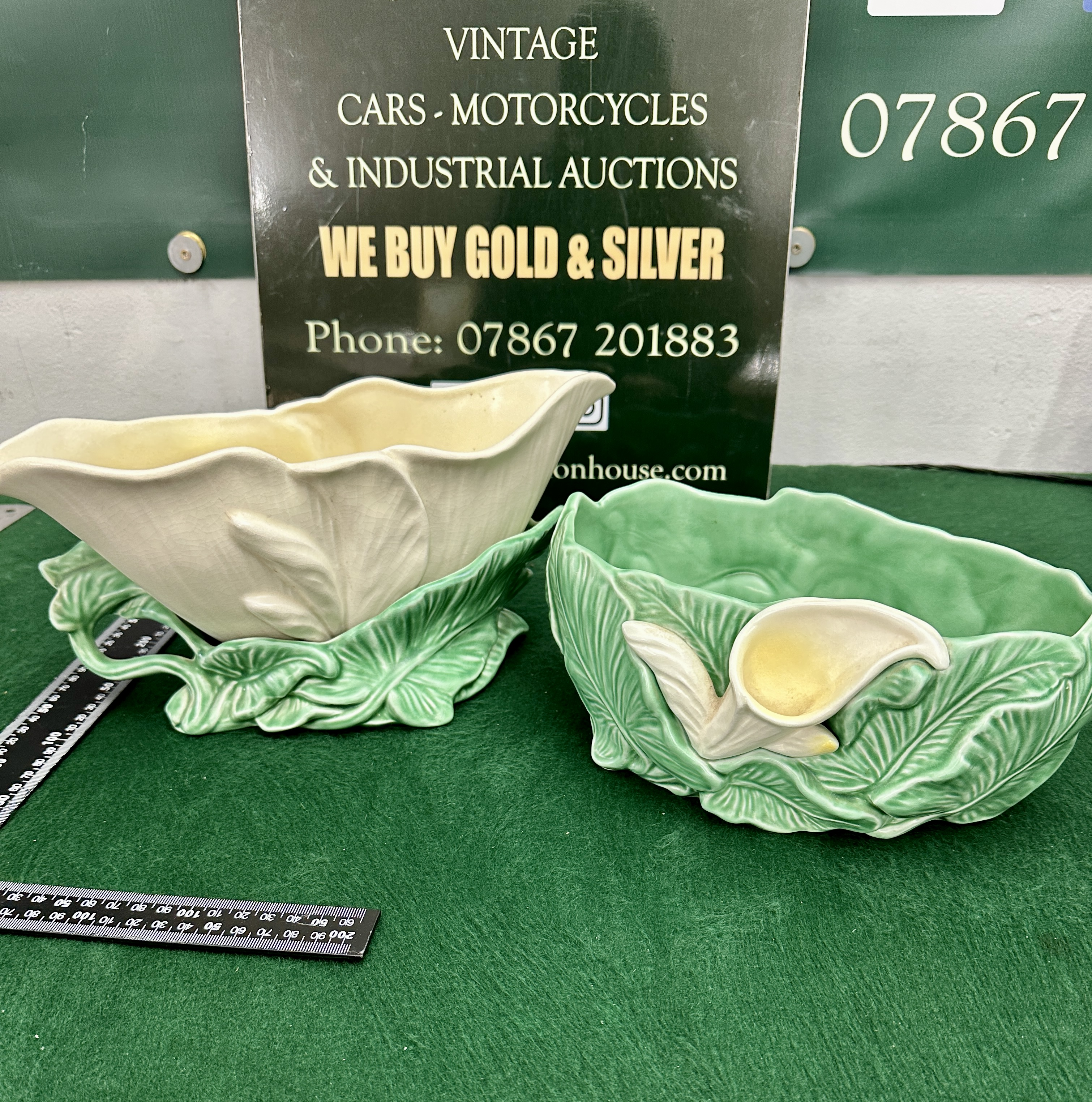 A pair of mid-20th-century British ceramic planters produced by Shaw and Copestake of Longton, Stoke-on-Trent. The first item is a horizontal trough-shaped foliate planter, model number 3290. It features a relief-moulded earthenware body with a two-tone glaze; the upper section is finished in a pale cream glaze, while the integral base is moulded as overlapping leaves and stems in a green glaze. The base is incised with 3290, SYLVAC, MADE IN ENGLAND, and additional marks 7 and |||. The second item is a rounded planter bowl, model number 3287, featuring a textured leaf exterior and interior in a green glaze. It is decorated with an applied high-relief white Arum Lily with yellow highlights to the front. The base is incised with 3287, SYLVAC, MADE IN ENGLAND.