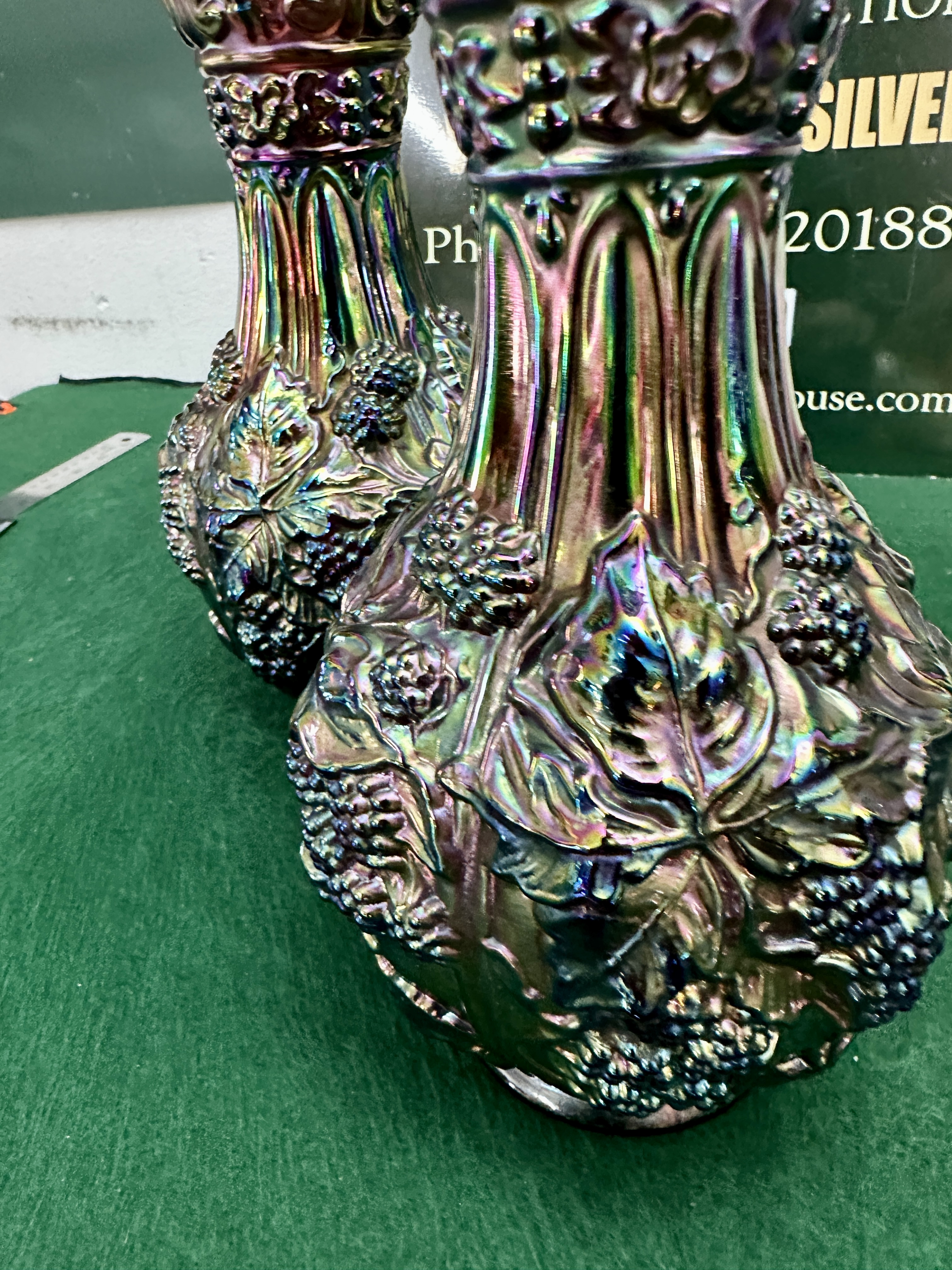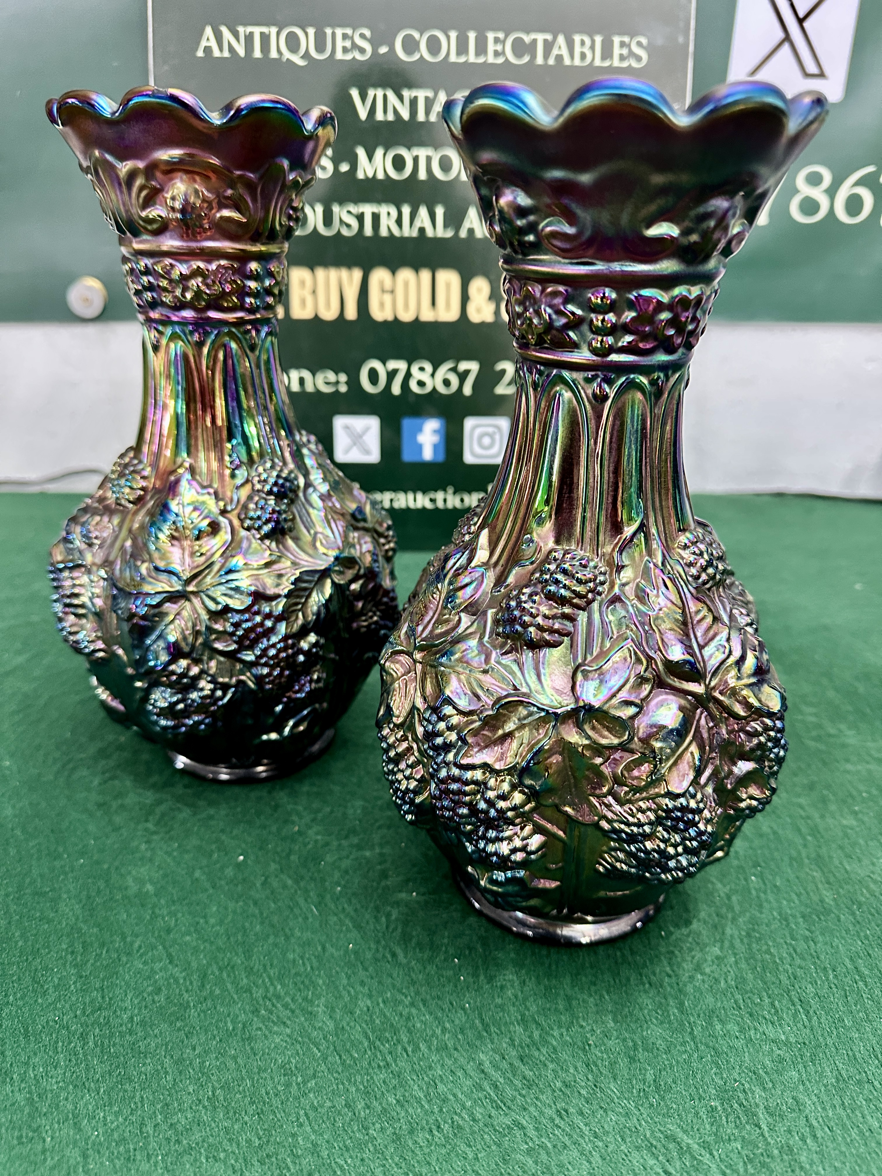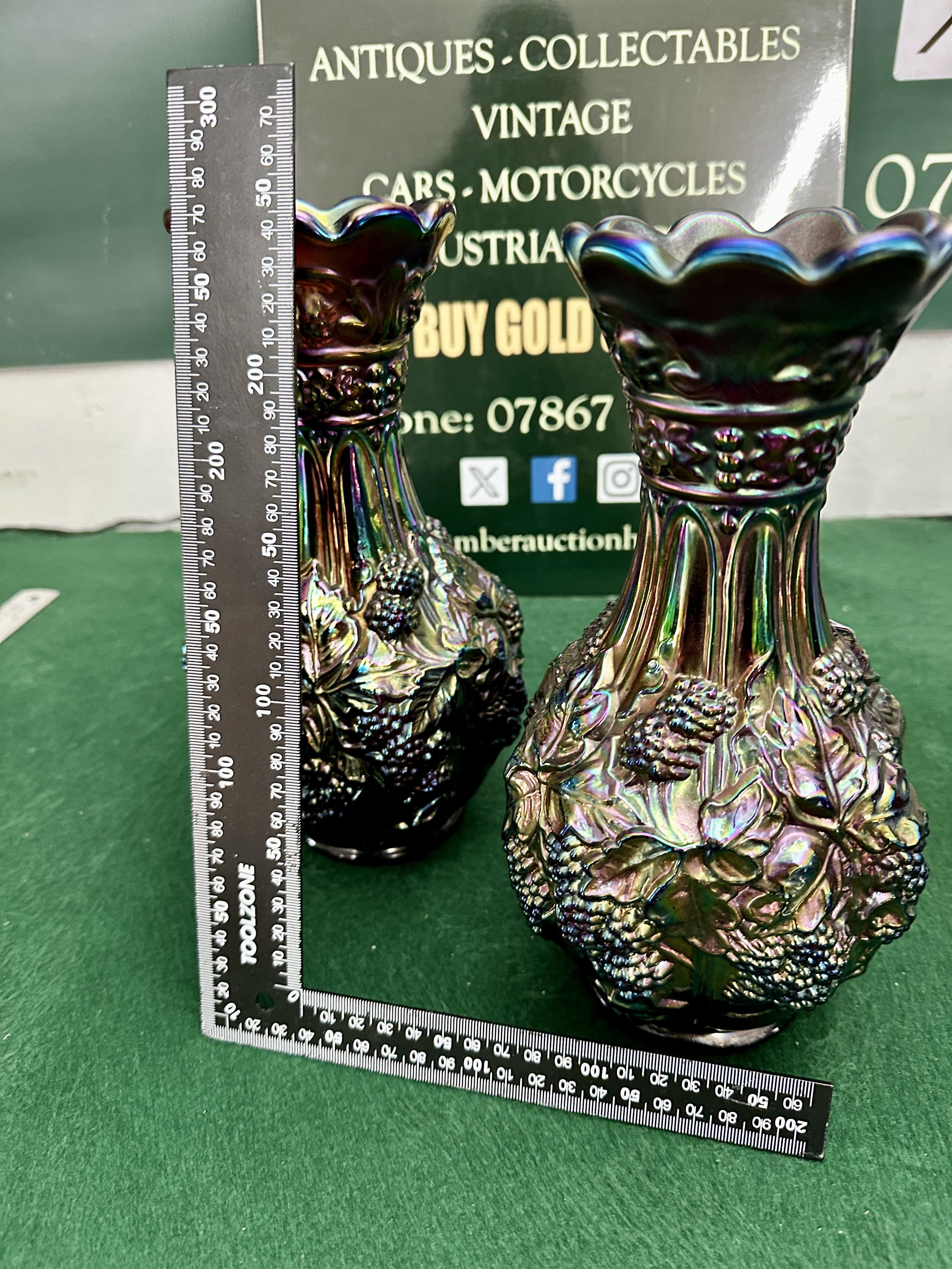 Attributed to the Imperial Glass Company, this pair of carnival glass vases is executed in the Loganberry pattern. The vases are constructed from deep amethyst pressed glass with a vibrant iridescent surface finish displaying a spectrum of purple, emerald green, and blue tones. The bulbous body of each vase is decorated in high relief with clusters of fruit and vine leaves. The neck features vertical ribbing and a decorative foliate band situated below a ruffled, scalloped rim. The items are produced using a pressed or moulded glass technique, resulting in sharp, repetitive relief details. No maker marks are visible on the body or neck of the pieces.