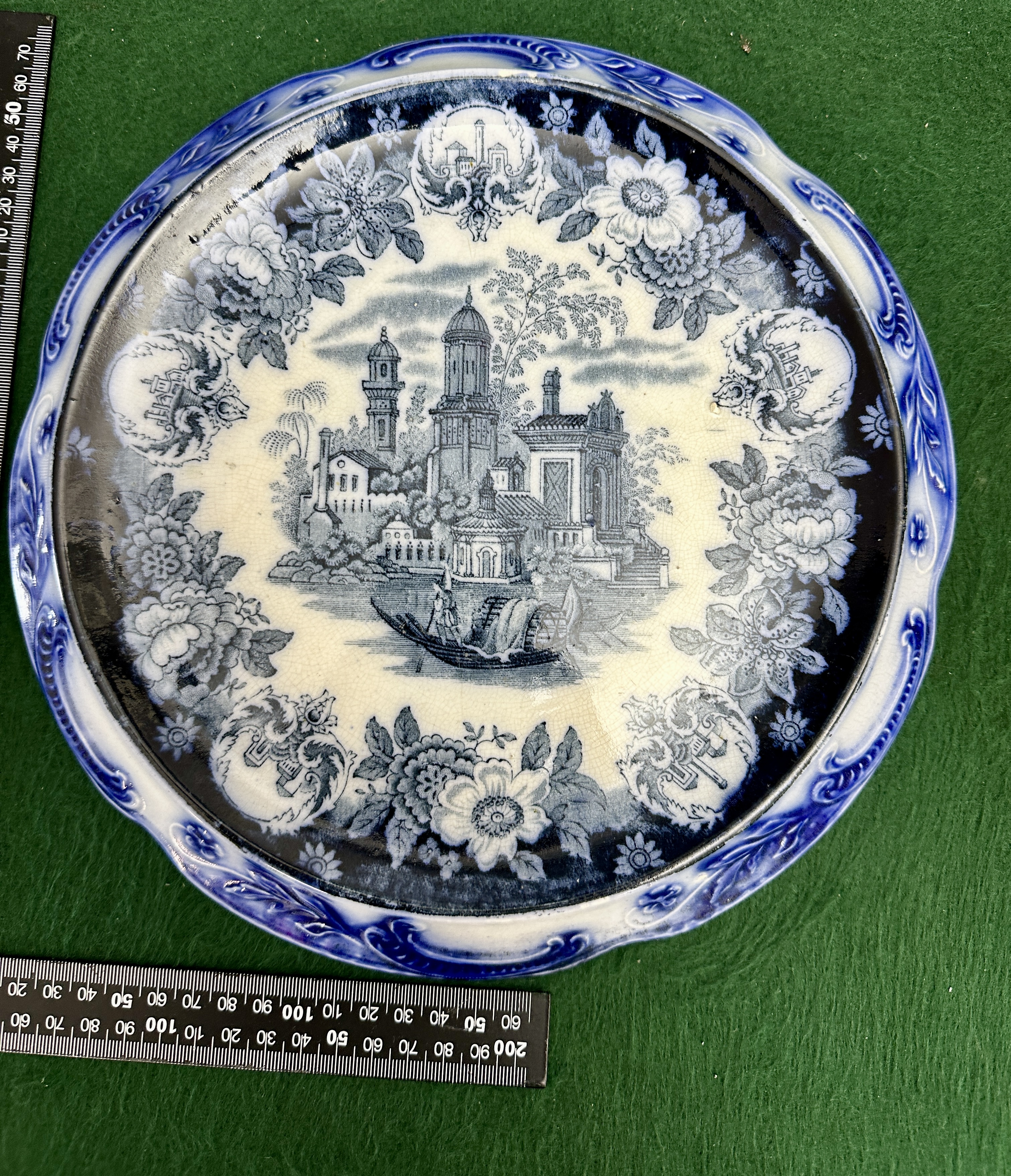 A Victorian earthenware plate of circular form featuring a scalloped and moulded rim. The piece is decorated in the flow blue transfer-printed style. The central composition depicts a romanticised Italianate landscape with classical buildings, domed towers, and a gondola-style boat on a body of water. The wide border is composed of dense floral arrangements, including roses and other blossoms, interspersed with four small vignettes of architectural scenes. The rim is further detailed with moulded scrollwork and blue feathered accents. The reverse bears a blue printed mark featuring a swan on water above a ribbon scroll containing the pattern name JAPAN. Below the scroll are the initials T.R and Co, with a further letter T below and a printed letter F to the left. This mark identifies the manufacturer as Thomas Rathbone and Co, who operated the Portobello Pottery near Edinburgh, Scotland.