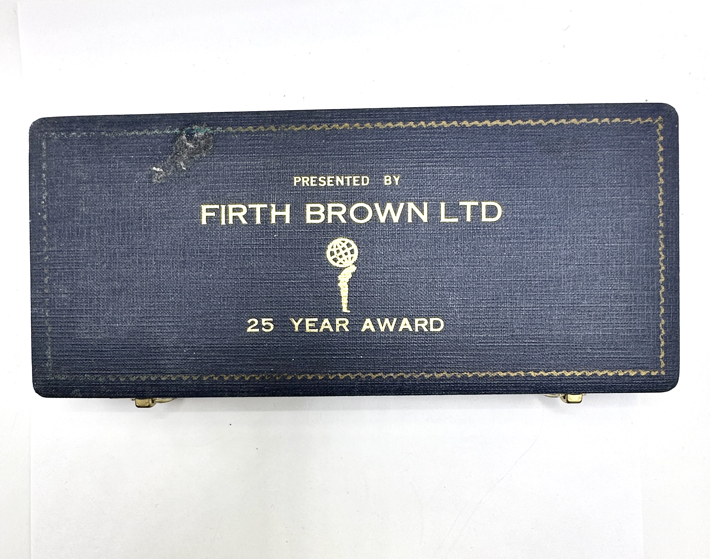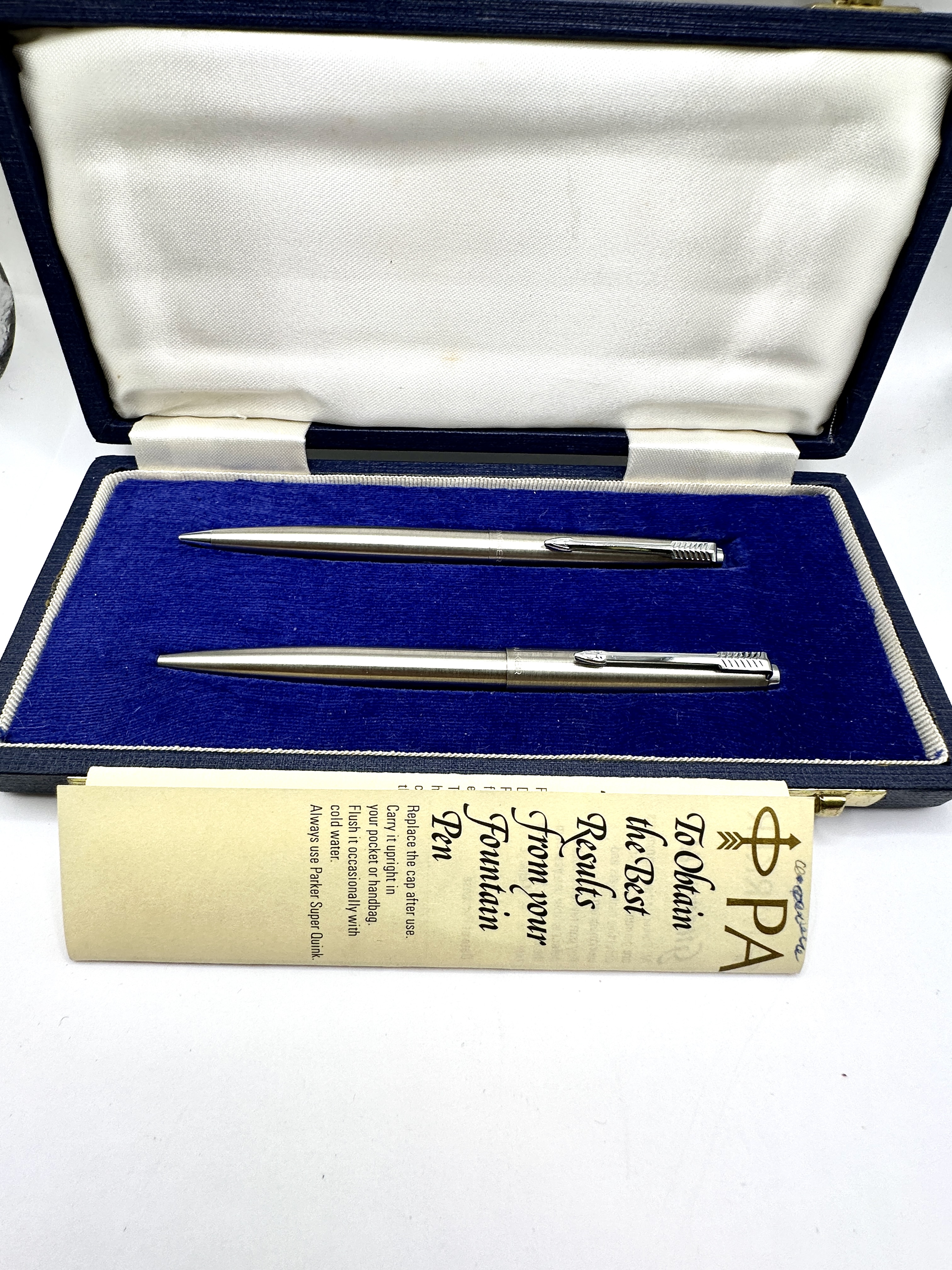 A pair of Parker 45 Flighter writing instruments comprising a fountain pen and a ballpoint pen. Both pieces are constructed with brushed stainless steel barrels and caps, a finish known as the Flighter, and feature chrome-plated arrow clips and trim. The fountain pen is fitted with a semi-hooded nib and utilizes a standard Parker cartridge or converter filling system. The ballpoint pen employs a cap-actuated advance and retract mechanism. Both instruments are incised with the letters P A R K E R on the cap bands. The set is housed in its original blue textured presentation box, the lid of which is gilt-printed with a corporate long-service award inscription for the Sheffield-based manufacturer Firth Brown Ltd. The inscription reads Presented by Firth Brown Ltd / 25 Year Award and includes the company Atlas logo. The set is accompanied by a Parker instruction leaflet.