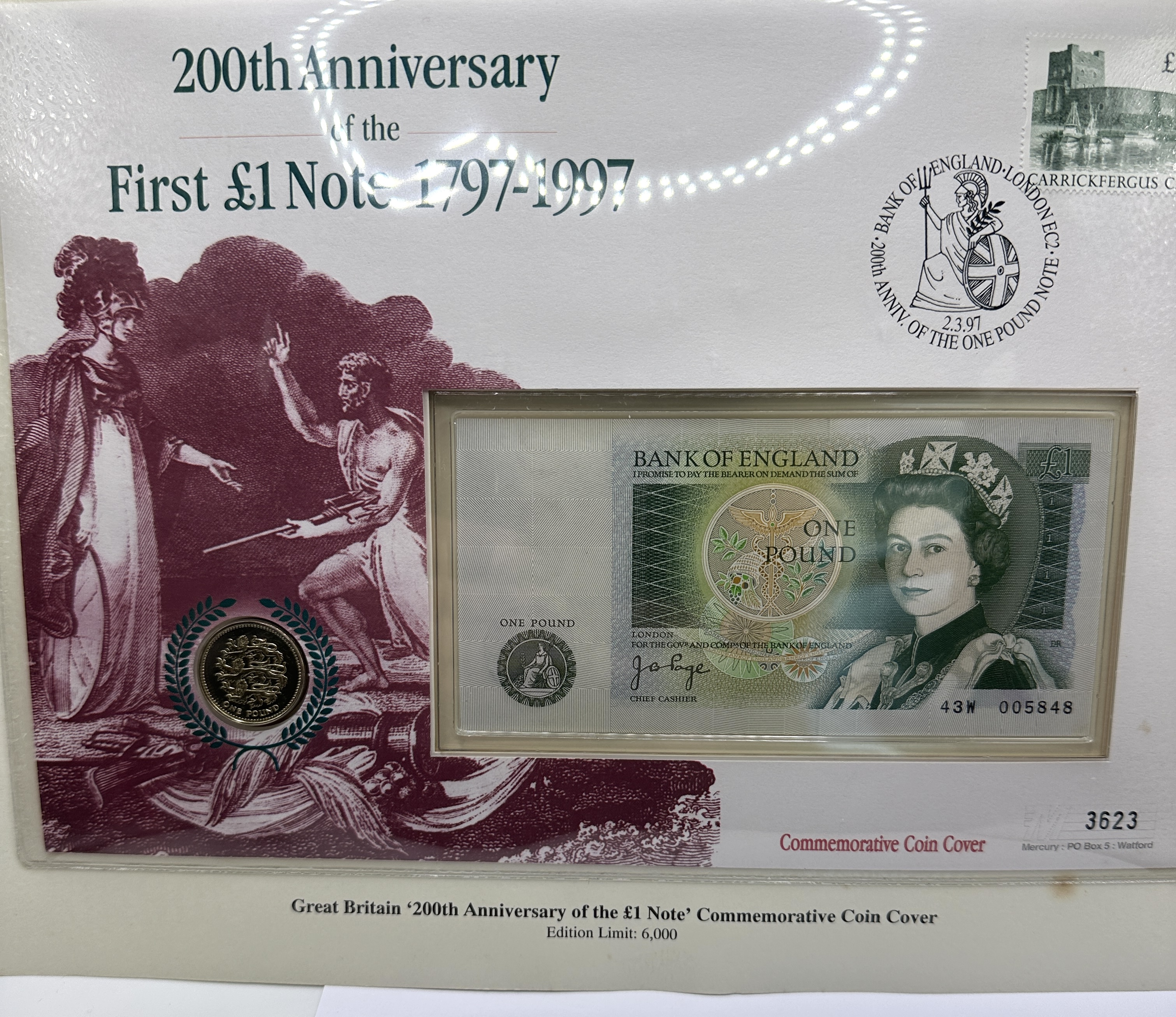 A pair of numismatic items comprising a Bank of England Series D one-pound banknote and a 1997 United Kingdom one-pound coin, presented in a commemorative philatelic-numismatic cover (PNC). The banknote features the signature of Chief Cashier J. B. Page and bears the serial number 43W 005848. The coin is struck in nickel-brass with the three lions passant guardant reverse. The cover is franked with a Carrickfergus Castle postage stamp and a special commemorative postmark from Bank of England – London EC2 dated 2 March 1997. This presentation folder is hand-numbered 3623 from a stated edition limit of 6,000.