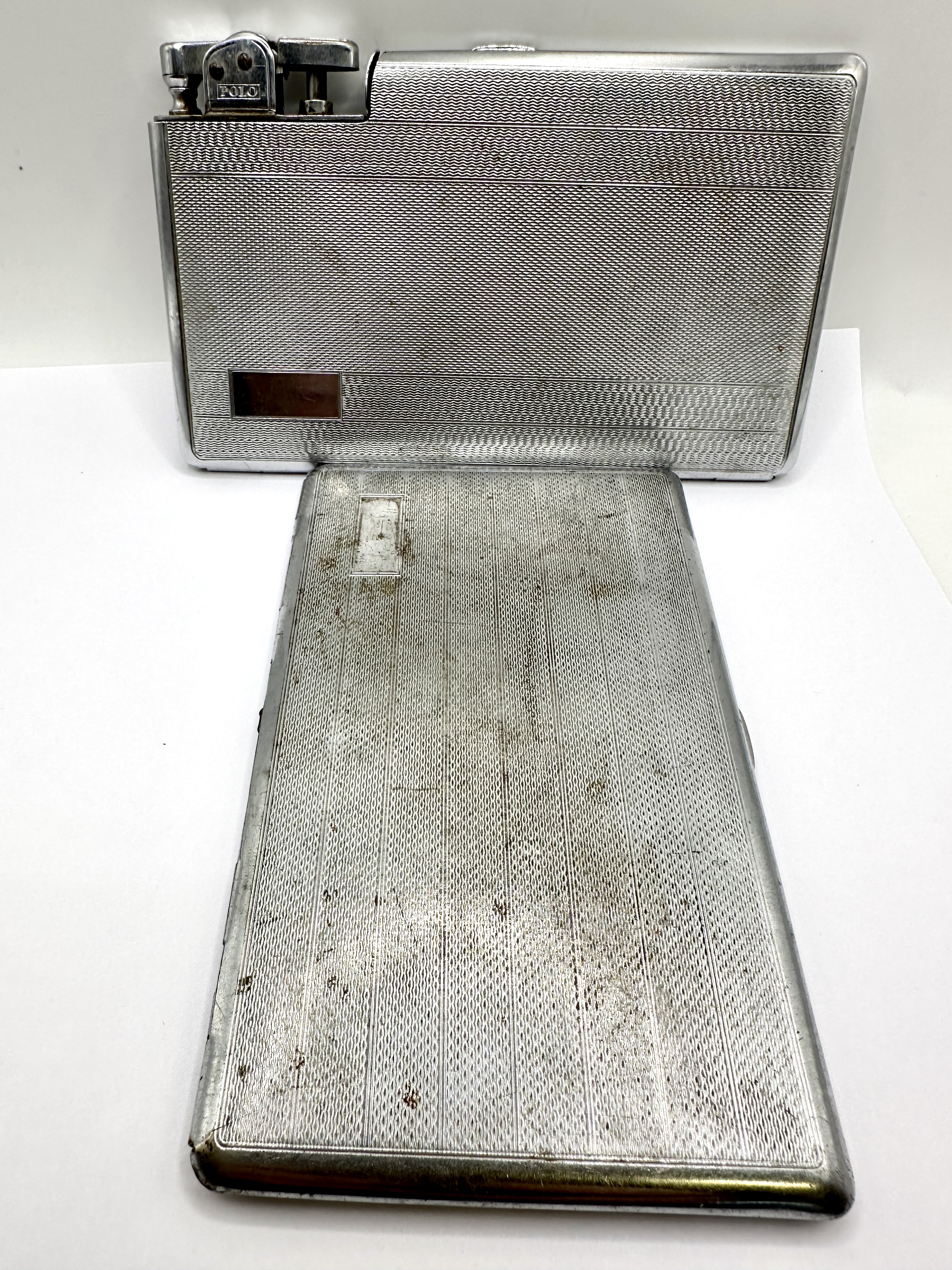 The Polo case is in generally good vintage condition with light surface scratching and minor wear to the plating. The interior has significant handwritten ink inscriptions. The lighter mechanism is complete with flint wheel and snubber but remains untested for functionality. The slim case is in poor to fair condition with heavy scratching and significant brassing where the base metal is exposed through the plating, particularly on the reverse and edges. The interior shows spotting and wear.