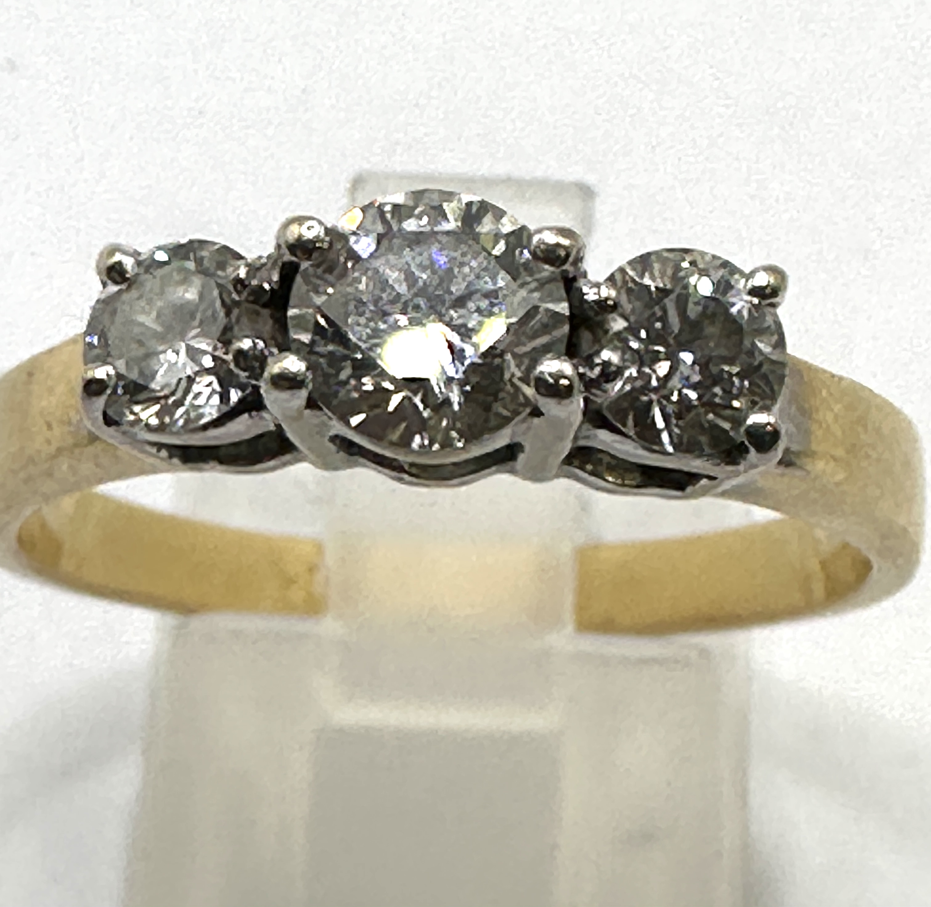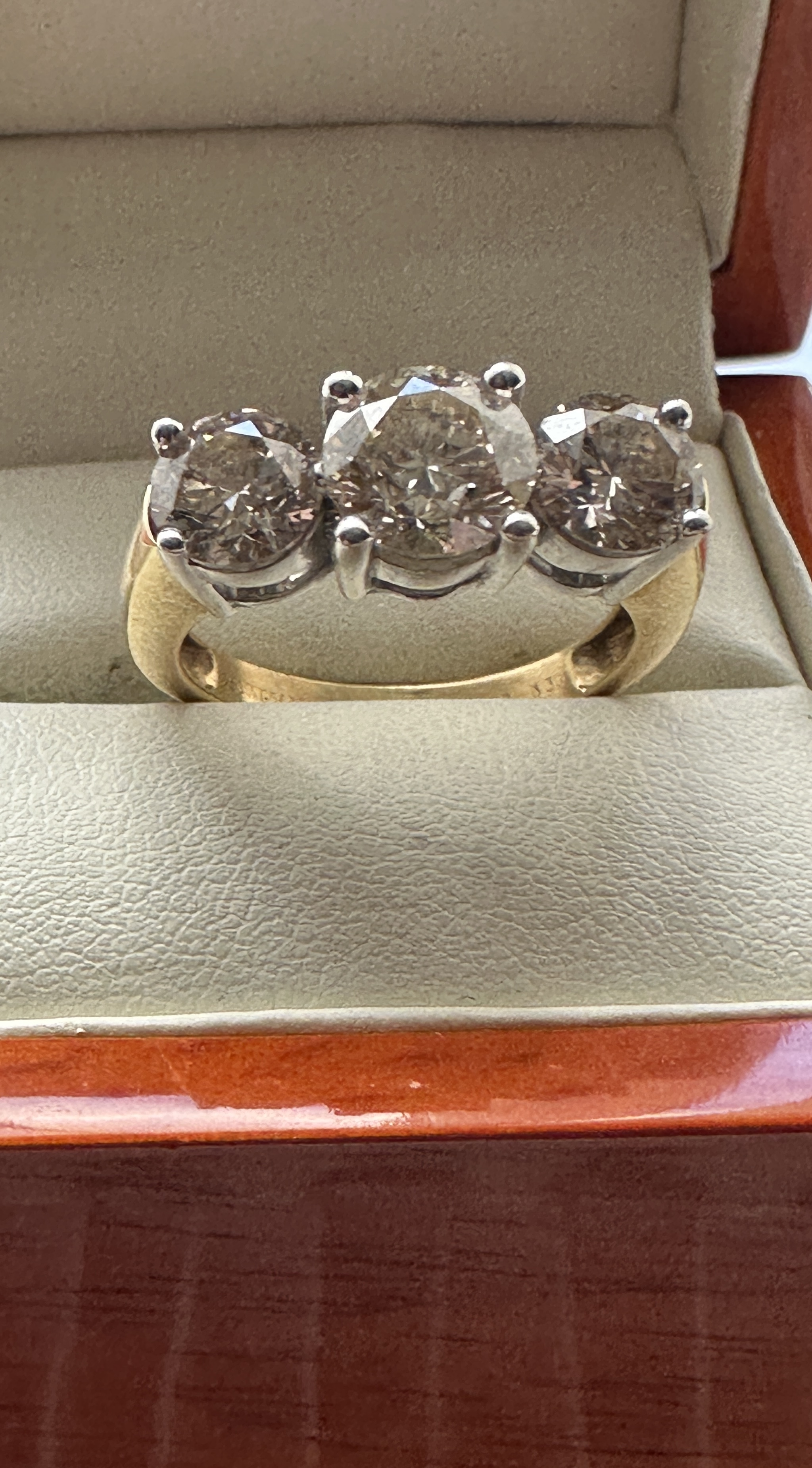 An 18 carat yellow gold trilogy ring set with three diamonds totalling approximately 3.39 carats, accompanied by a certificate of authenticity.