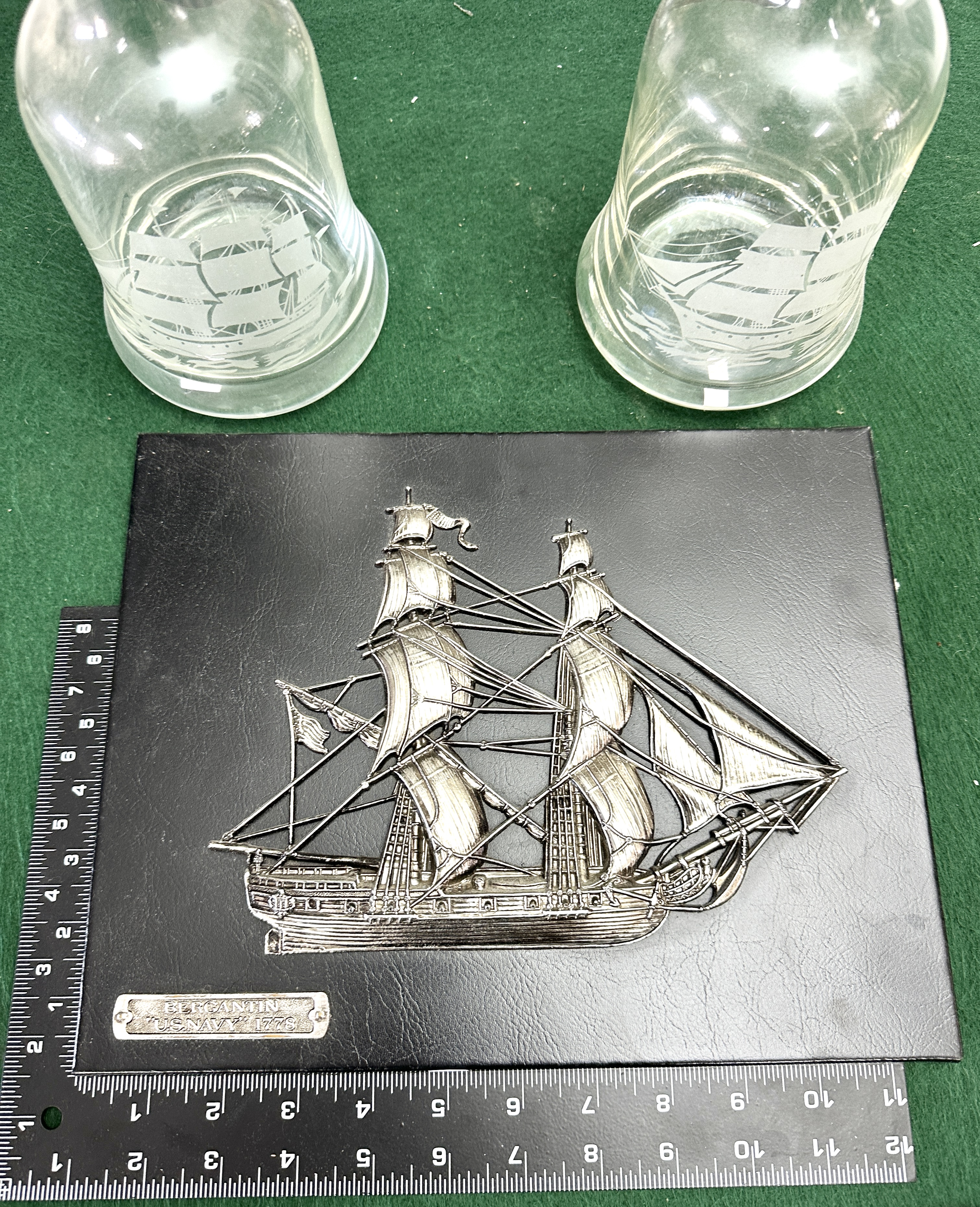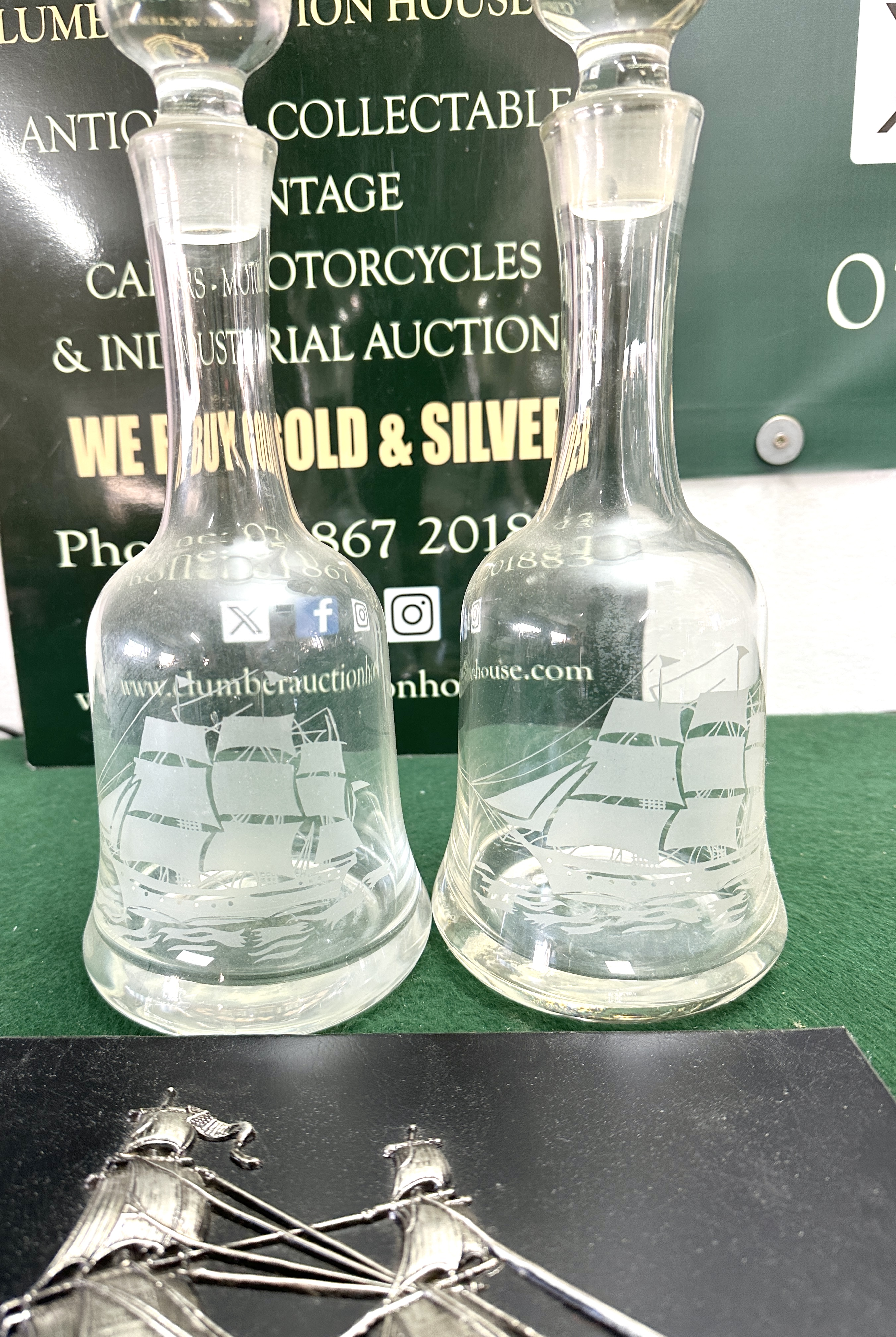 This lot consists of a matching pair of bell-shaped glass decanters and a decorative wall plaque. Each decanter is fashioned from clear glass with a long tapering neck and a wide flared base. The bodies are decorated with an etched or sandblasted image of a three-masted sailing ship upon stylised waves. Both decanters are complete with their original ground-glass stoppers featuring flattened circular grips. The accompanying decorative wall plaque features a detailed metal relief of a two-masted sailing vessel with full rigging, mounted on a rectangular black textured board. A silver-toned label at the bottom left is inscribed with the text Bergantin and US Navy 1775. This lot represents nautical-themed giftware likely produced in the late 20th century.