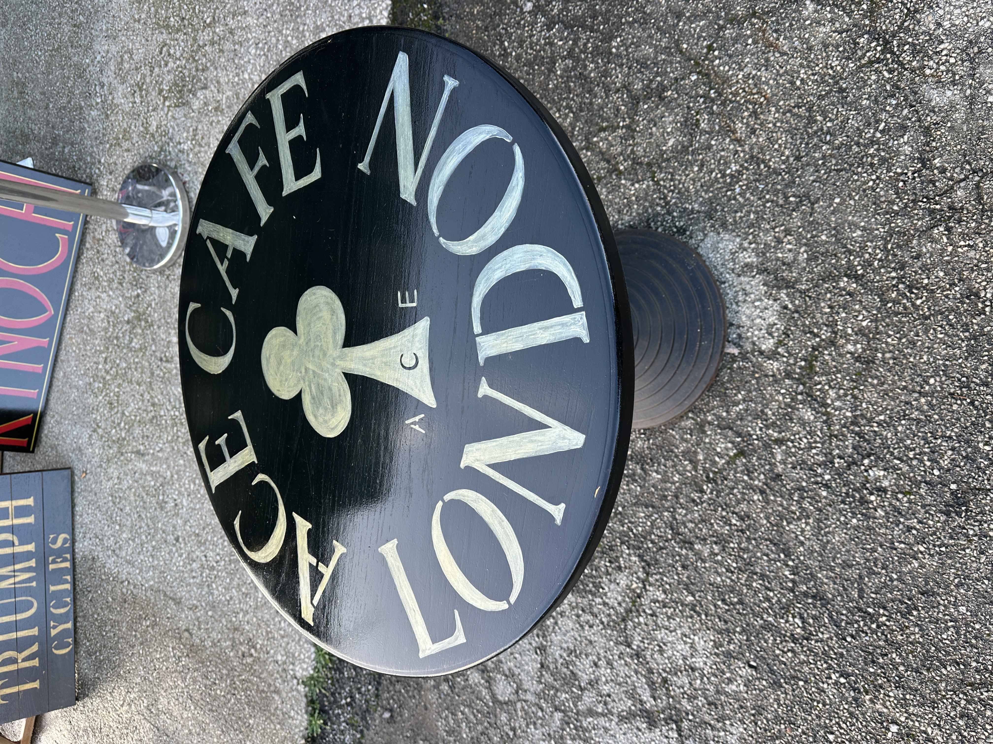 A contemporary circular bistro table featuring the branding of the Ace Cafe London. The tabletop is of circular form, likely constructed from a composite material or wood with a glossy black painted finish. It is decorated with stencilled cream-coloured lettering reading ACE CAFE LONDON around the perimeter and a central club suit graphic containing the vertically aligned letters ACE. The top is mounted on a single dark-finished metal pedestal base, likely cast iron, with a tiered circular foot.